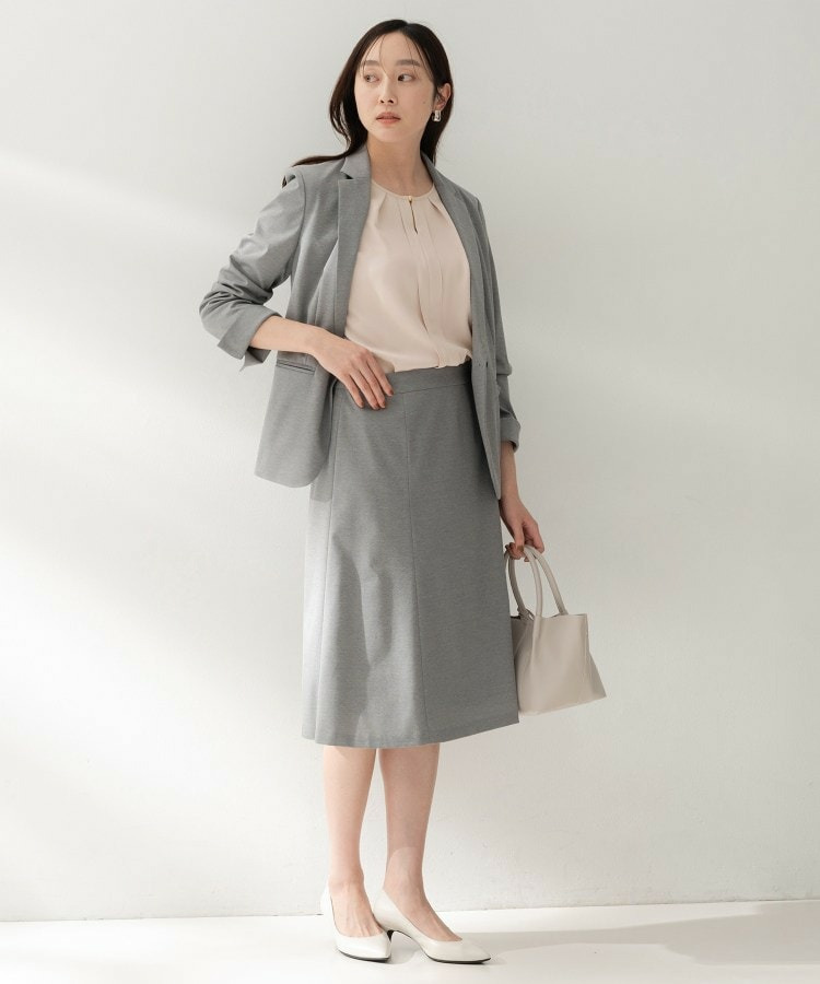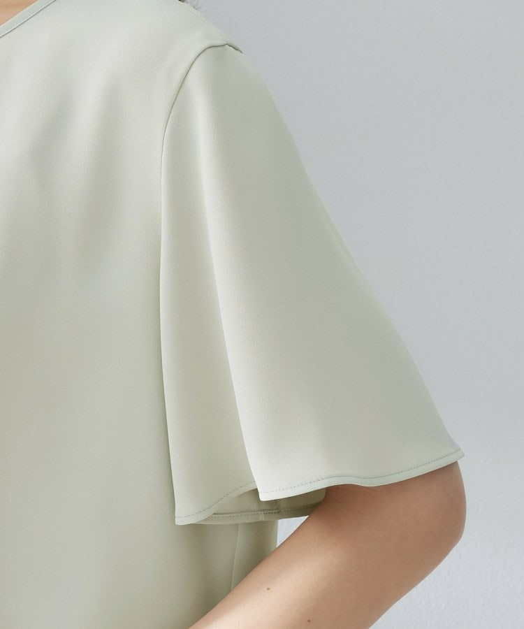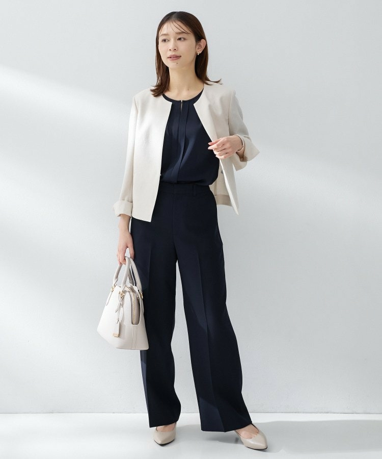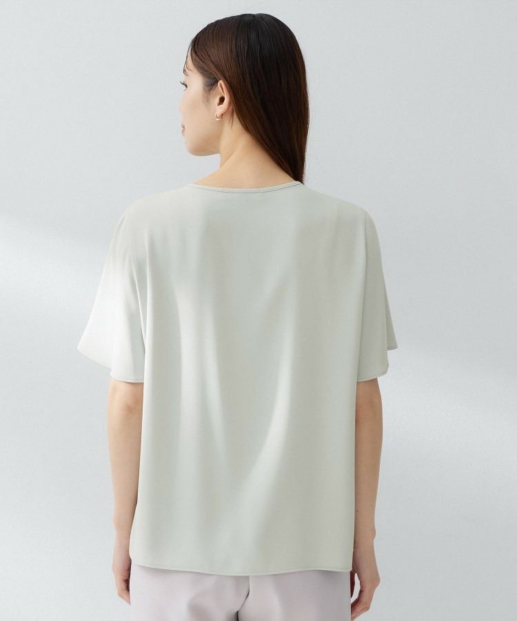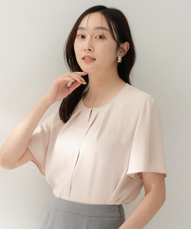 首元はシンプルなラウンドネックで、顔まわりをすっきりと見せます。