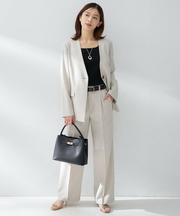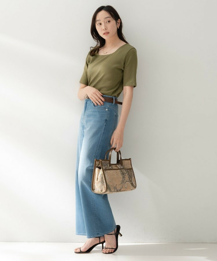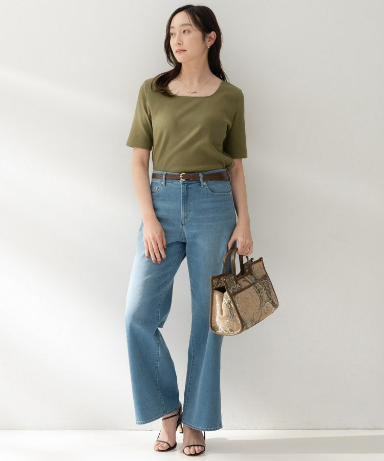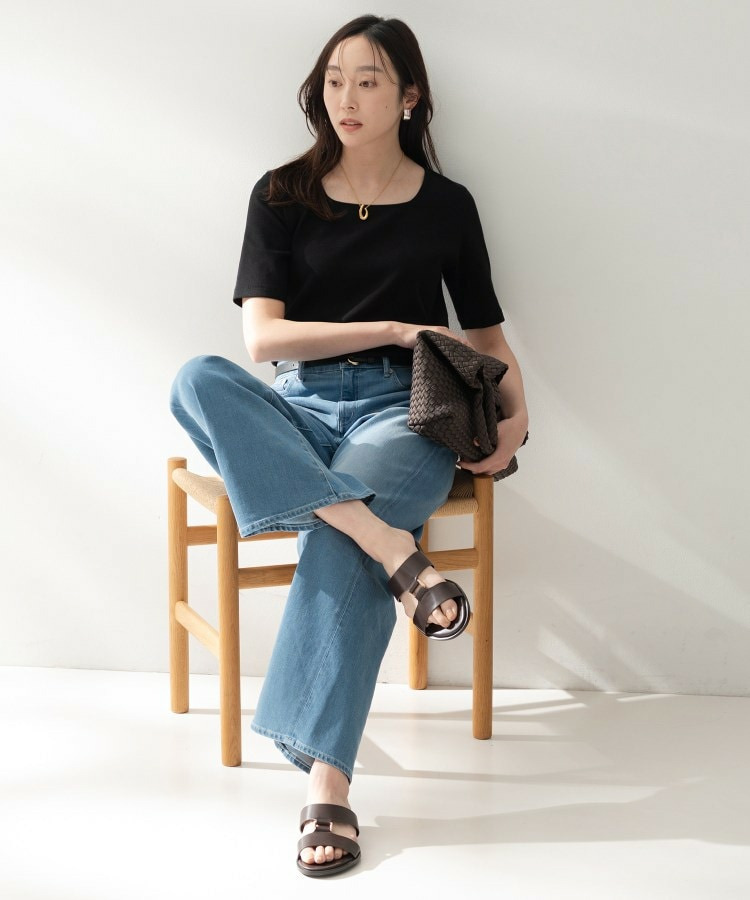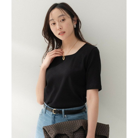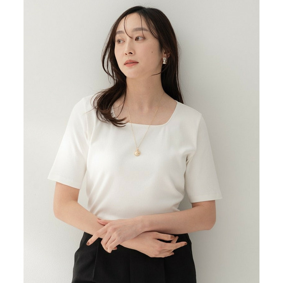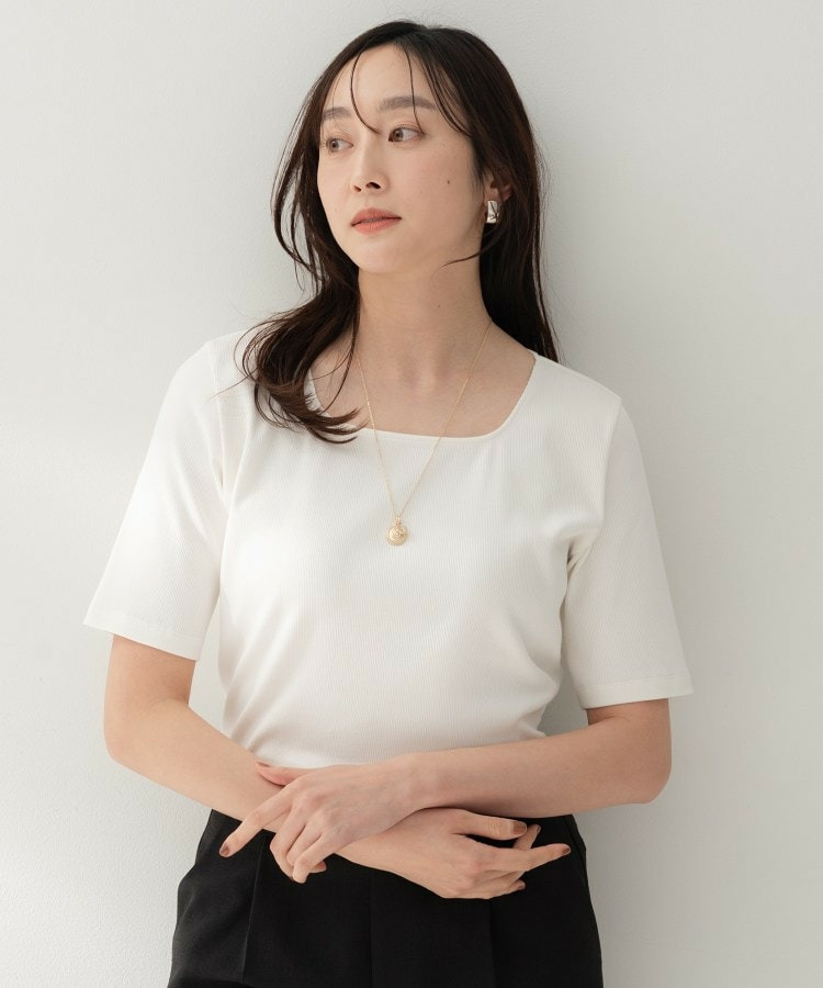 デコルテを美しく見せるスクエアネックは、女性らしさを際立たせつつも知的なムードを演出します。