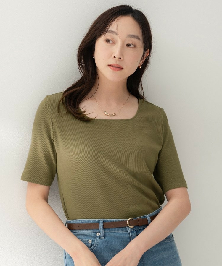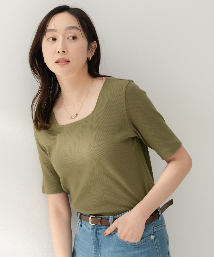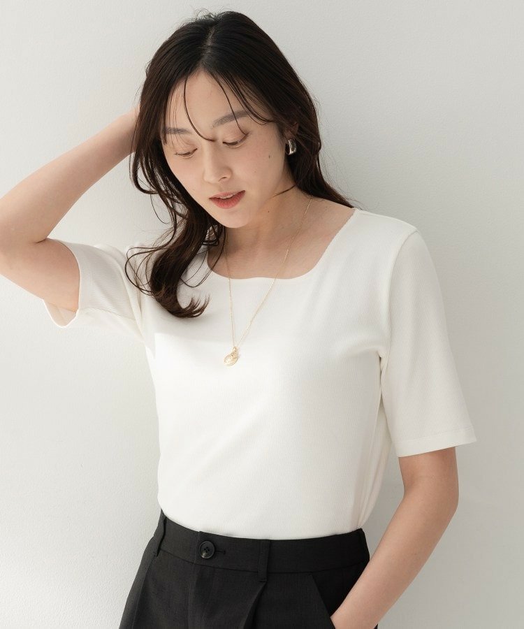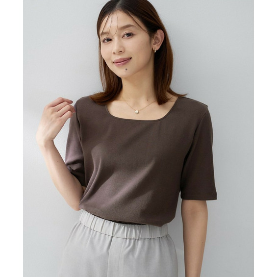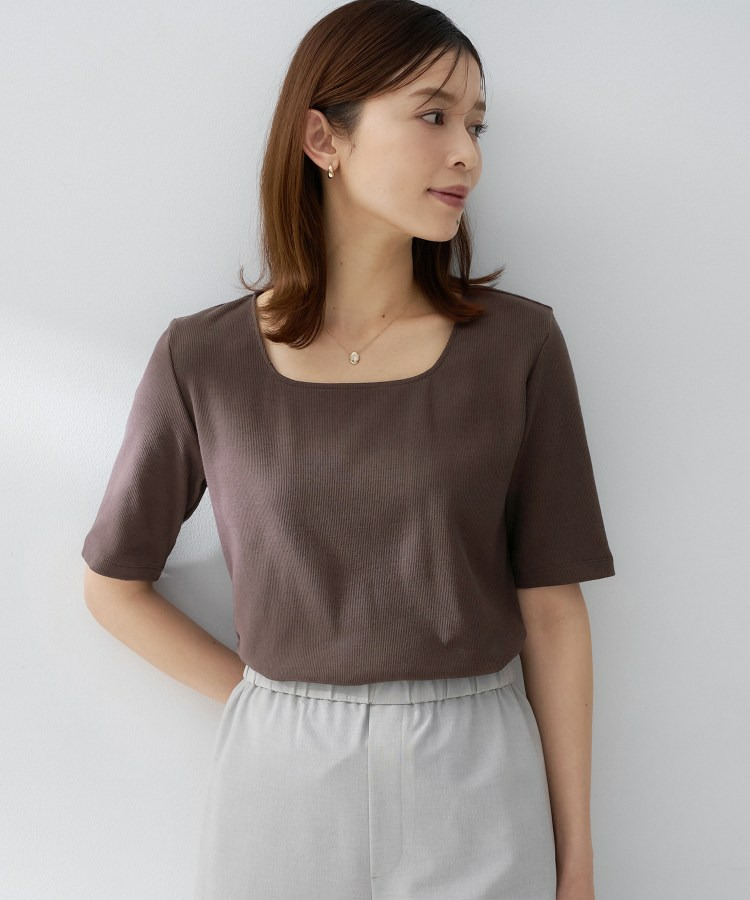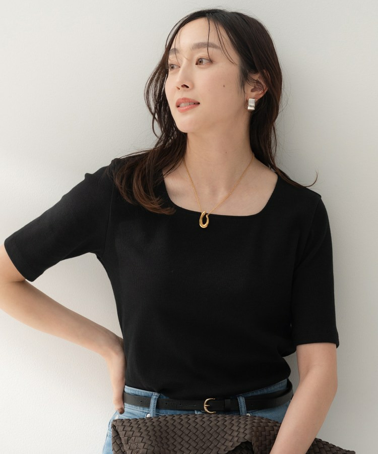 洗練された印象を持つスクエアネックと上品な五分袖が特徴的なトップス。