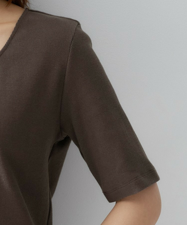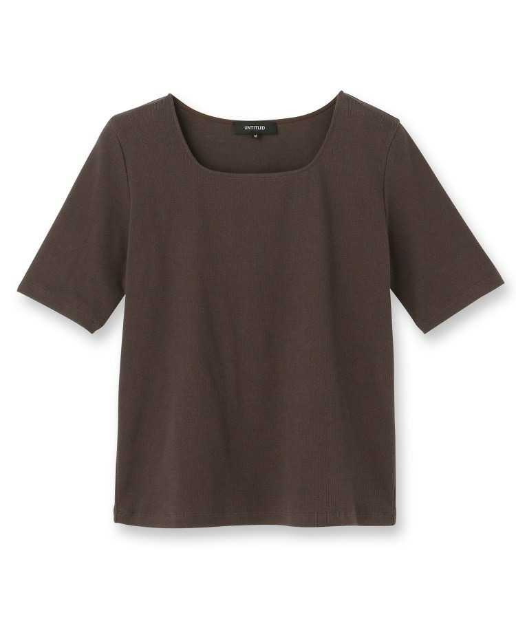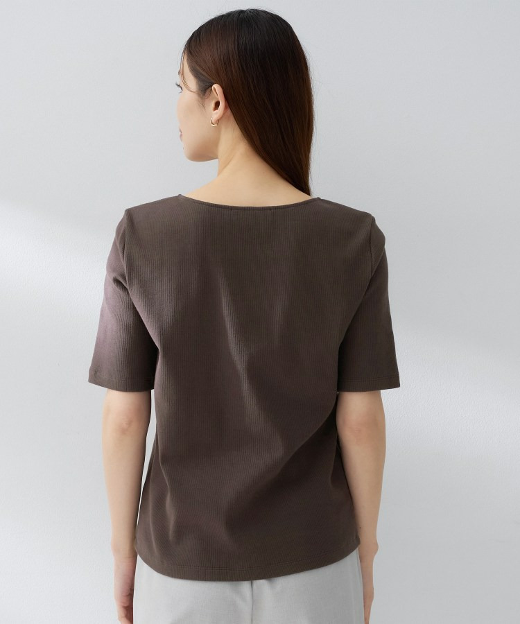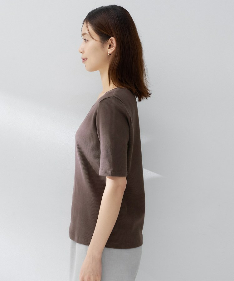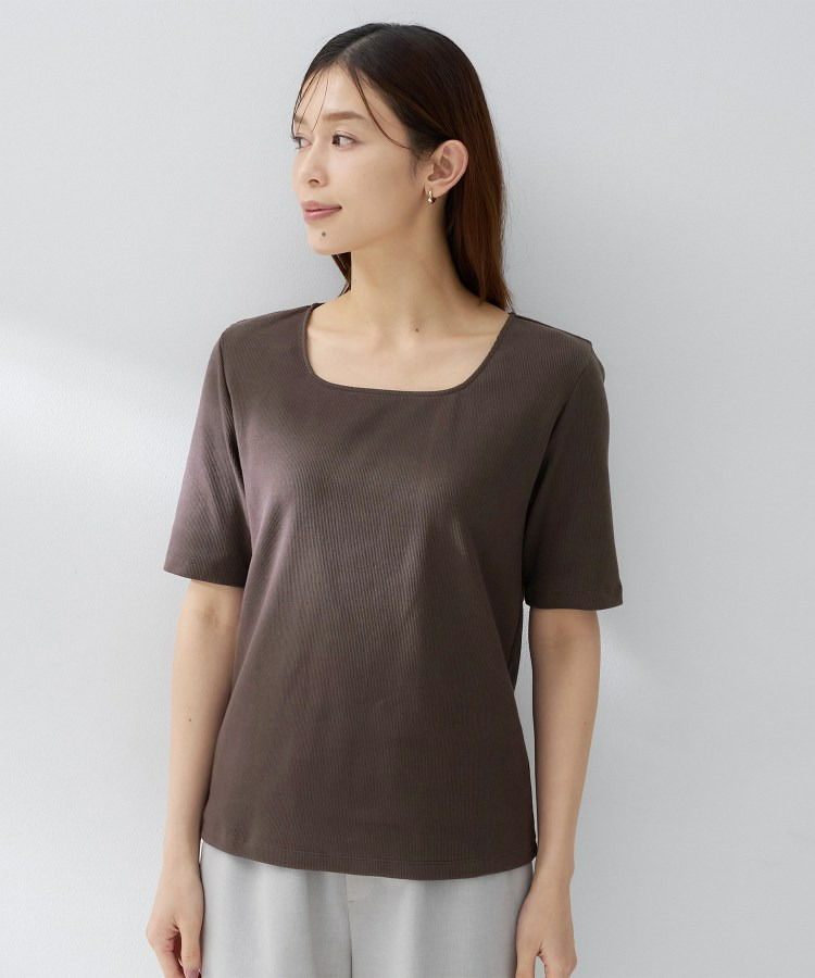 洗練された印象を持つスクエアネックと上品な五分袖が特徴的なトップス。