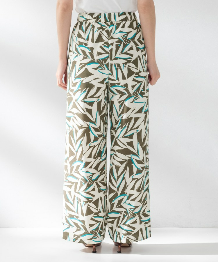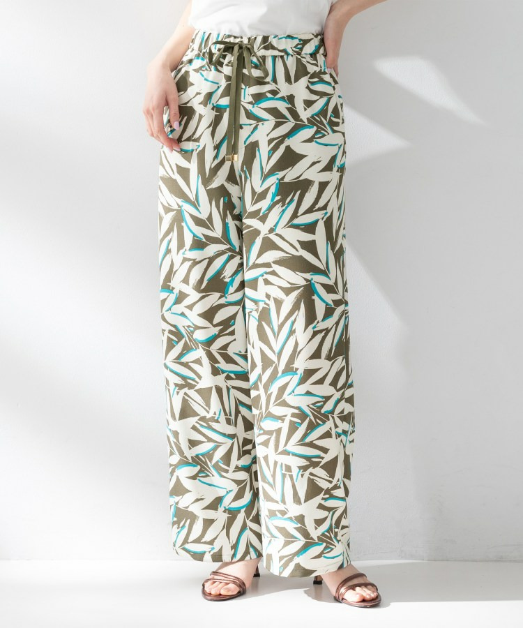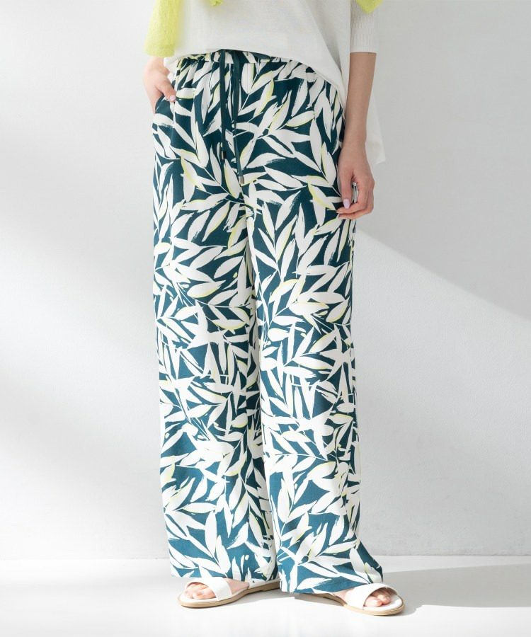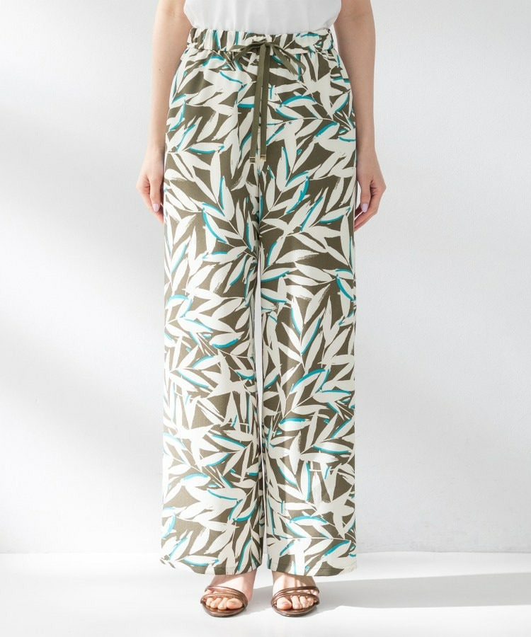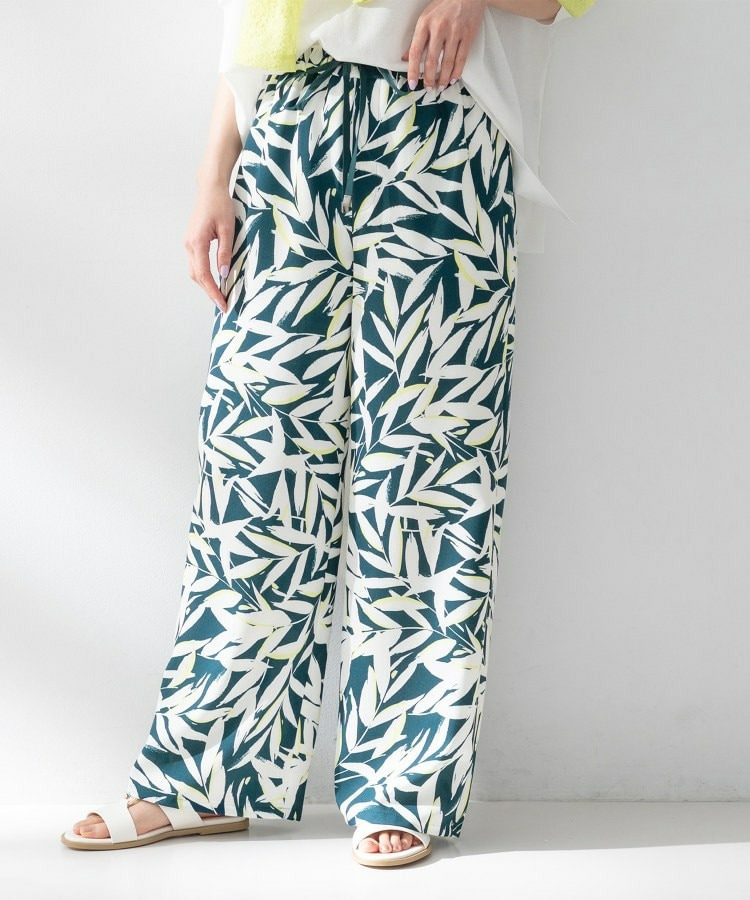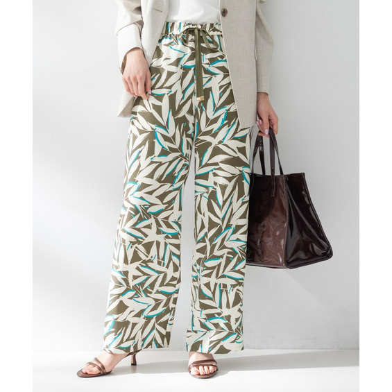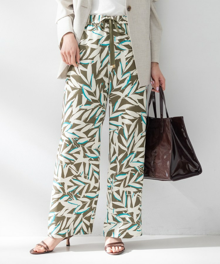 リラクシーさと洗練を兼ね備えたボタニカルリーフ柄のワイドパンツ。