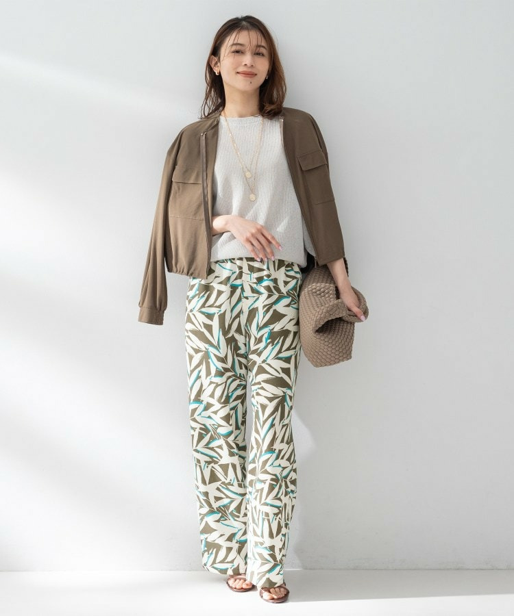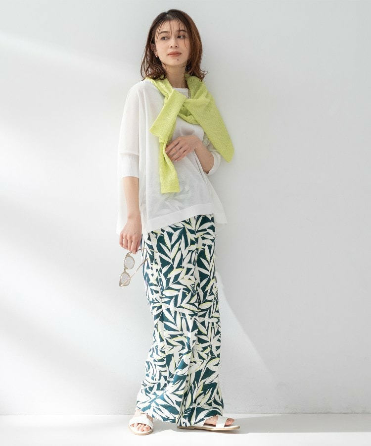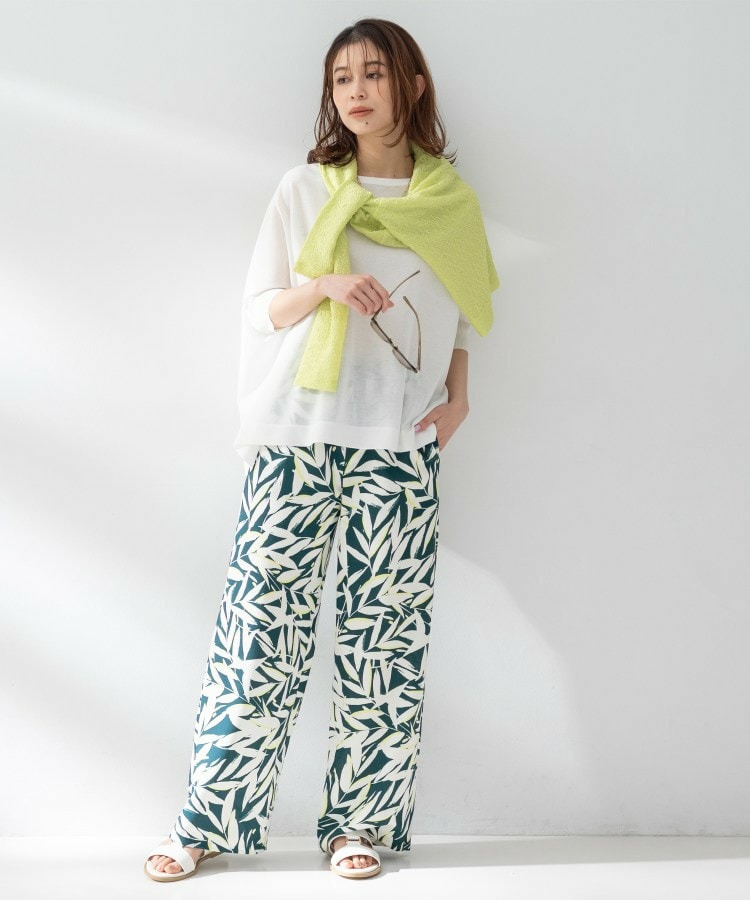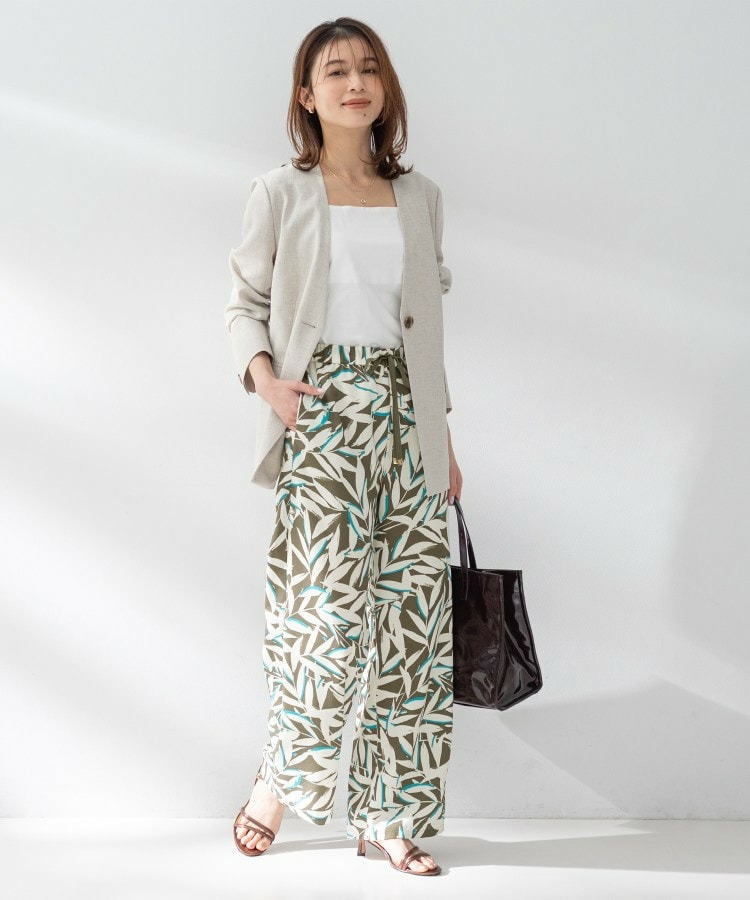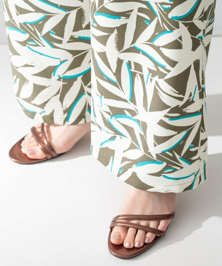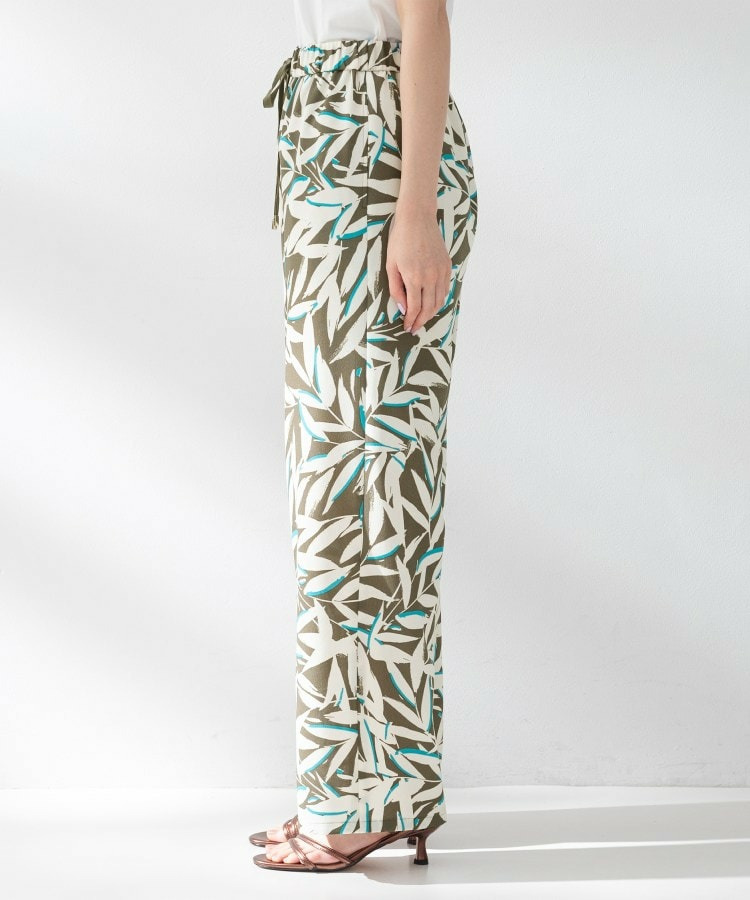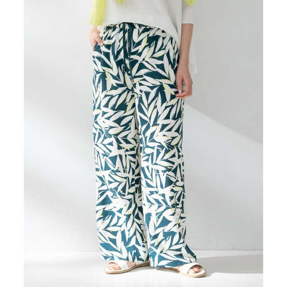 リラクシーさと洗練を兼ね備えたボタニカルリーフ柄のワイドパンツ。
