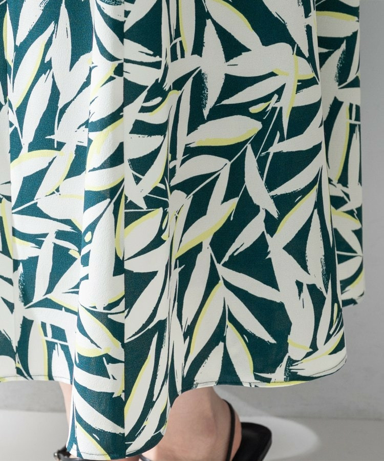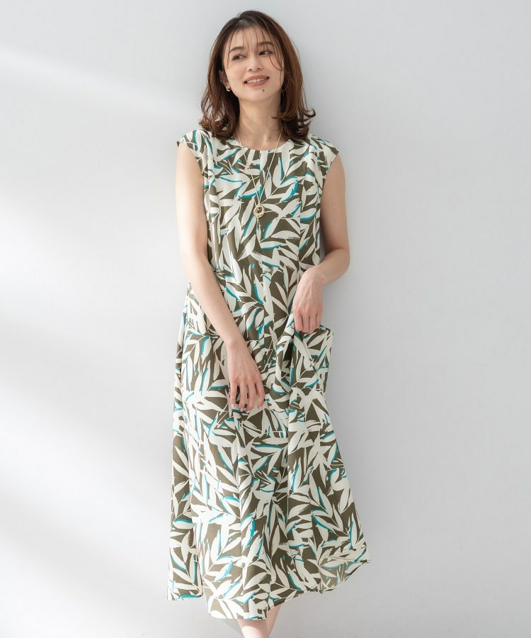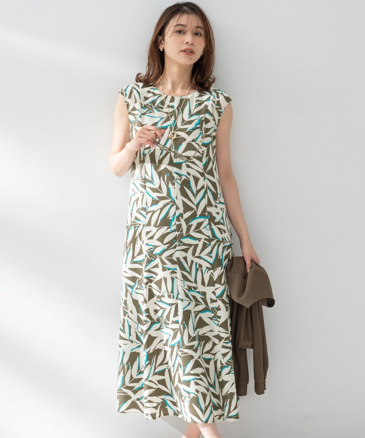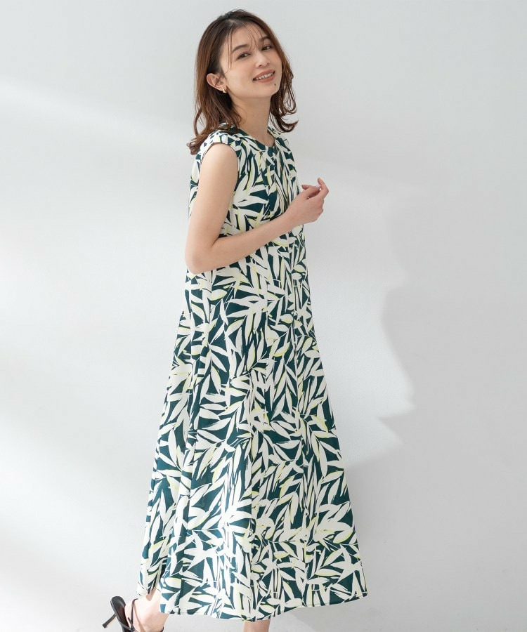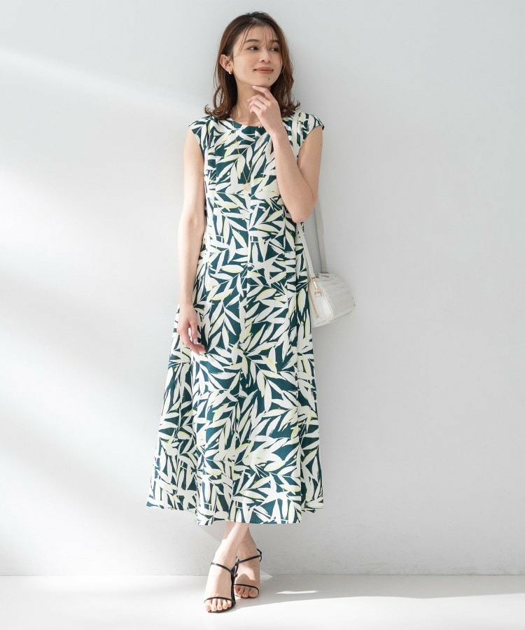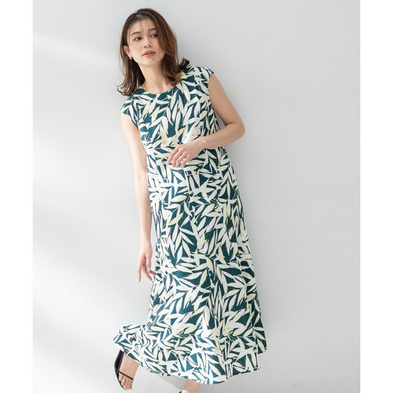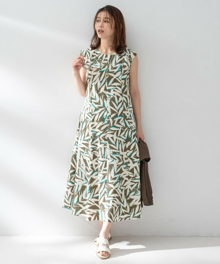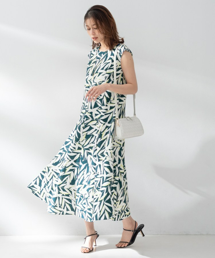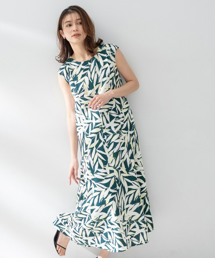 ボタニカルなリーフ柄が施されたロングワンピースは、フェミニンさとリラクシーさを兼ね備えた一着。