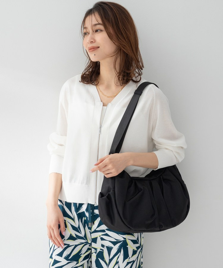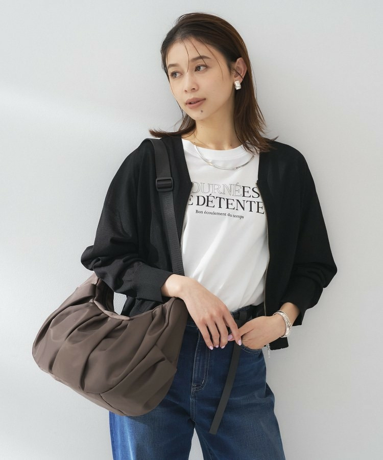ジャケットやワンピースなどきれいめスタイルにも、上品なナイロンの質感が抜け感をプラスします。