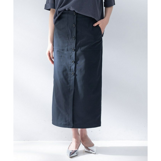 ベイカースカートをデザインベースに、前ボタンデザインとパッチポケットが目を引くナロースカート。