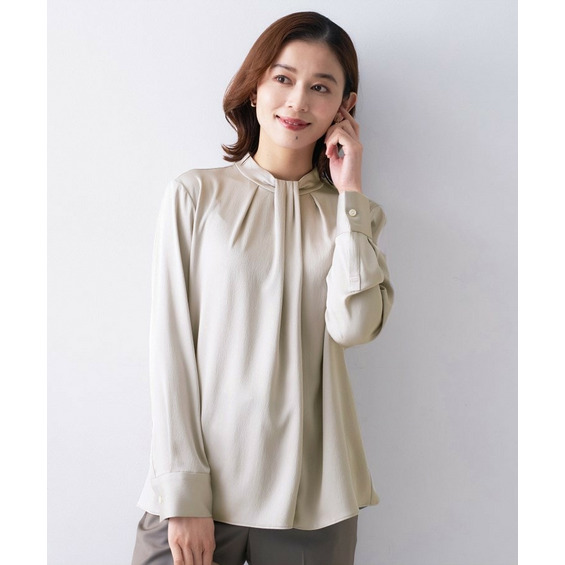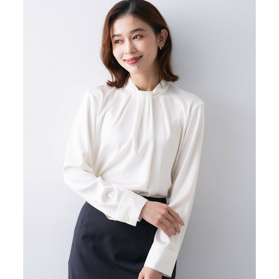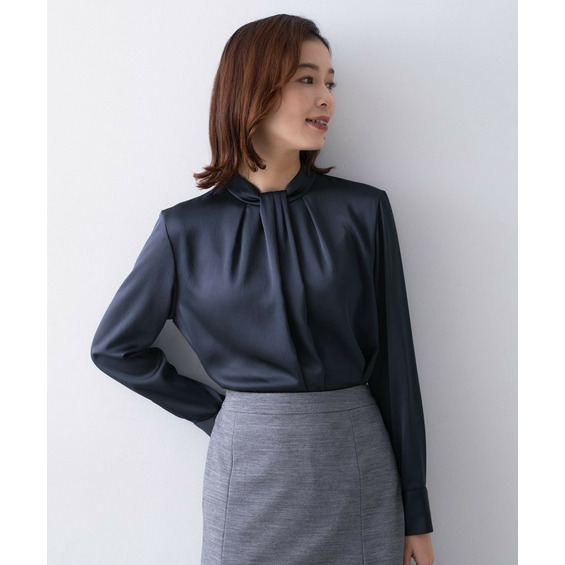 衿のデザインがポイントのサテンブラウスは、衿元からタック使いのドレープが流れるようなデザイン。