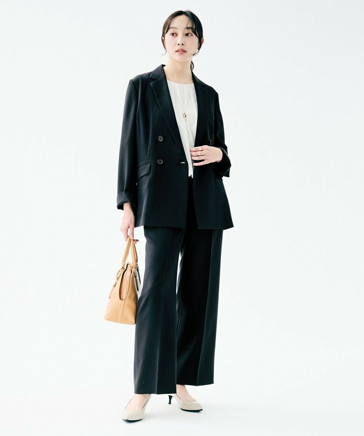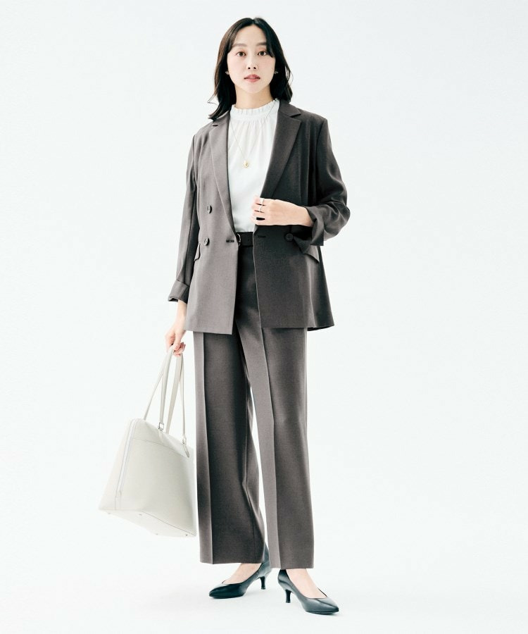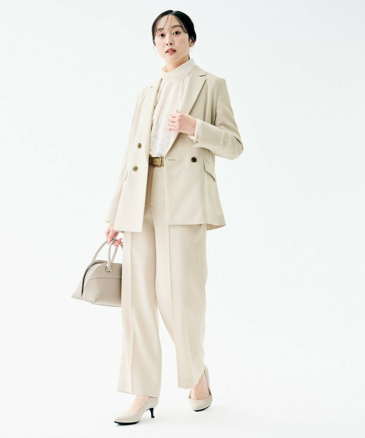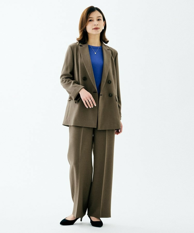 同素材のダブルブレストジャケット(商品番号:153-41035)とのセットアップでの着用がおすすめです。