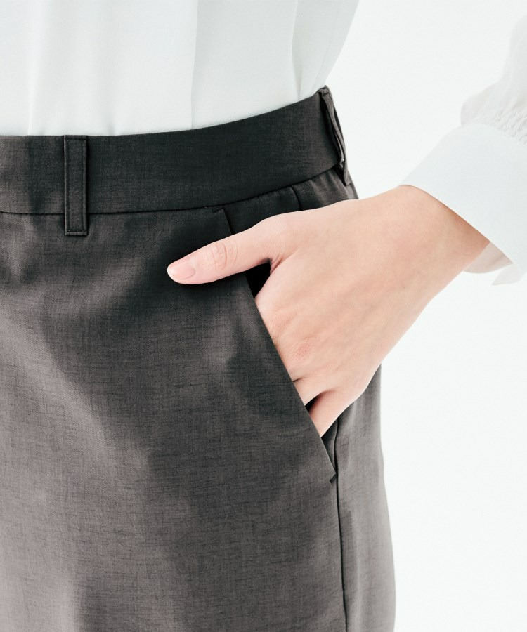 おなか周りにタックが無く、ヒップから裾へすとんと落ちるすっきりとしたシルエット。