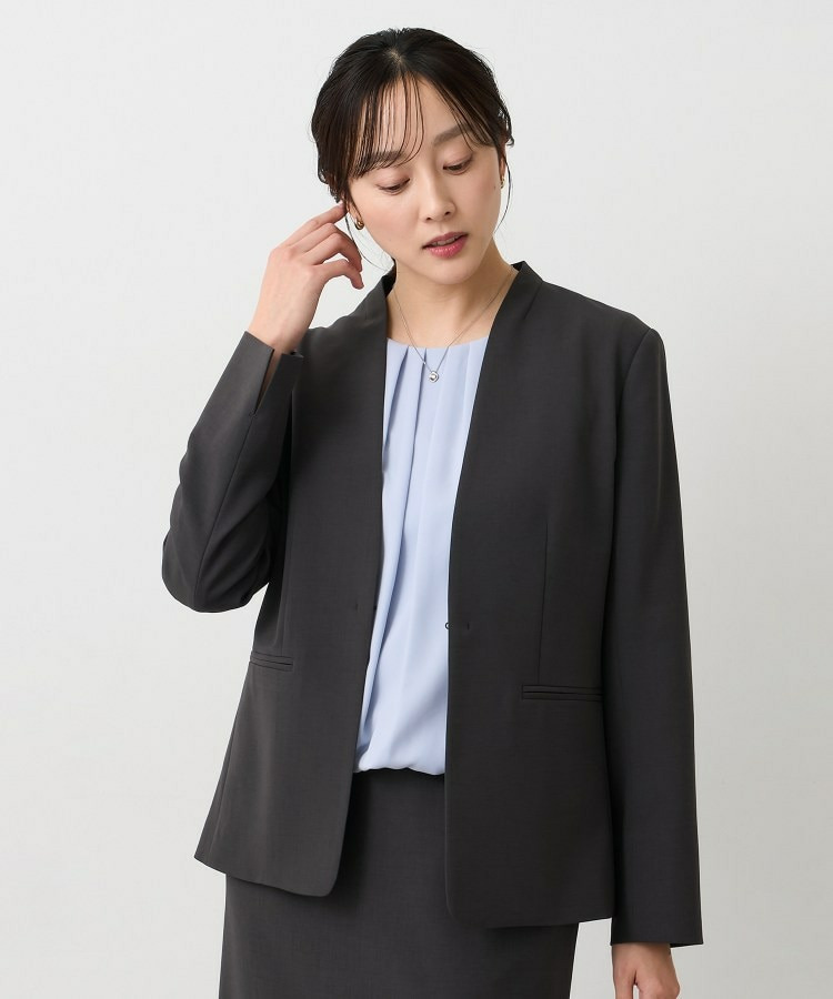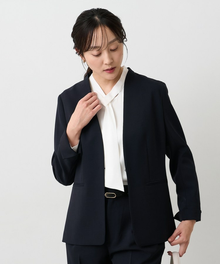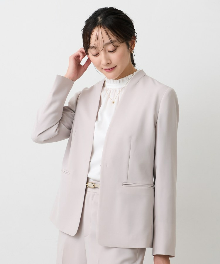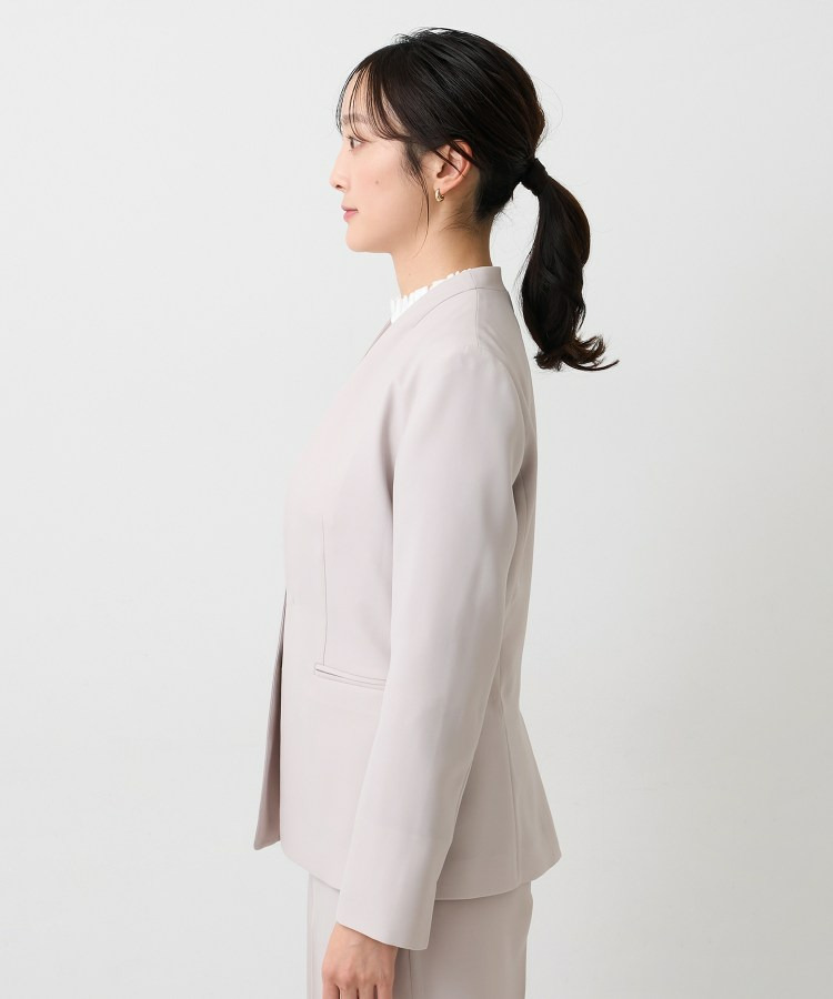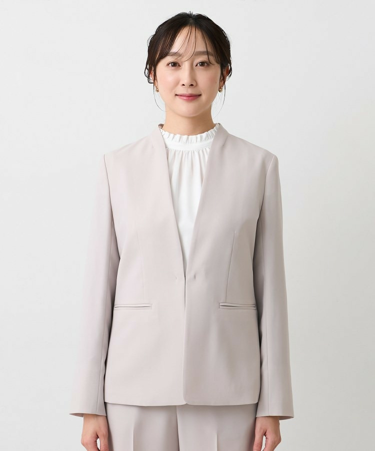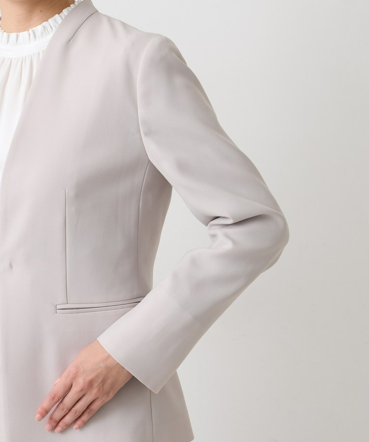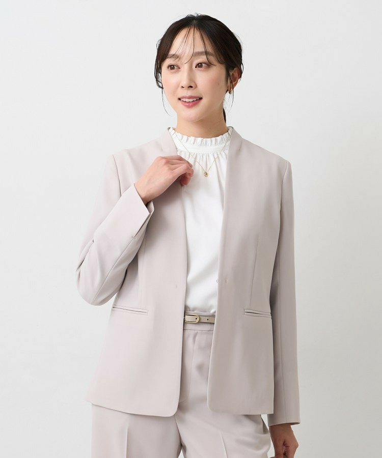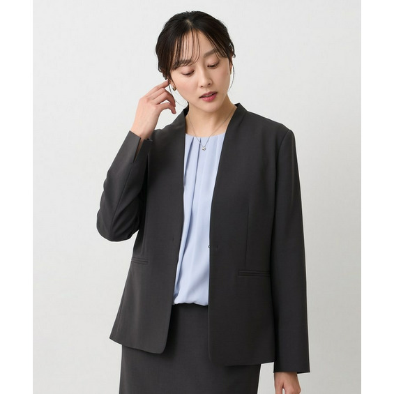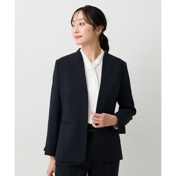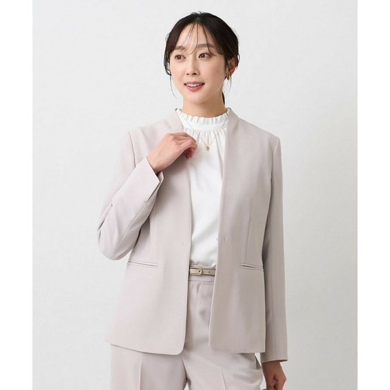 ウエストを程よくシェイプし、女性らしいシルエットを引き立てたカラーレスジャケット。