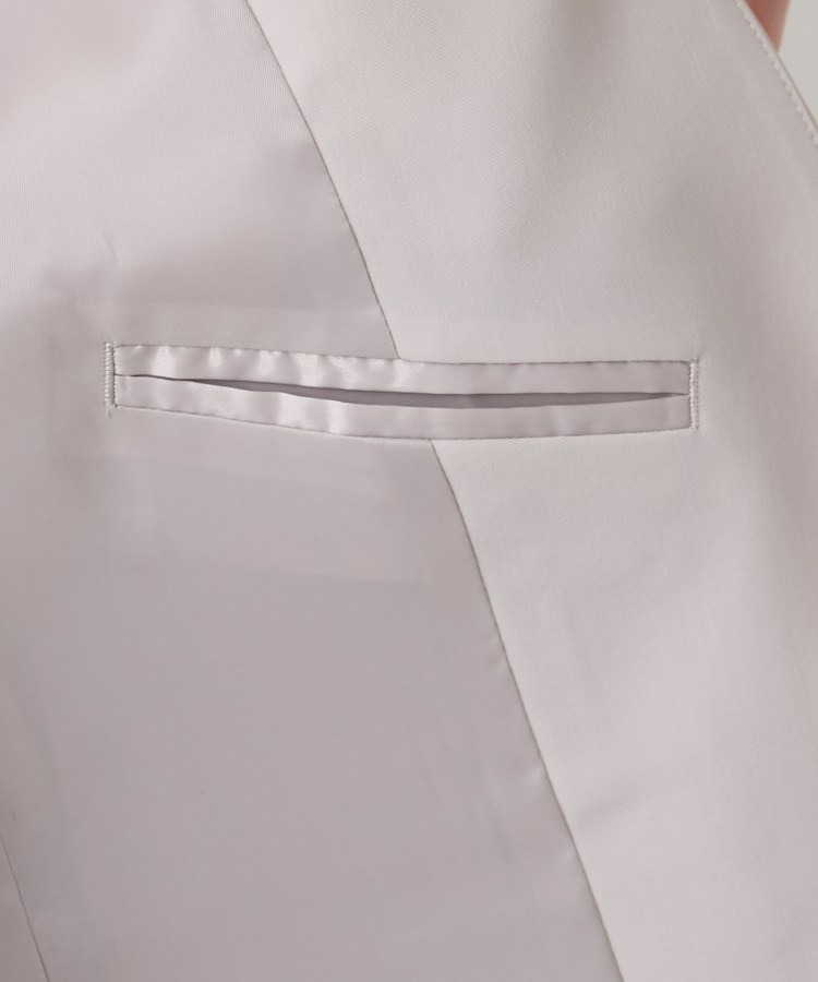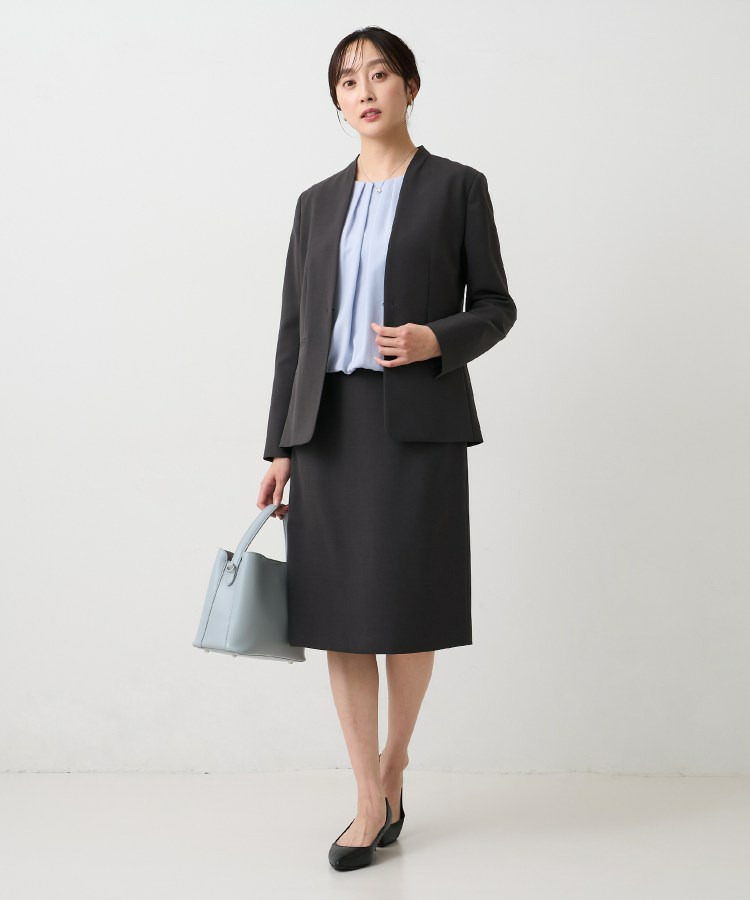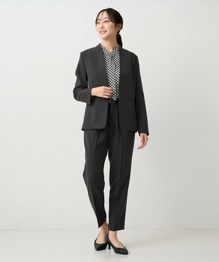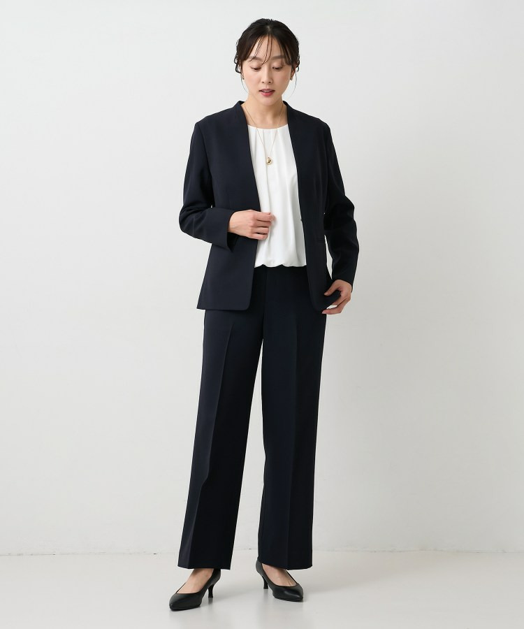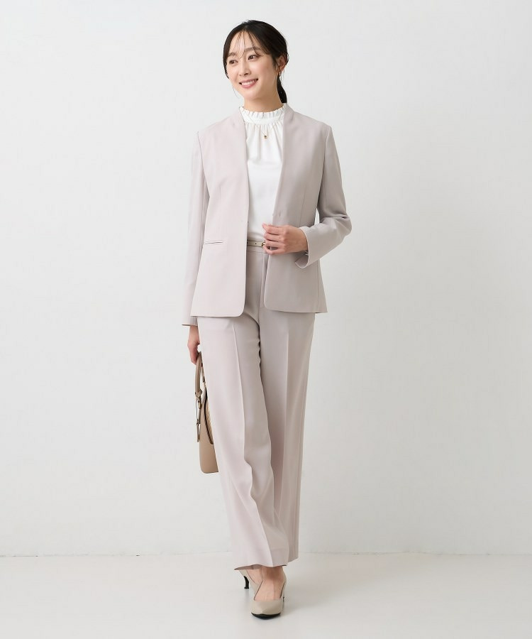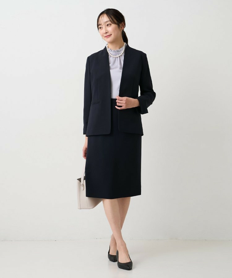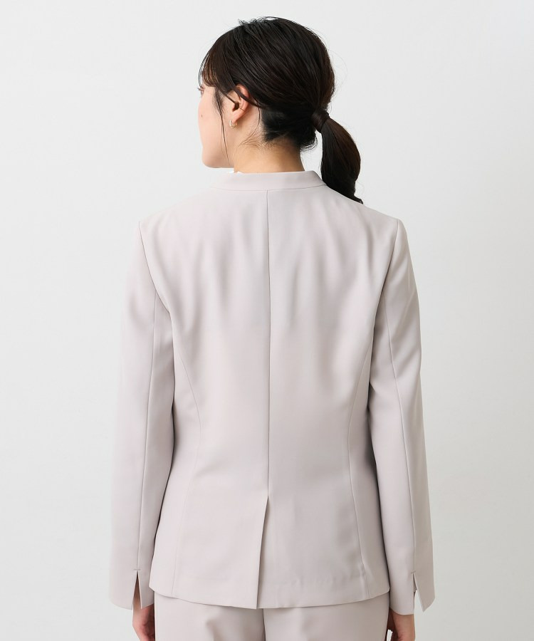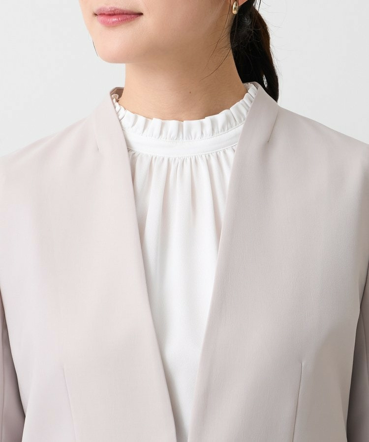 ウエストを程よくシェイプし、女性らしいシルエットを引き立てたカラーレスジャケット。