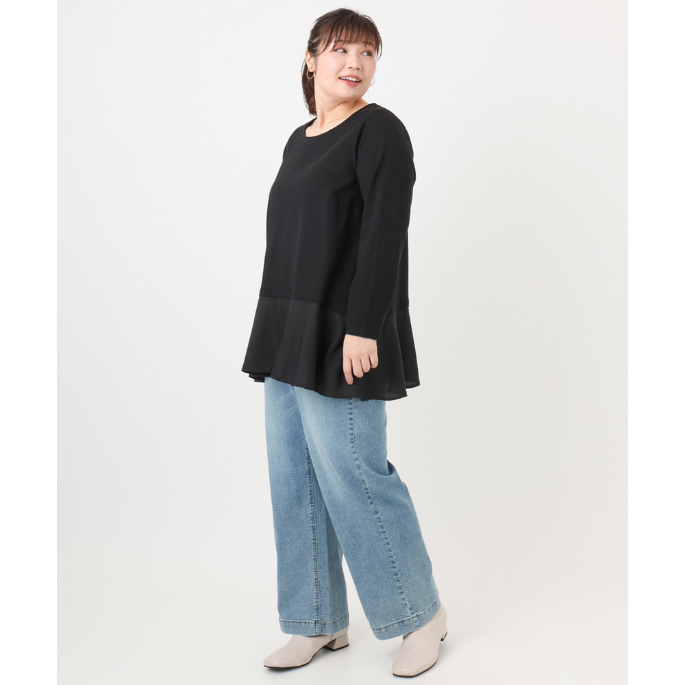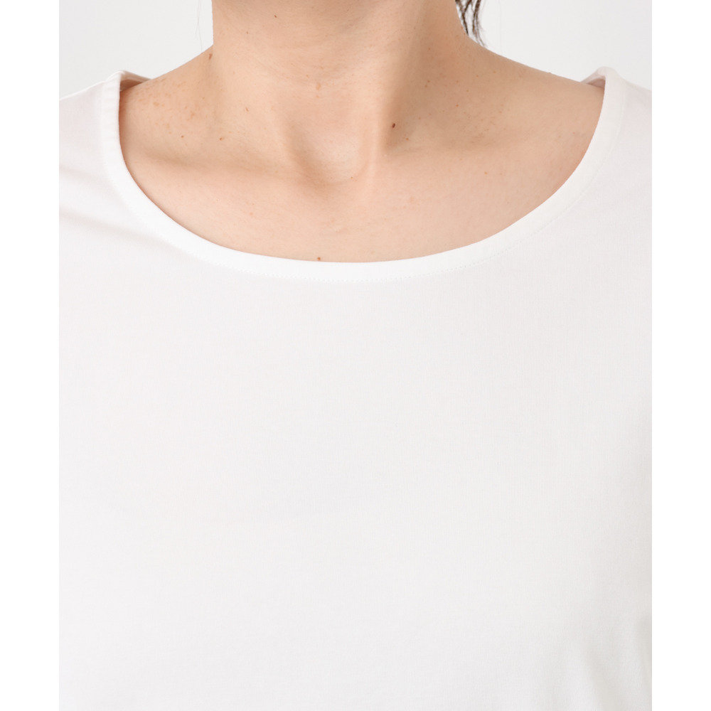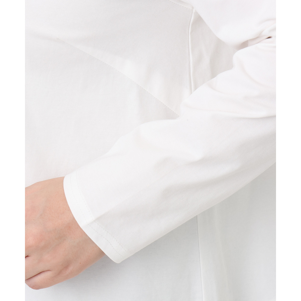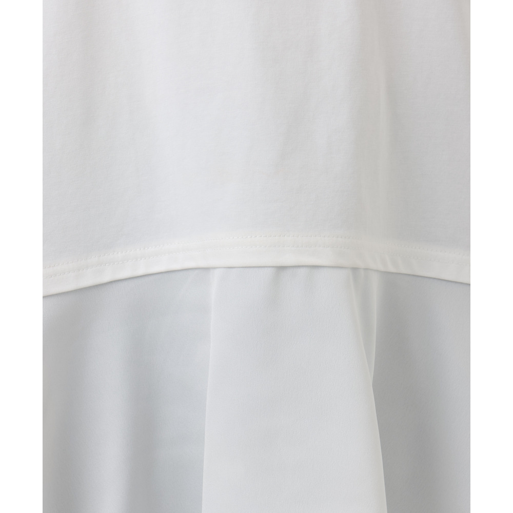 身頃は透けにくい柔らかなTC天竺生地と、裾には薄手のサテン布帛生地を使用しています。