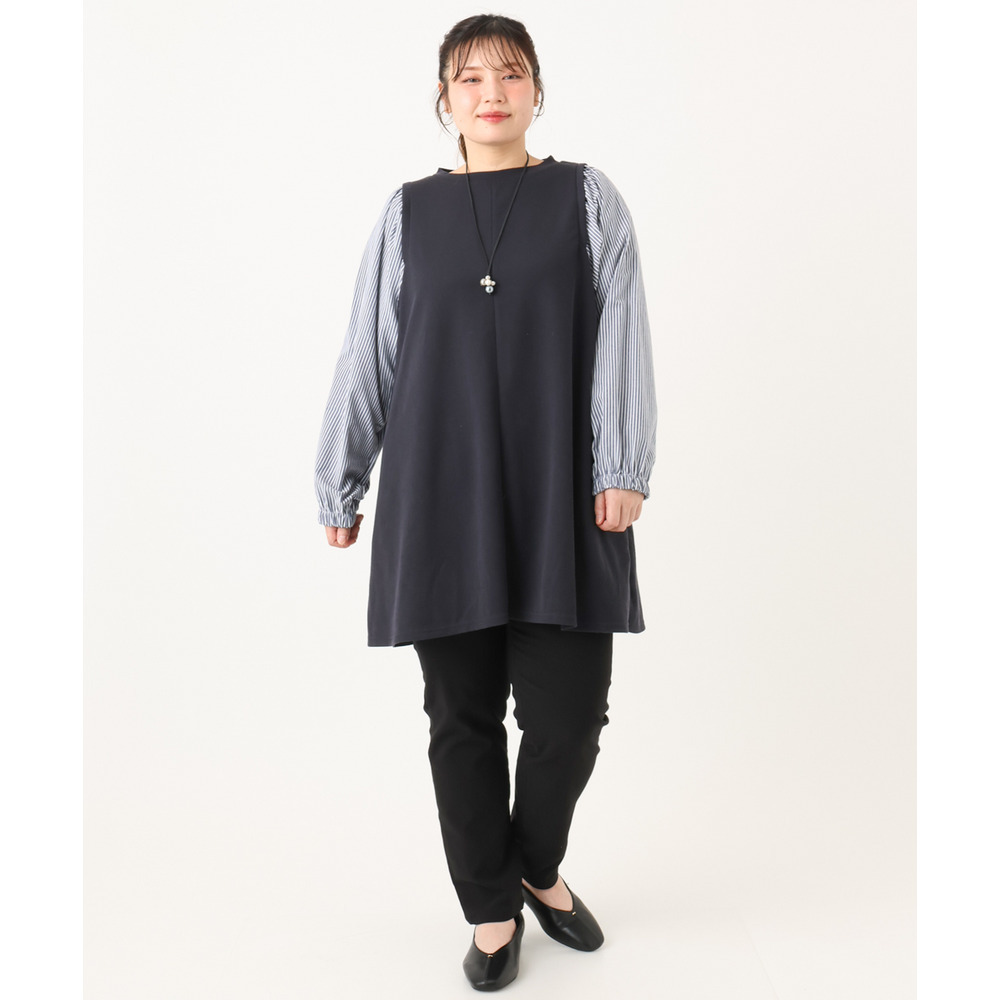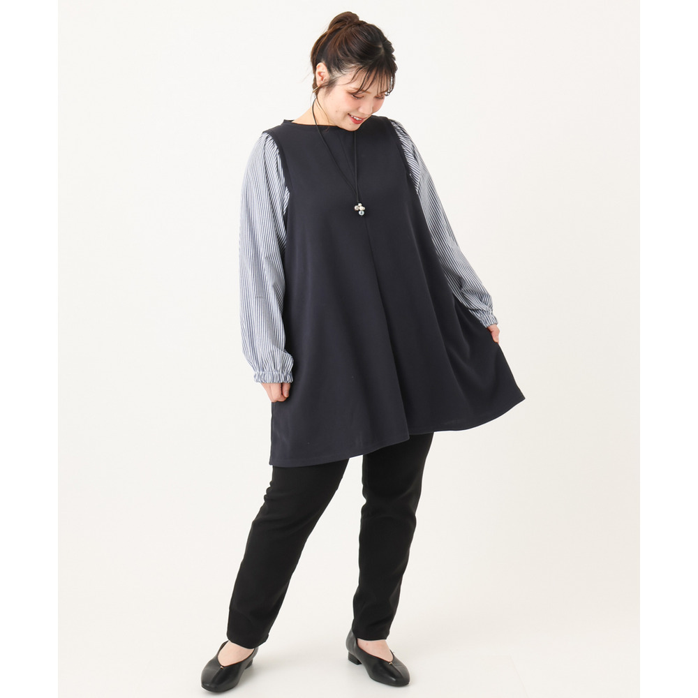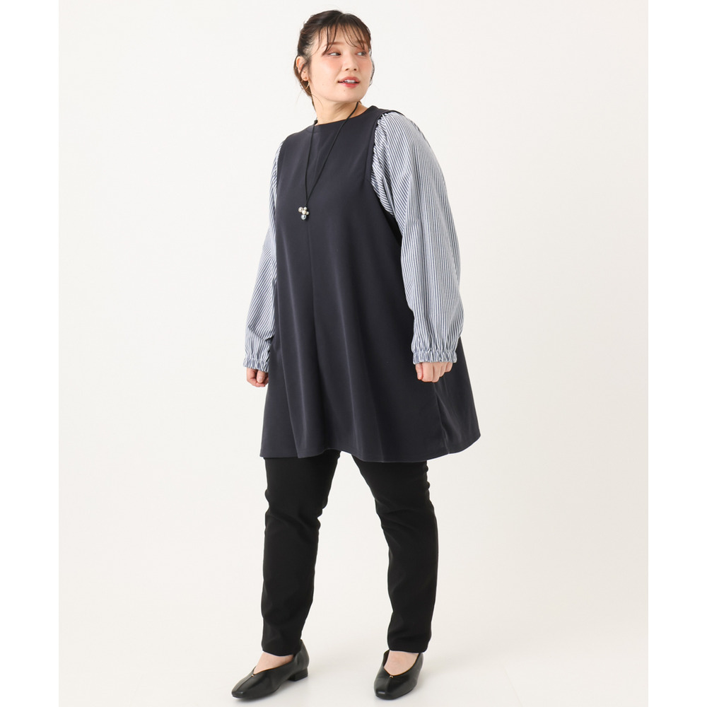 着丈長めのチュニックワンピースを合わせてもすっきり合わせられます。