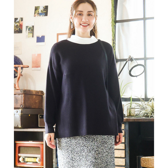 シンプルなデザインながら、胸元の横リブ使いで少し抜け感のある大人のベーシックニットに仕上げています。