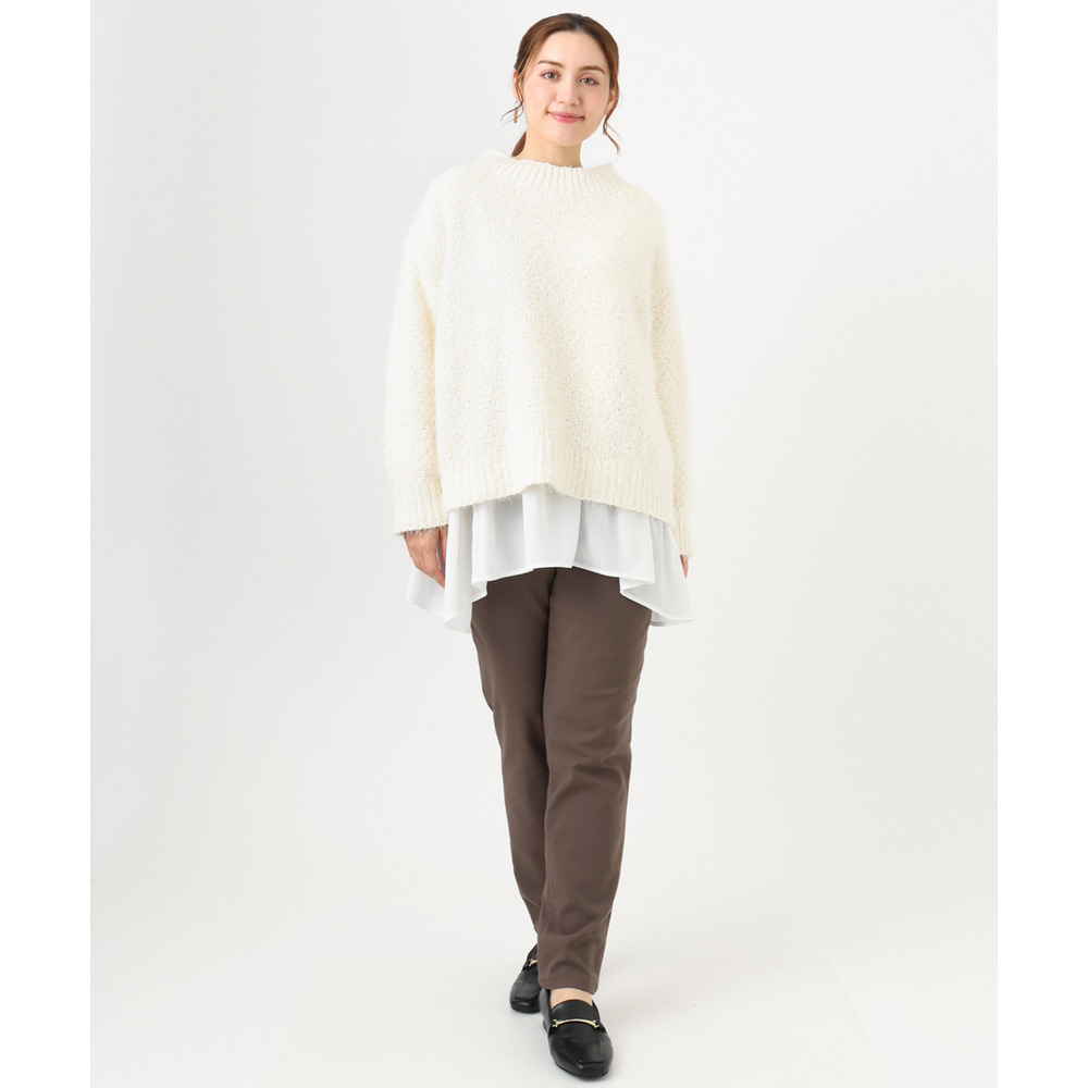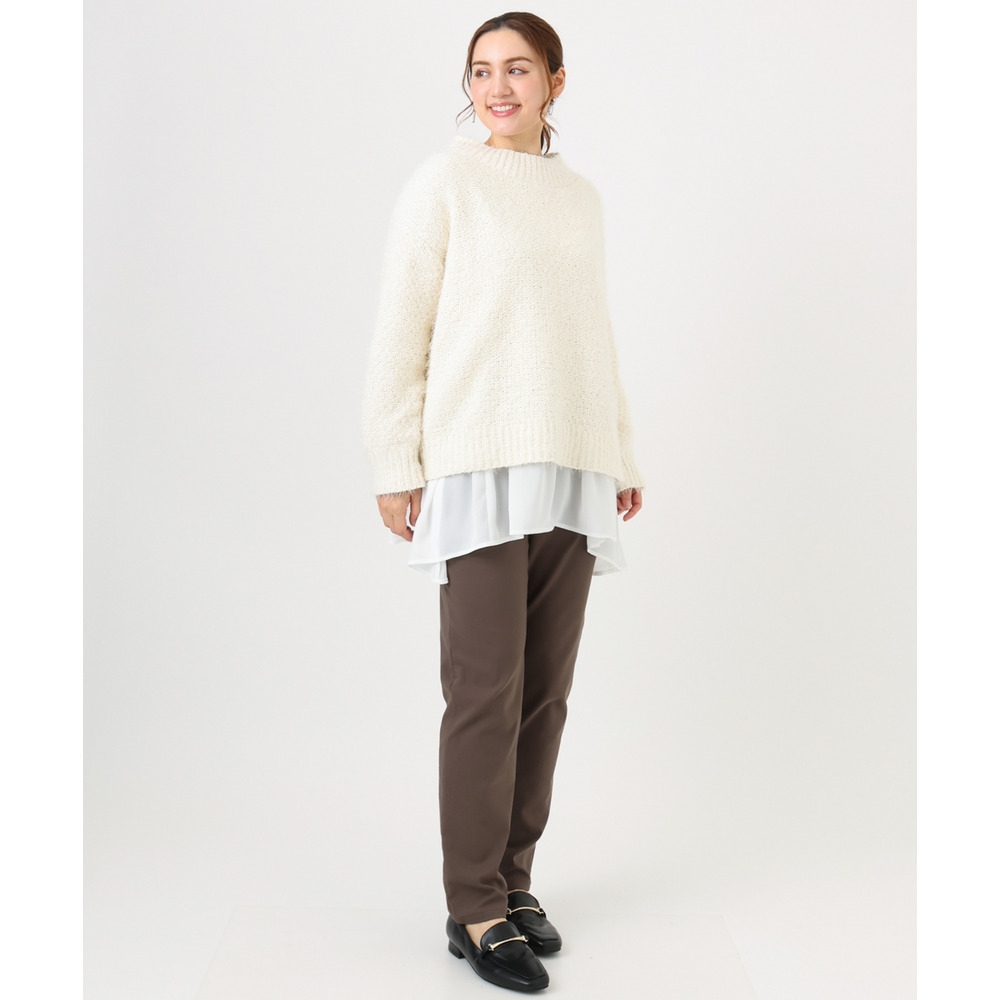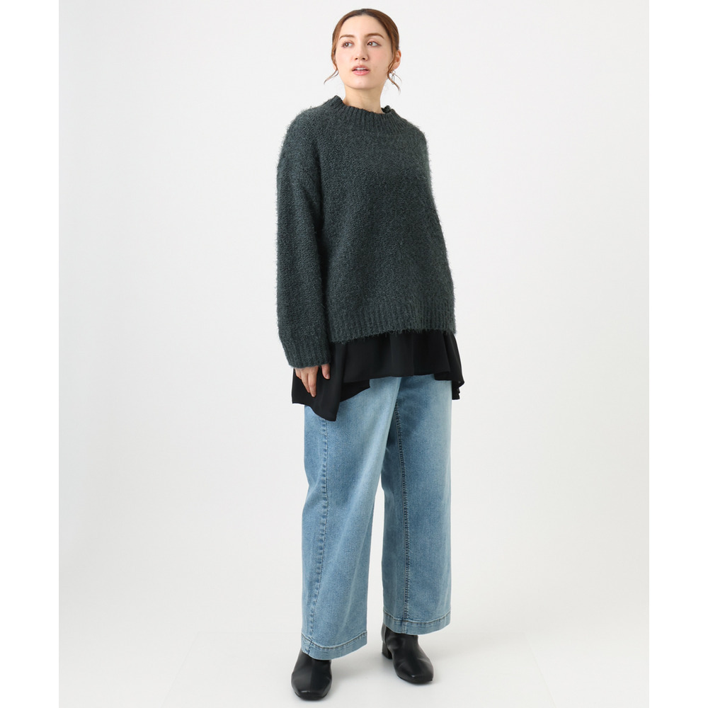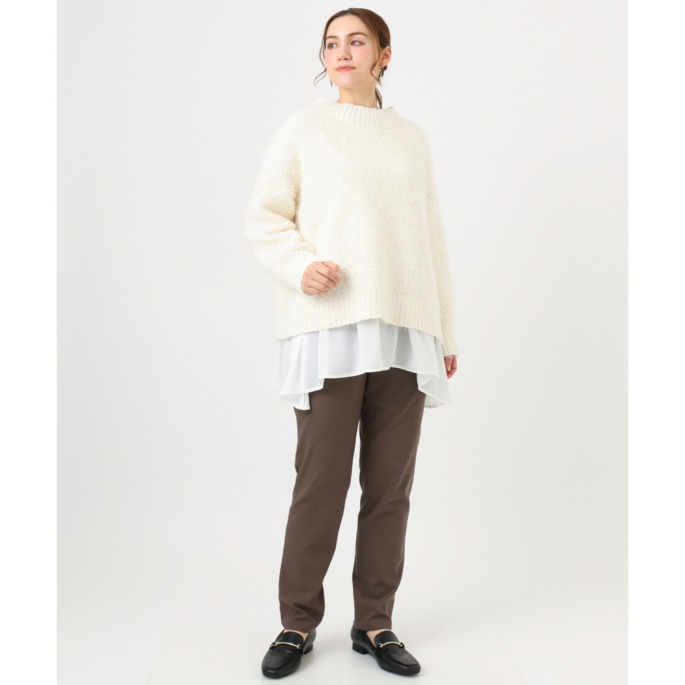 スカートやワイドパンツでもすっきり合わせられる着丈なので細身のパンツを合わせる時は裾見せインナーをレイヤードして着るのもおすすめです。