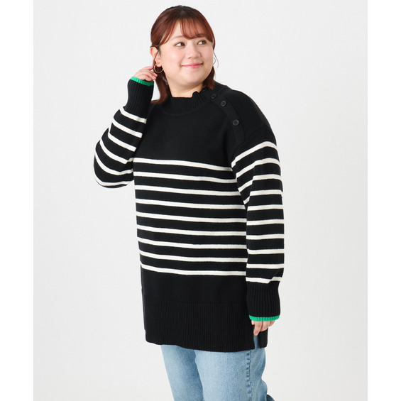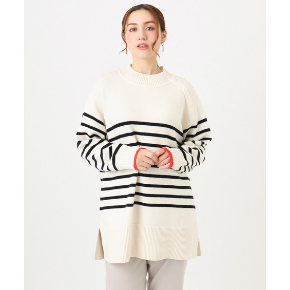 ボタン使いの襟ぐりがかわいいボーダーニット。
