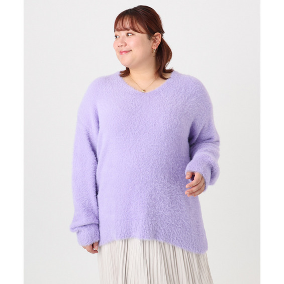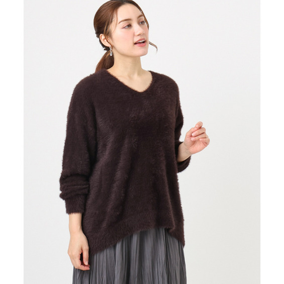 柔らかな毛足のシャギー糸にポリエステルプレーティングした天竺編みをしようしています。