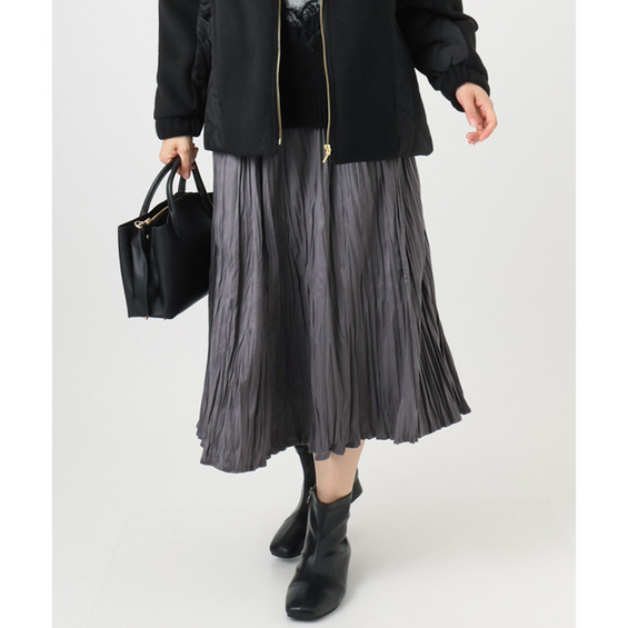 トレンドのスエード素材にランダムなワッシャープリーツ加工をかけたスカート。