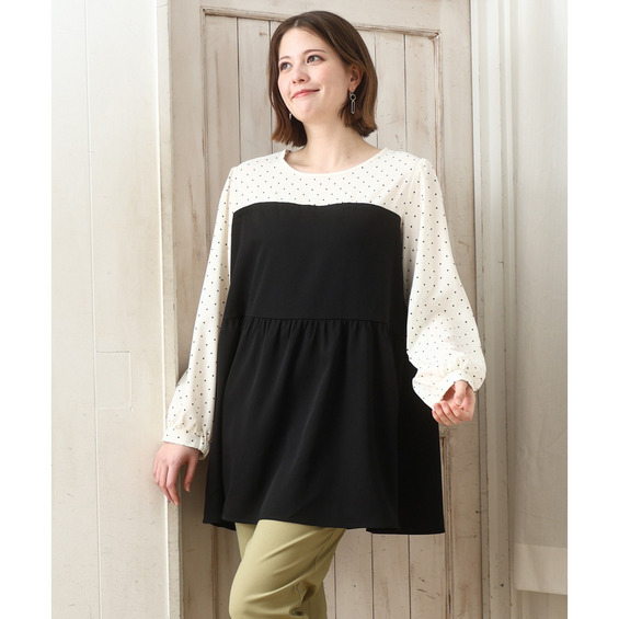 1枚でトレンド感ある着こなしが完成するドッキングチュニックブラウス。