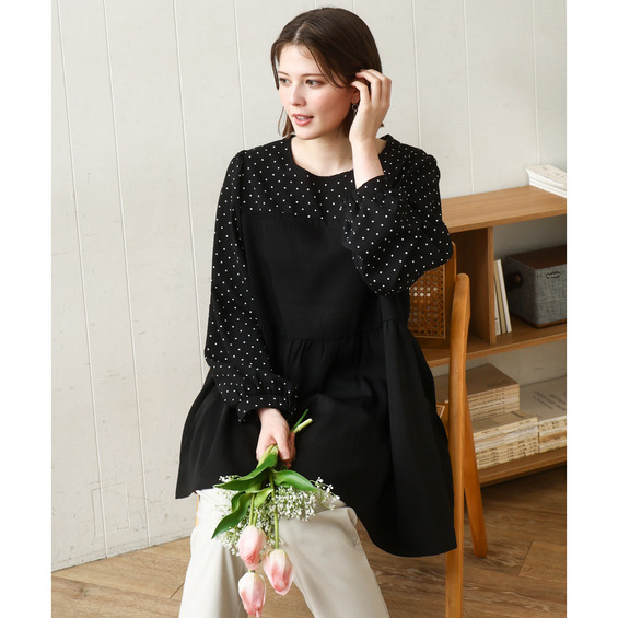 表面感あるポリエステル素材にドットプリントしたブラウスとビスチェ部分は少々ハリのあるツイル素材を使用しています。