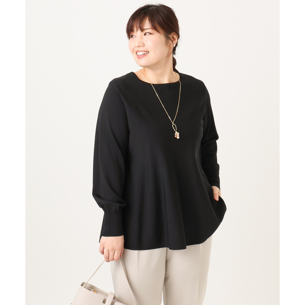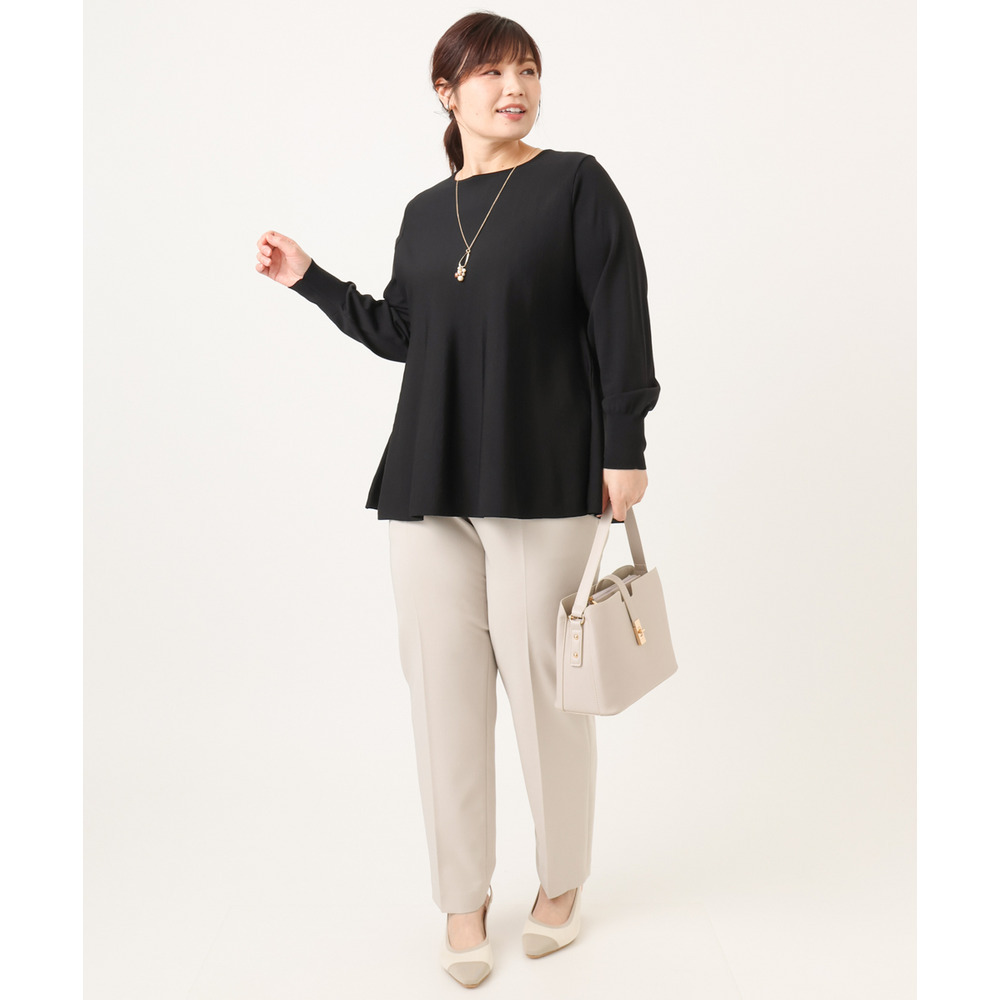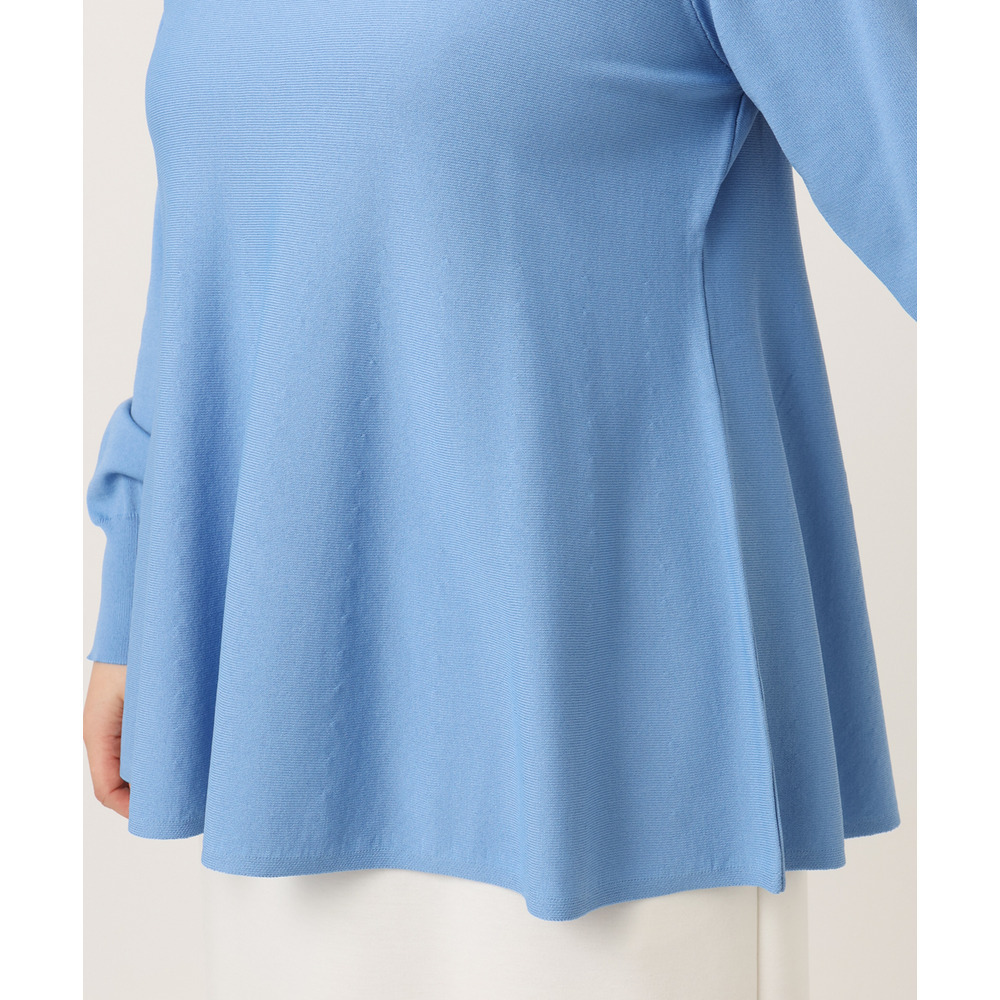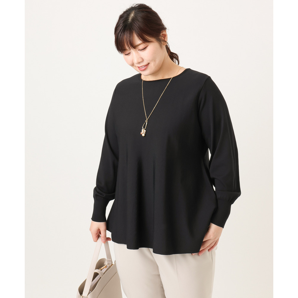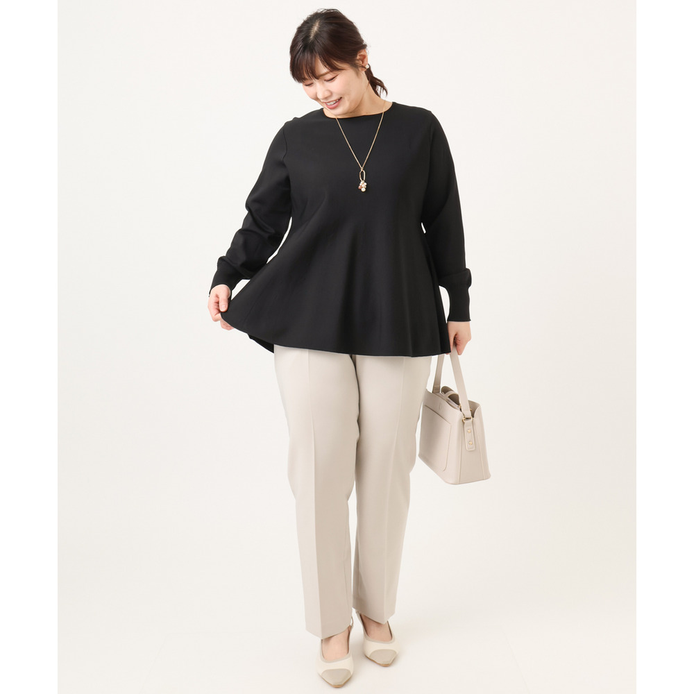 胸元すっきり、腰回りカバーのペプラムデザインのニット。
