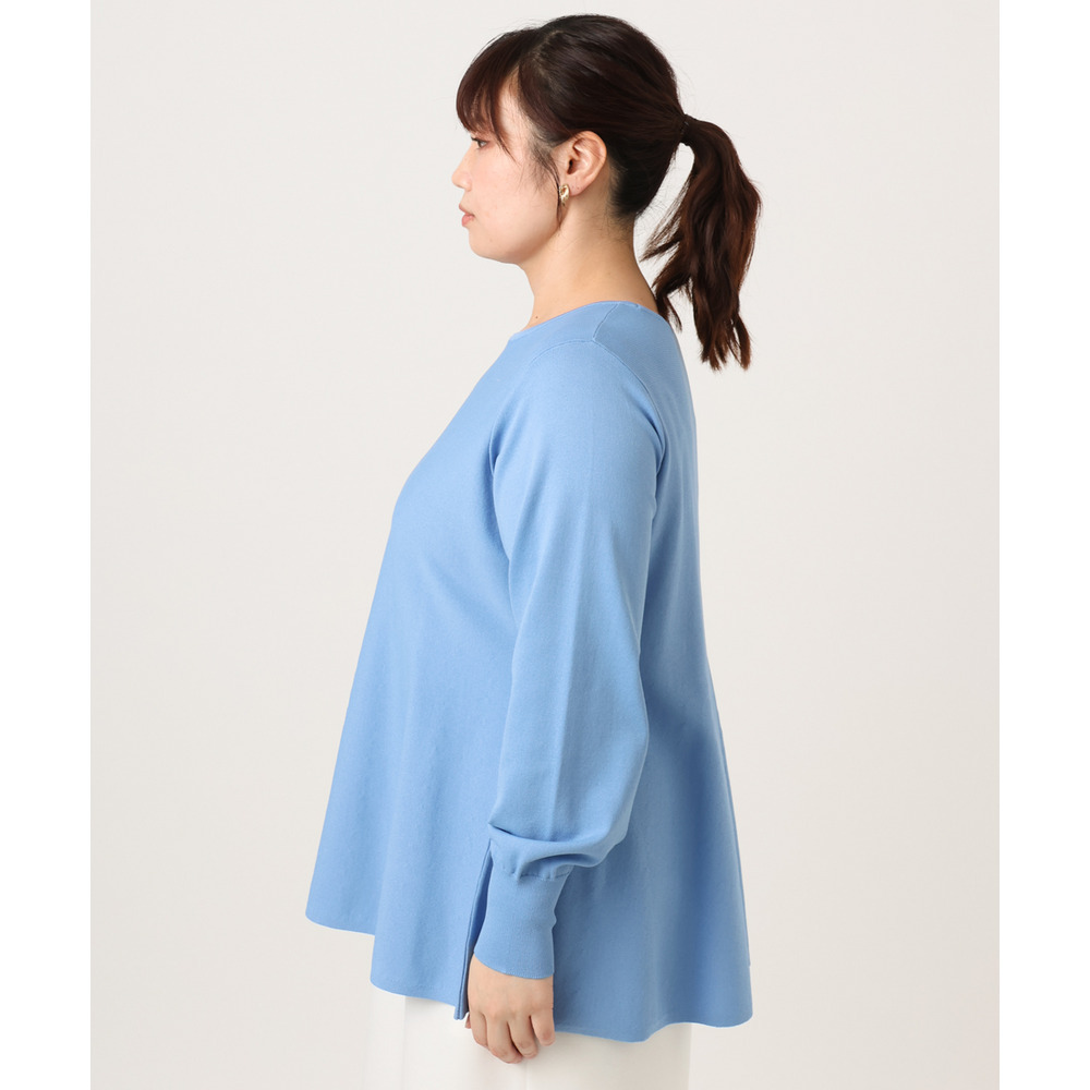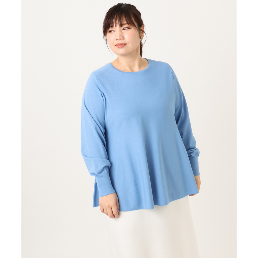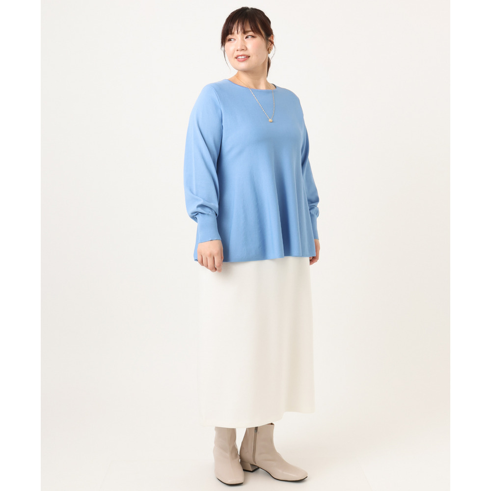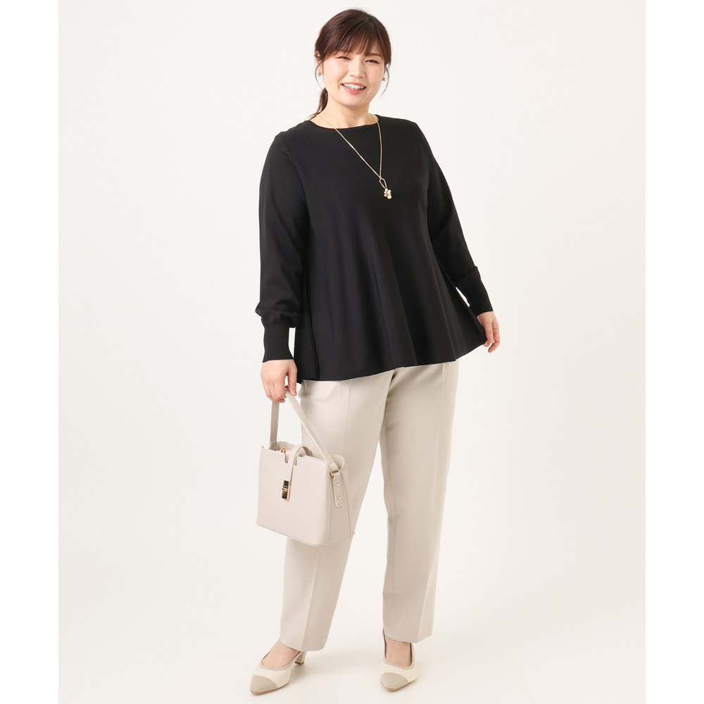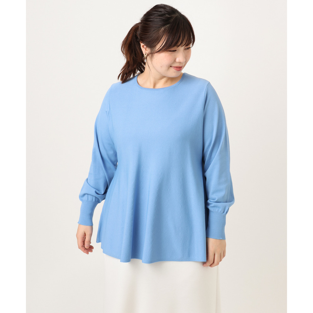 胸元すっきり、腰回りカバーのペプラムデザインのニット。