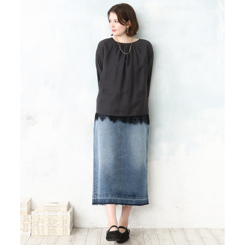 細身のボトム合わせの時は裾見せインナーと合わせるとトレンド感があり、体型カバーもできるのでおすすめ。