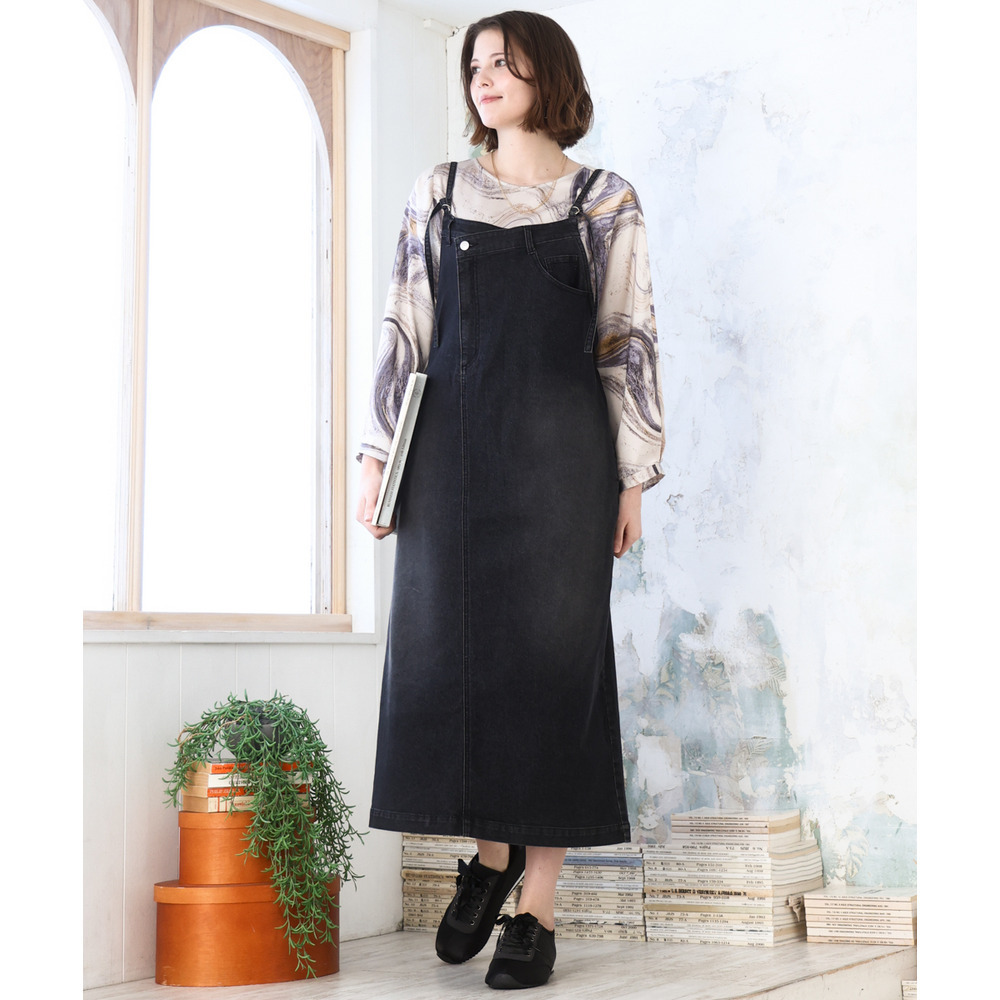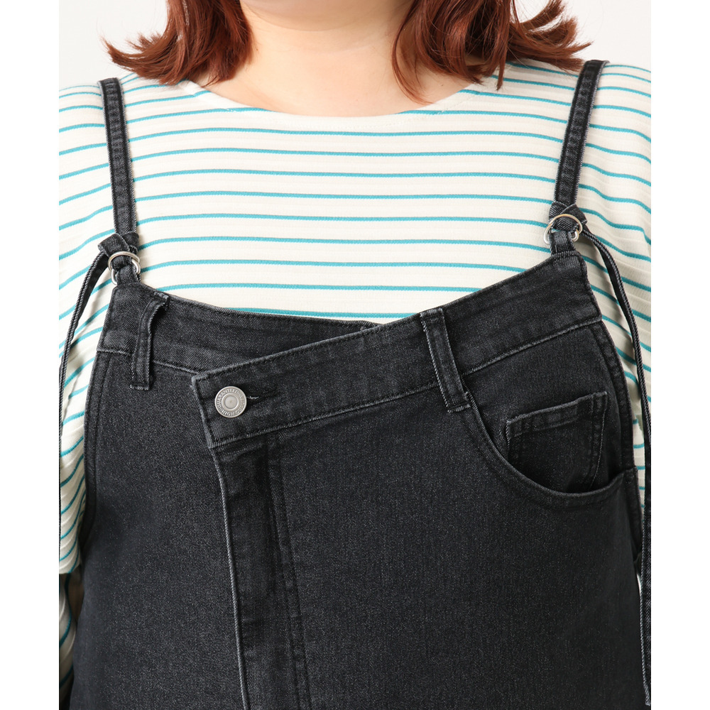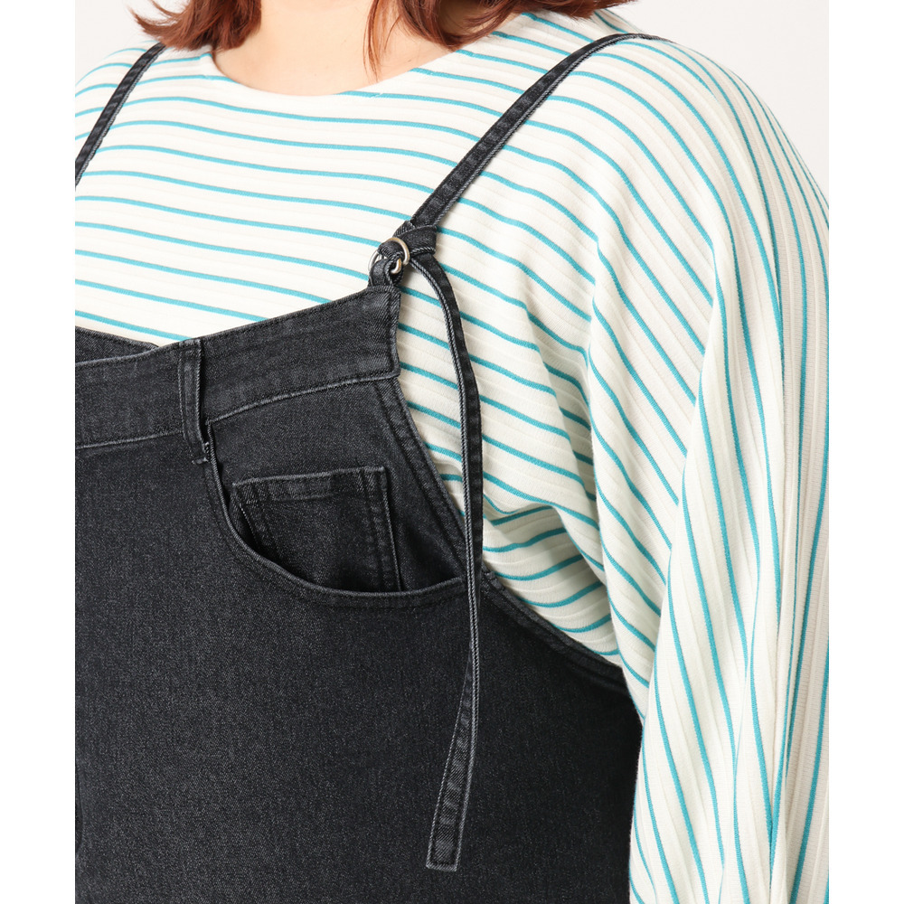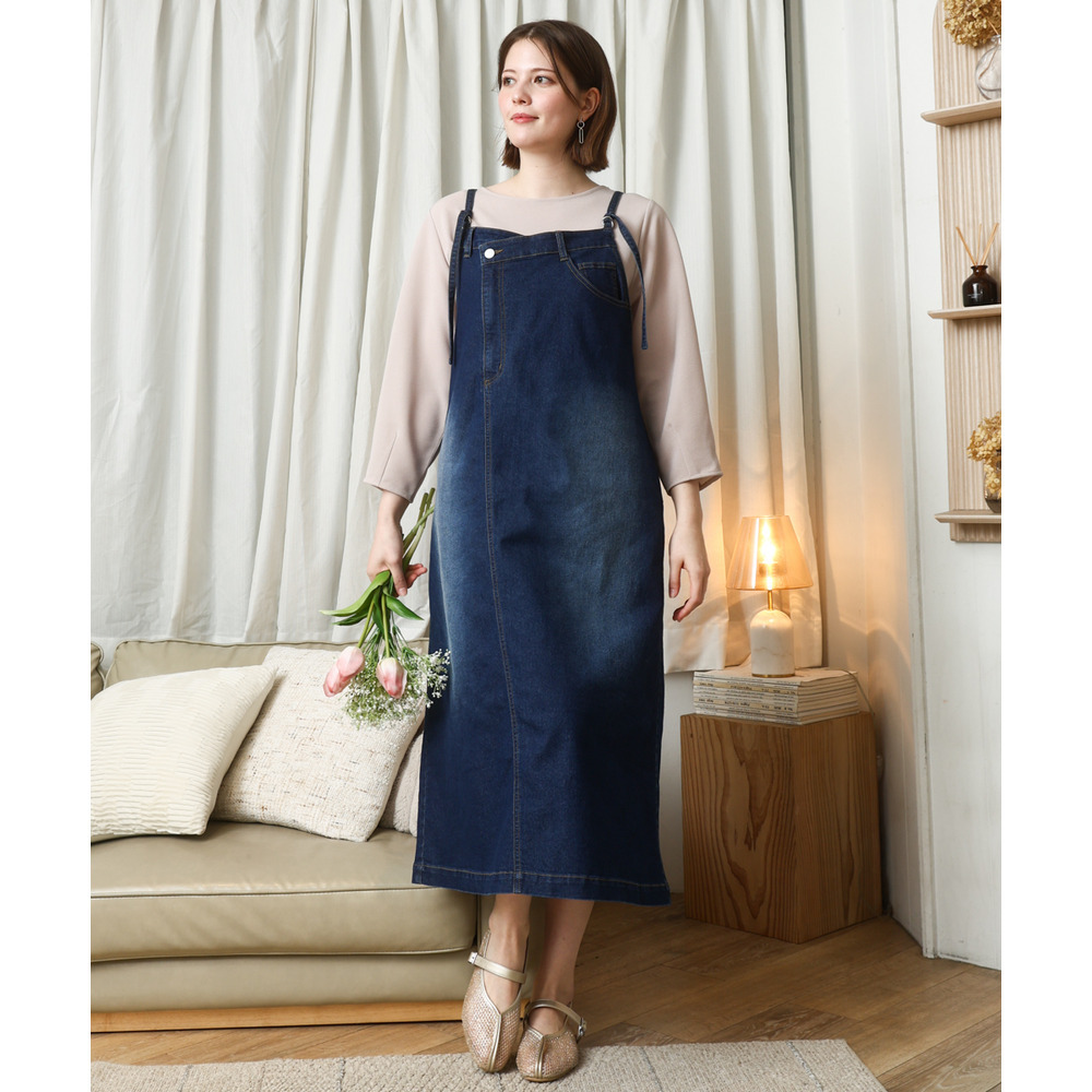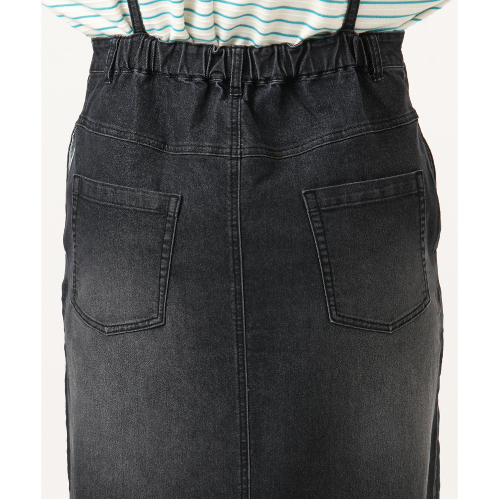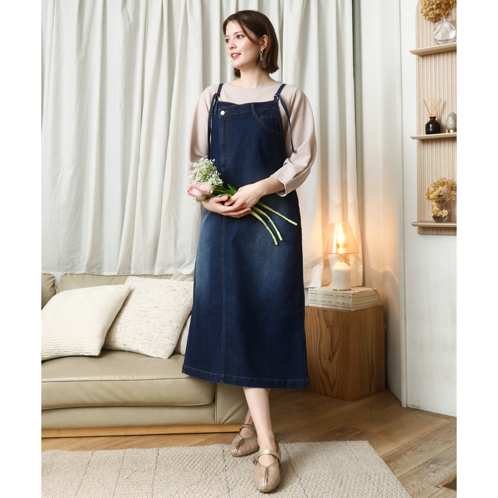 リメイク風ディテールが目を引く、カジュアルなキャミドレタイプのデニムジャンパースカート。