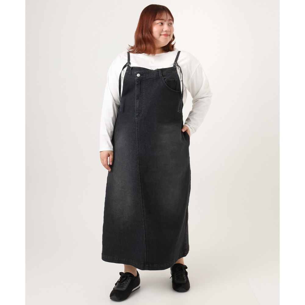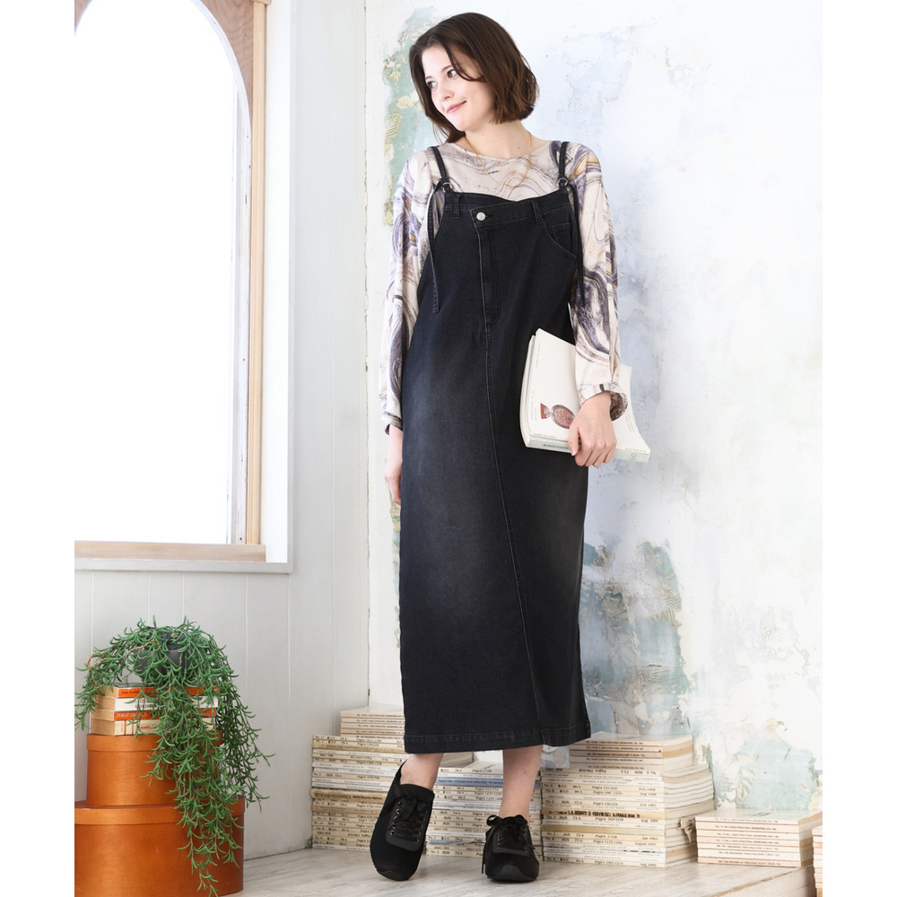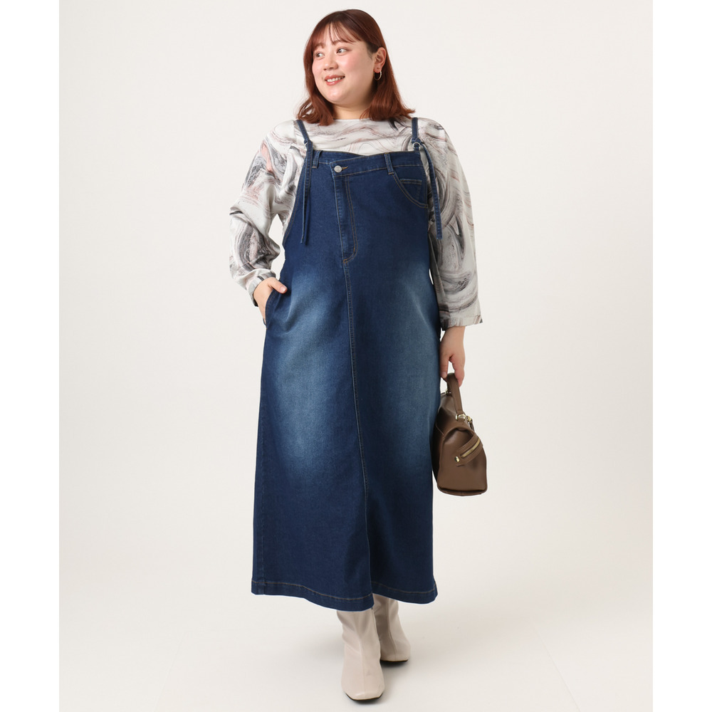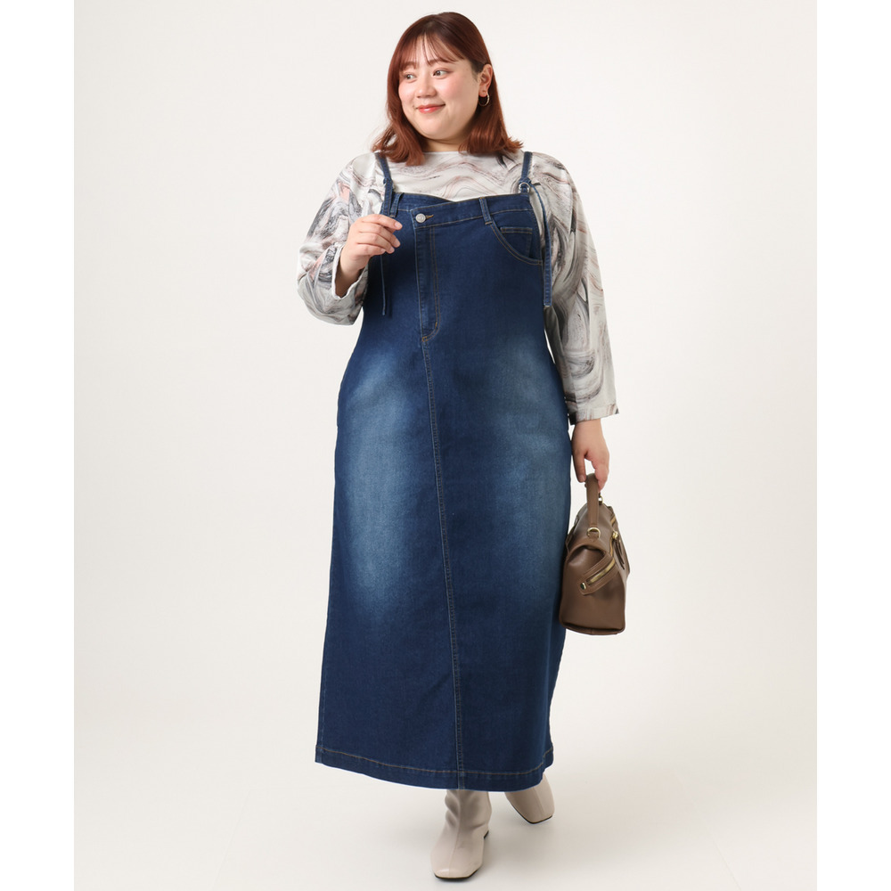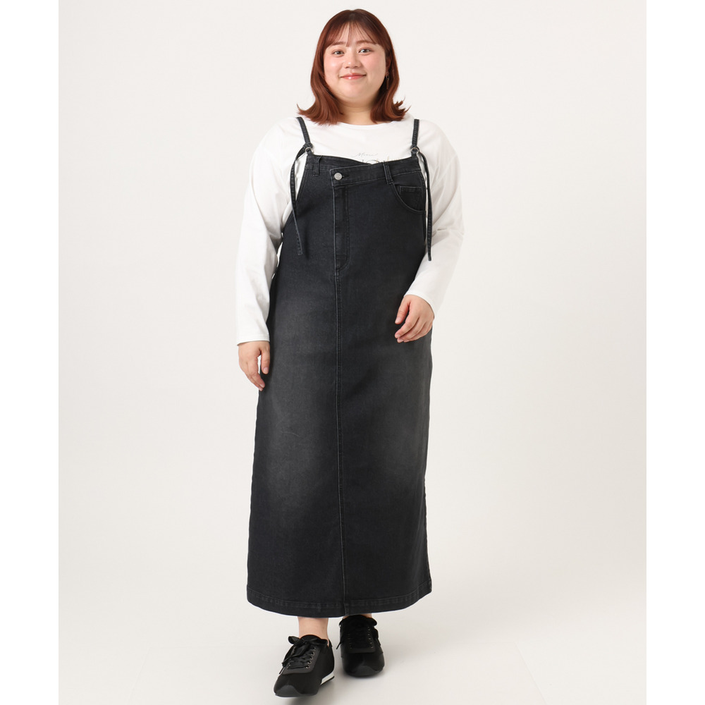 リメイク風ディテールが目を引く、カジュアルなキャミドレタイプのデニムジャンパースカート。