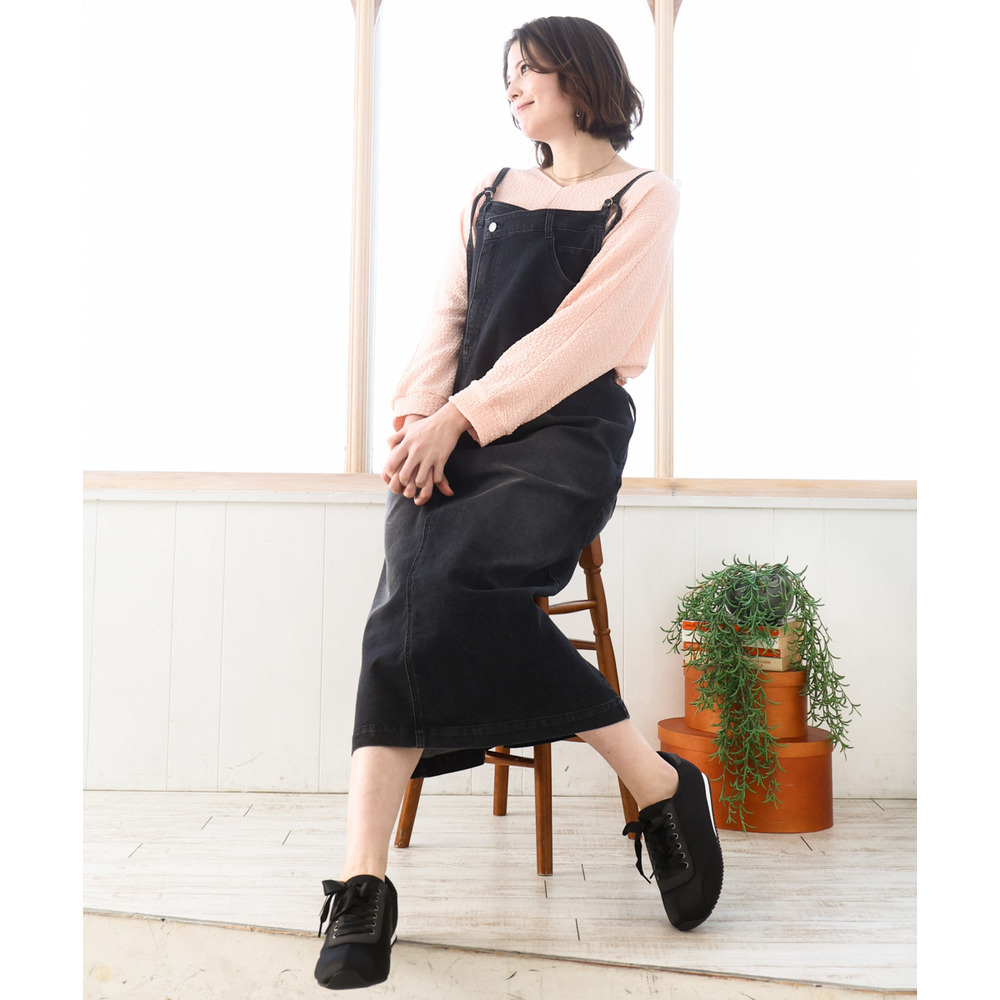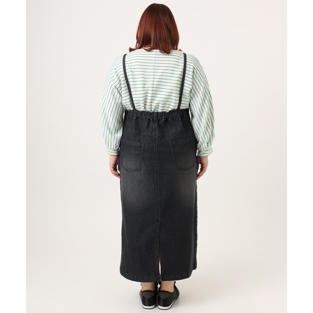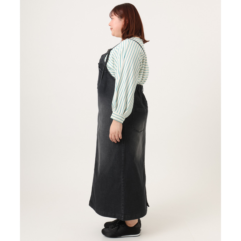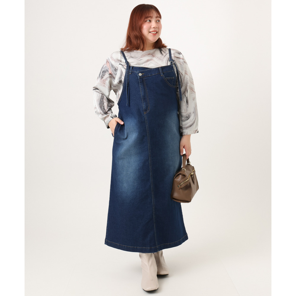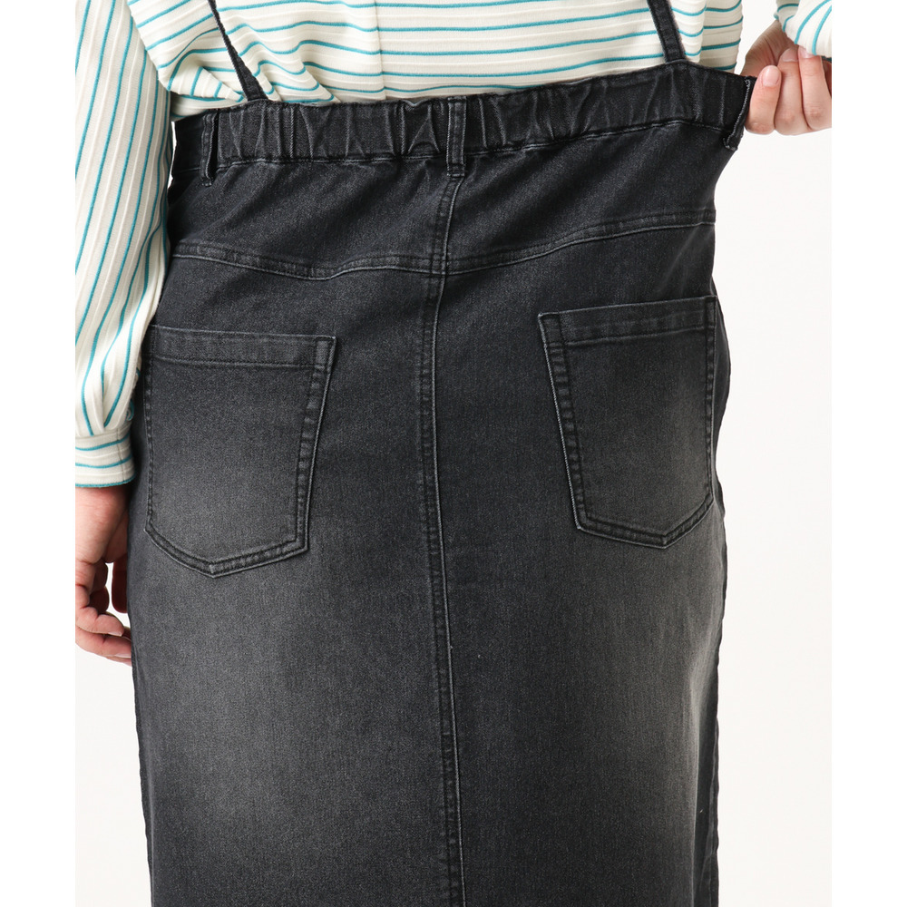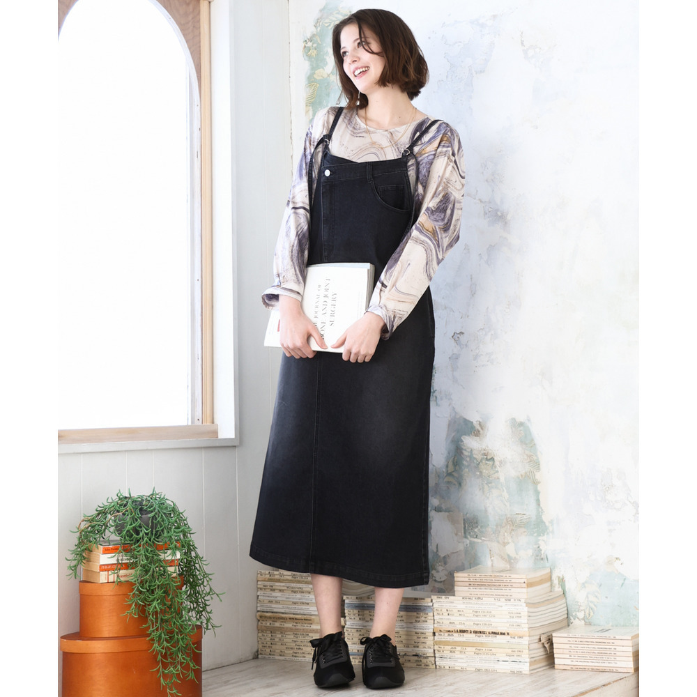 リメイク風ディテールが目を引く、カジュアルなキャミドレタイプのデニムジャンパースカート。