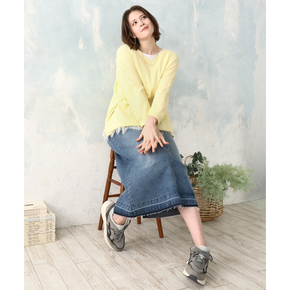 OLKDD02069(レースヘムタンクトップ)を合わせて裾からレースを見せるスタリングはトレンド感もありおすすめです。