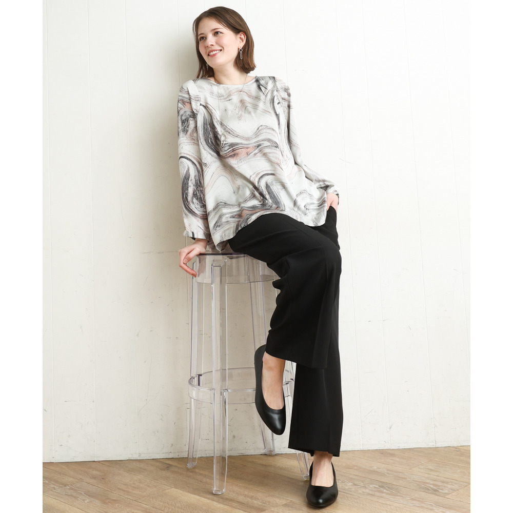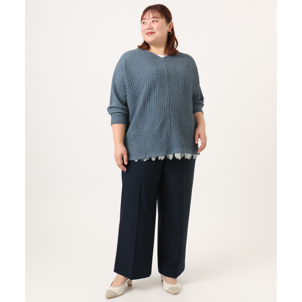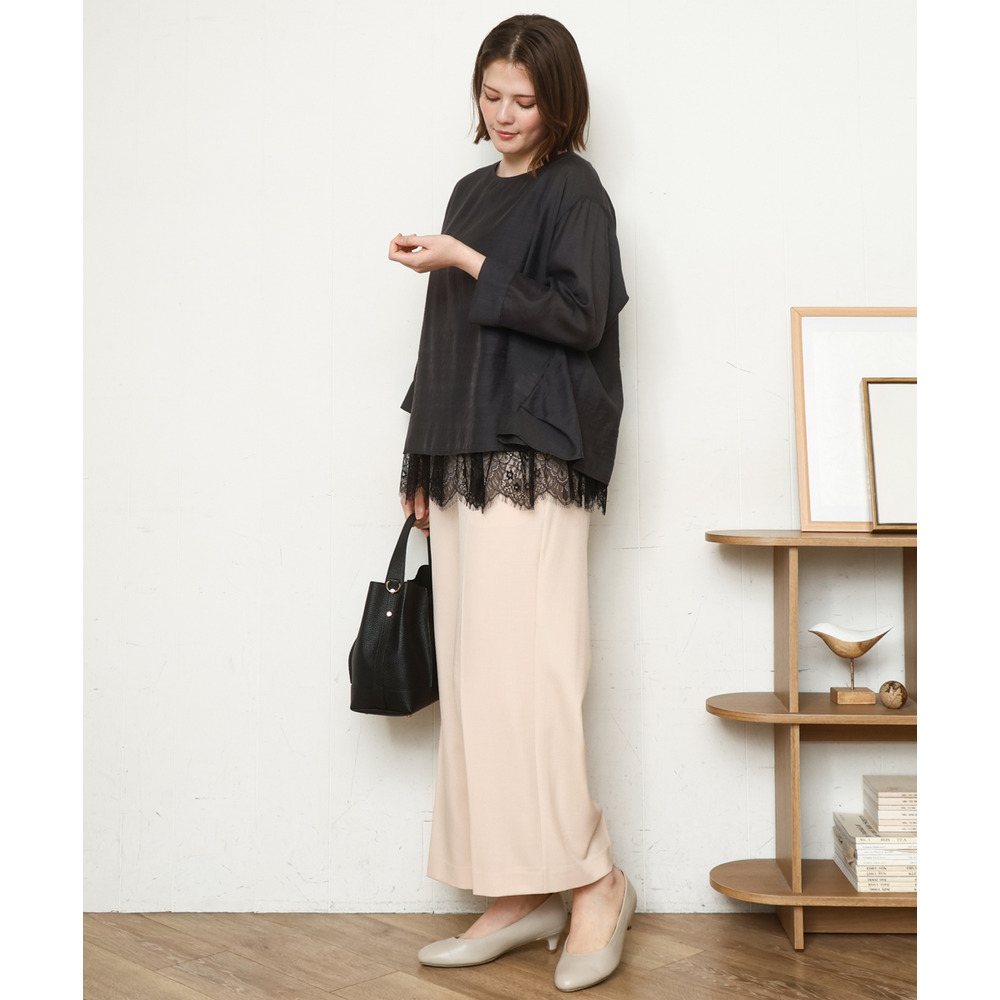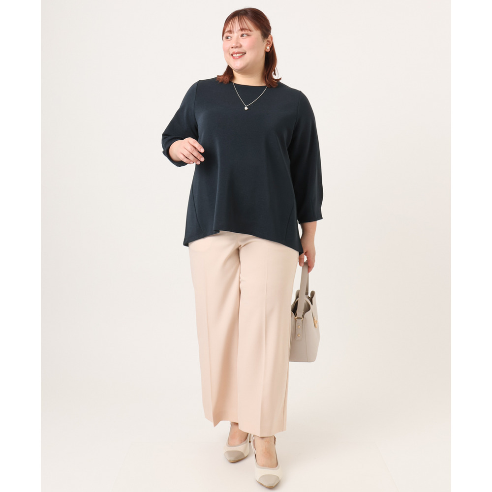 透けにくく、着心地の良いストレッチ入りのきれいめツイル生地を使用した、すっきり見えワイドパンツ。