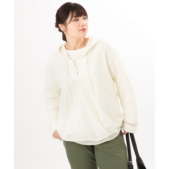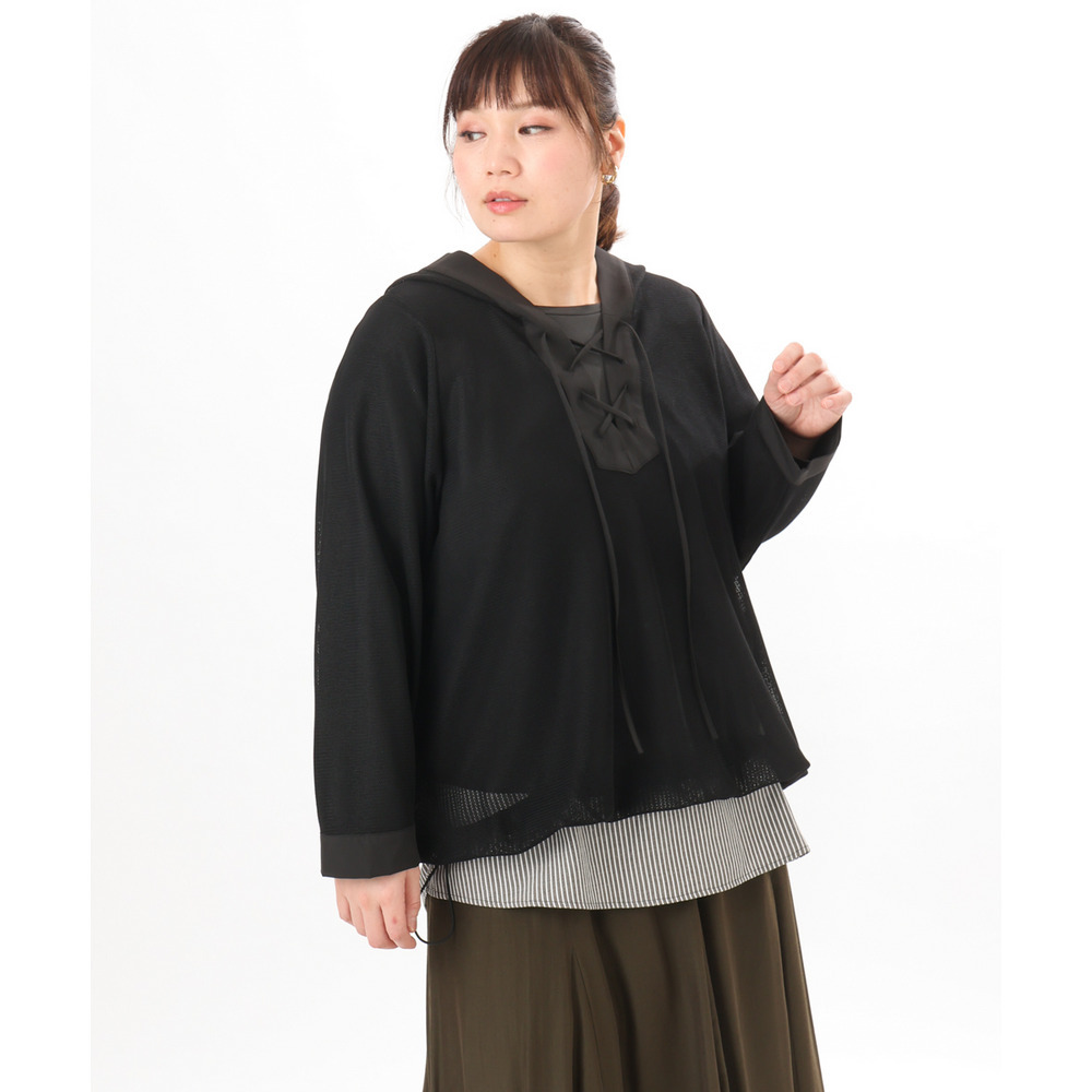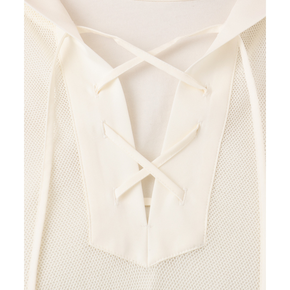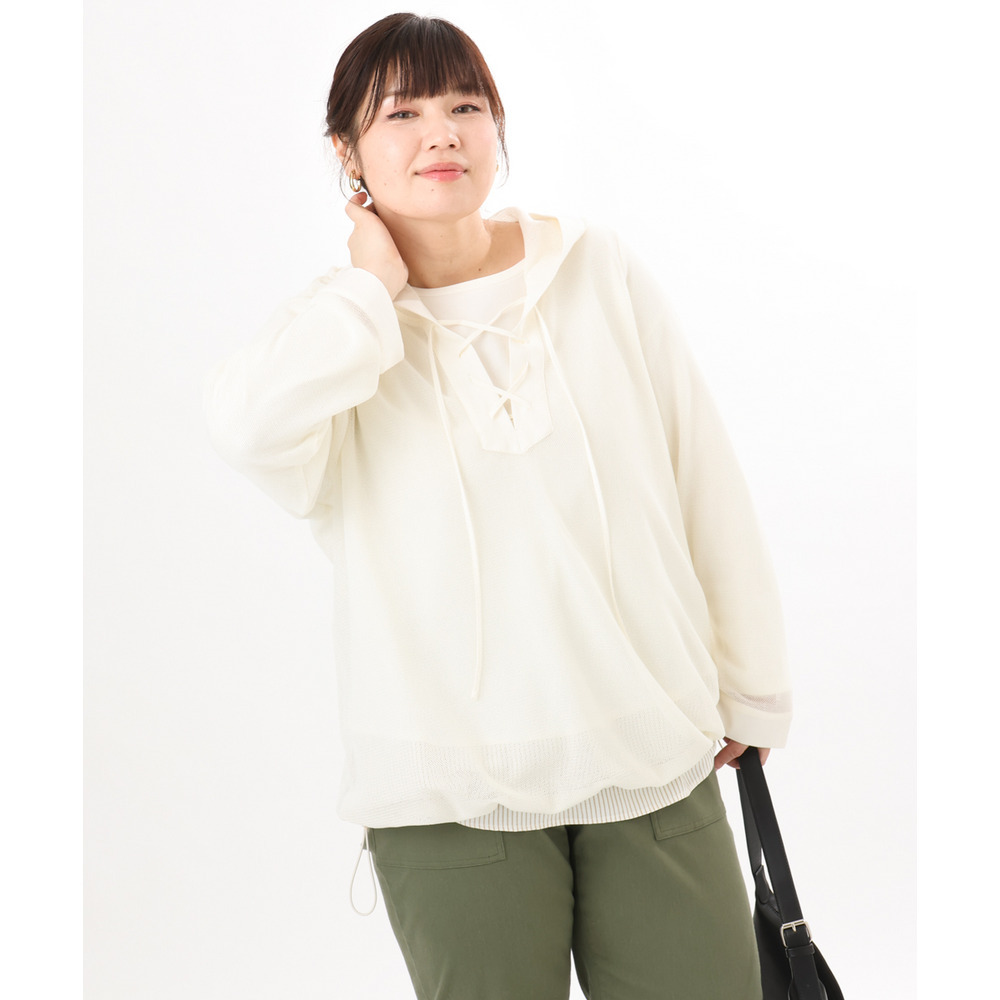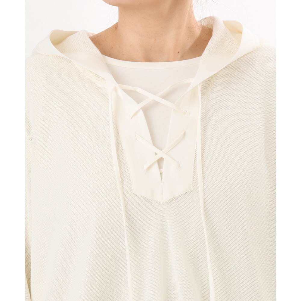 軽やかなメッシュ素材に、胸元のレースアップデザインをプラスしたフーディトップス。