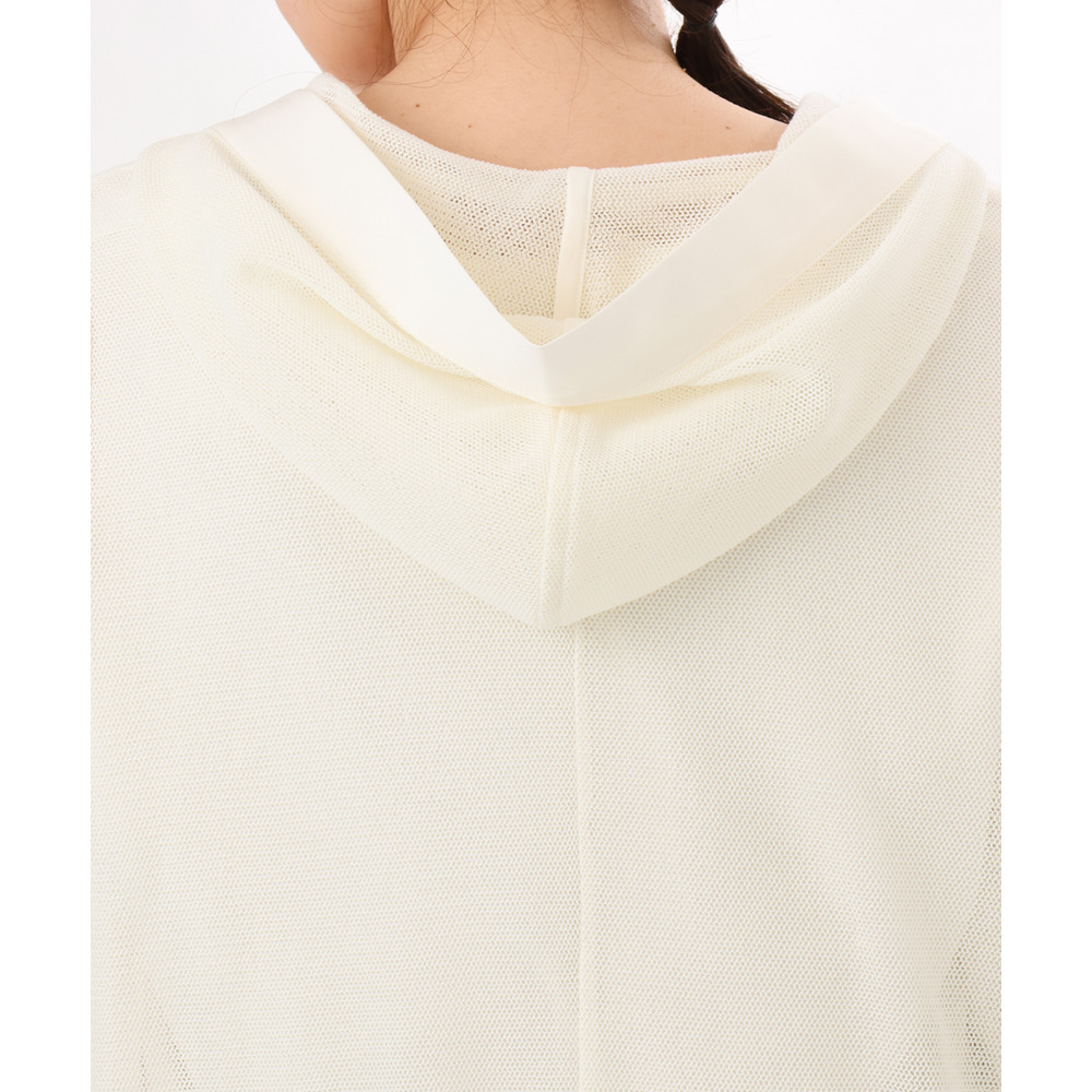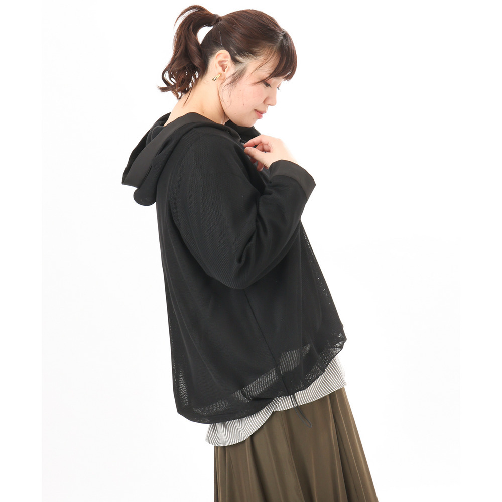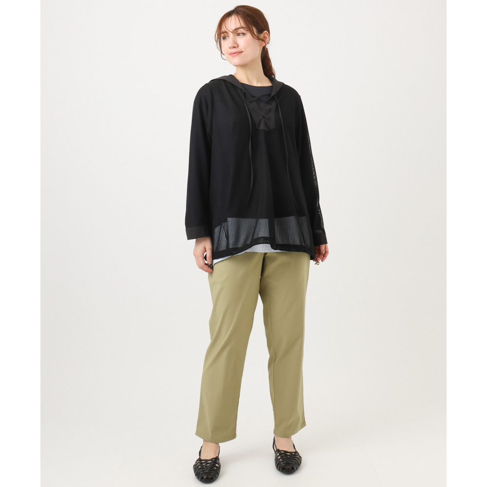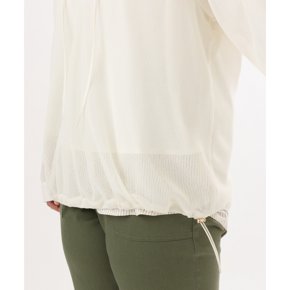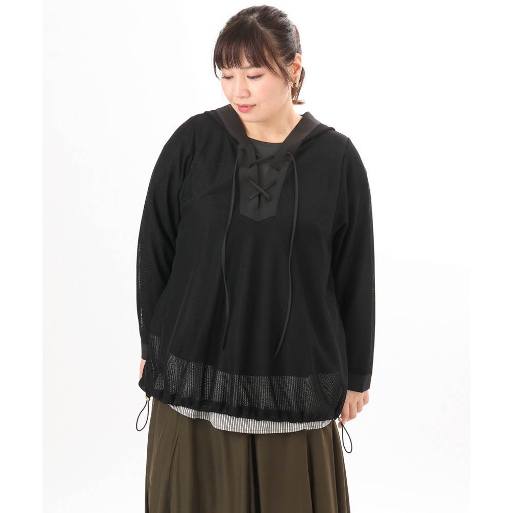 軽やかなメッシュ素材に、胸元のレースアップデザインをプラスしたフーディトップス。