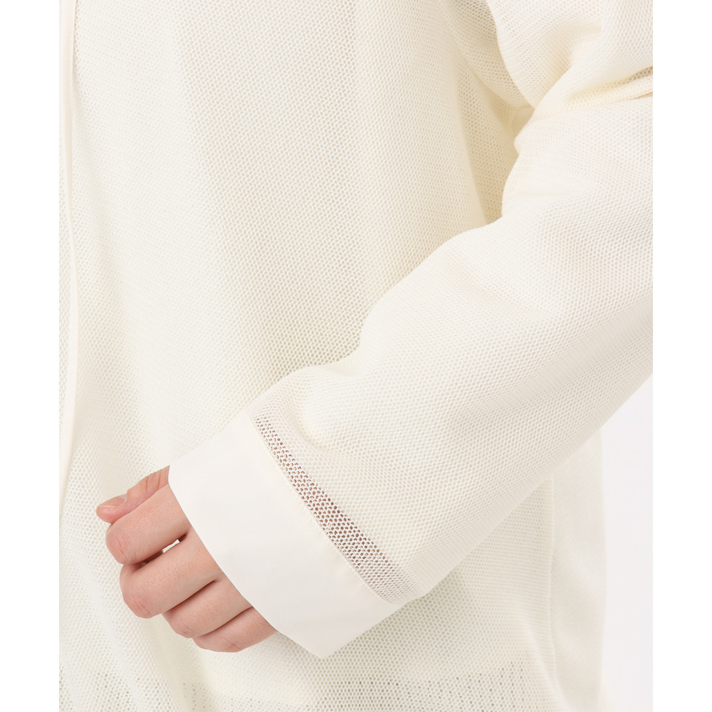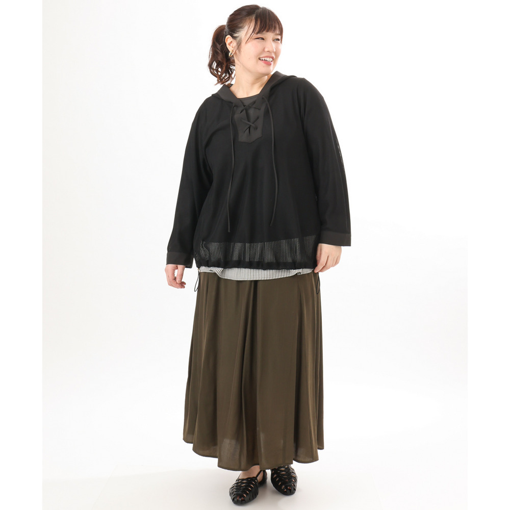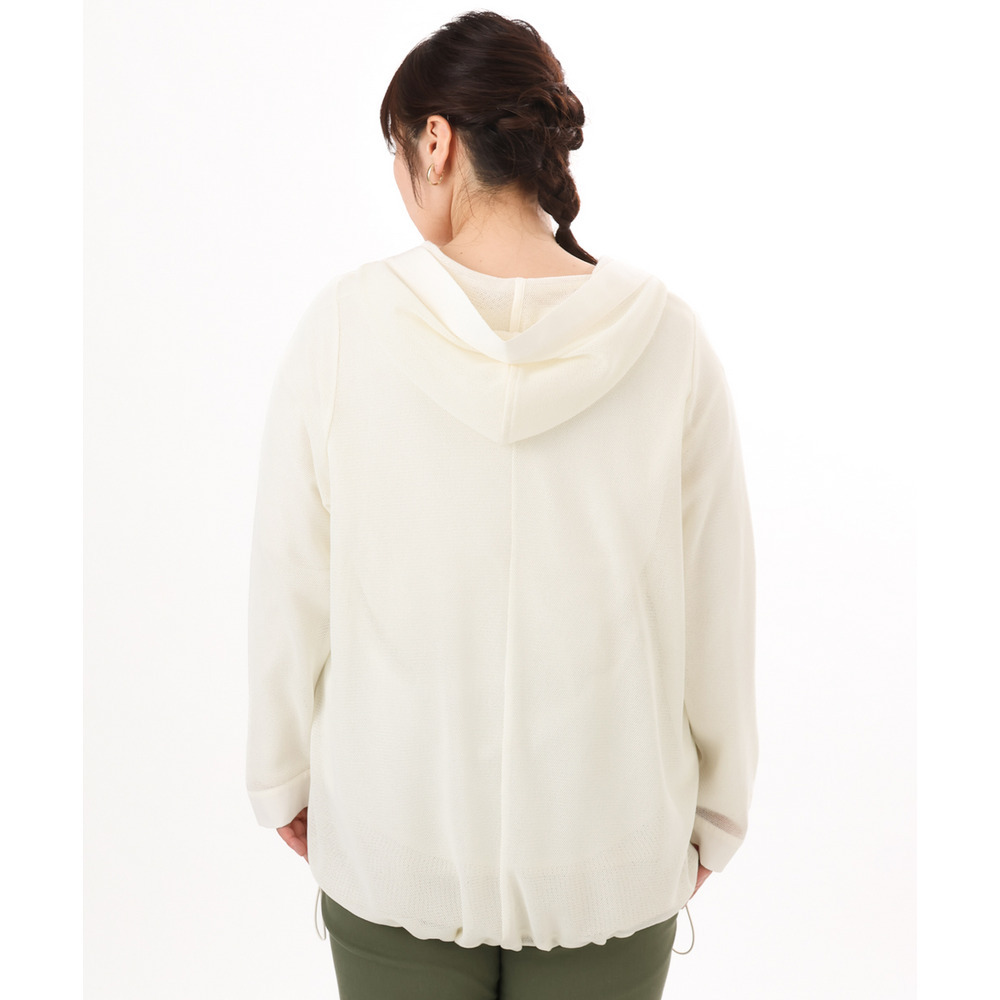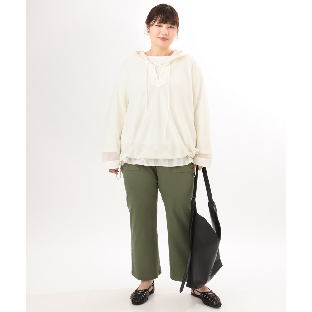 軽やかなメッシュ素材に、胸元のレースアップデザインをプラスしたフーディトップス。