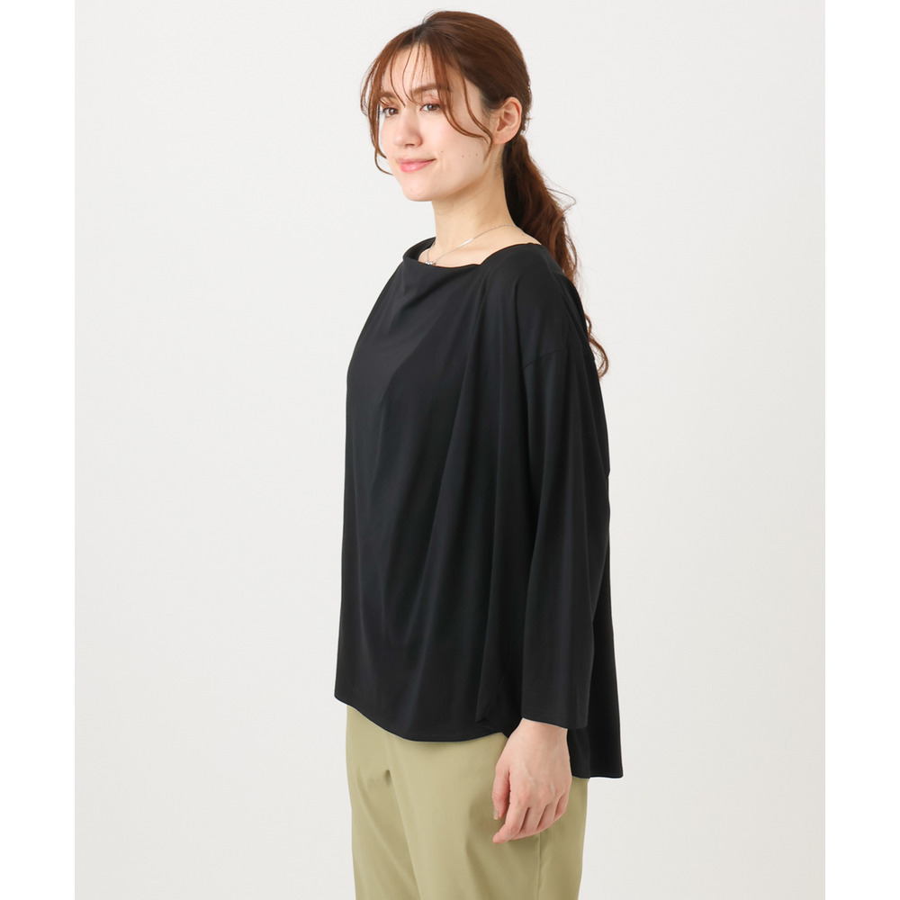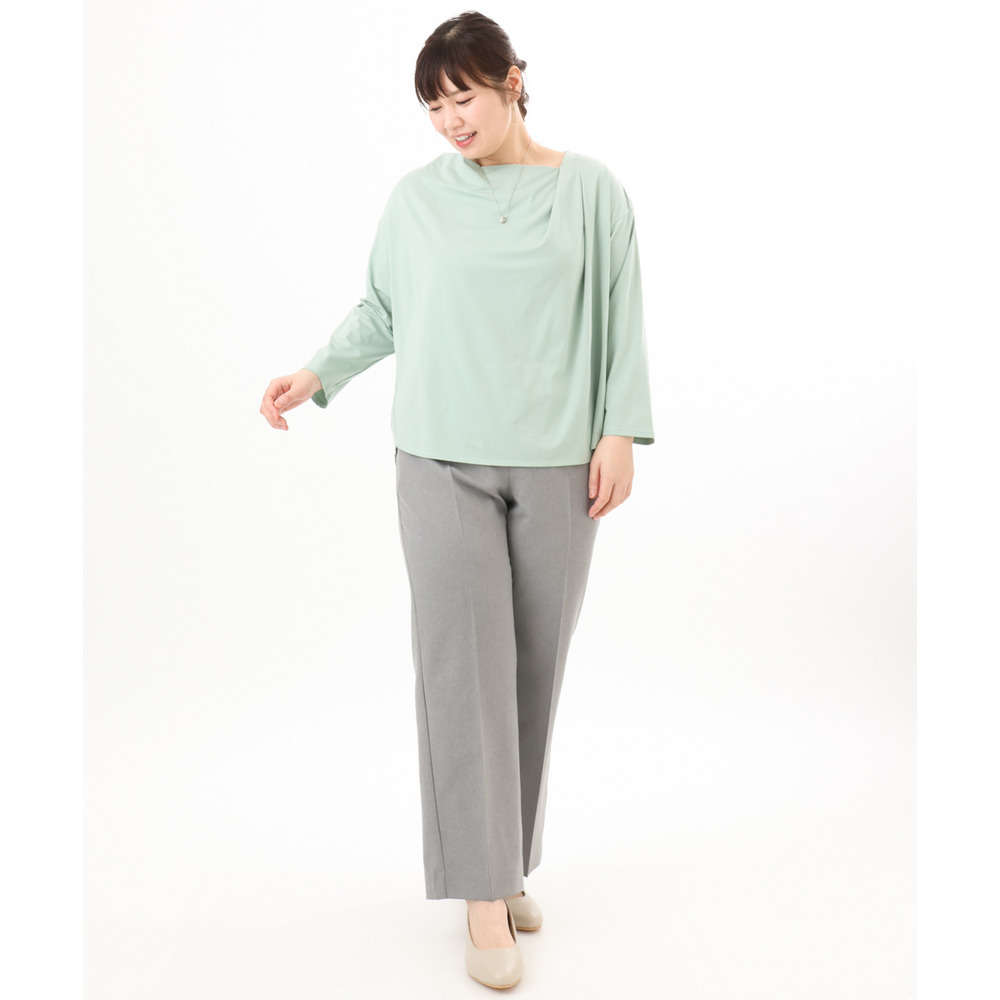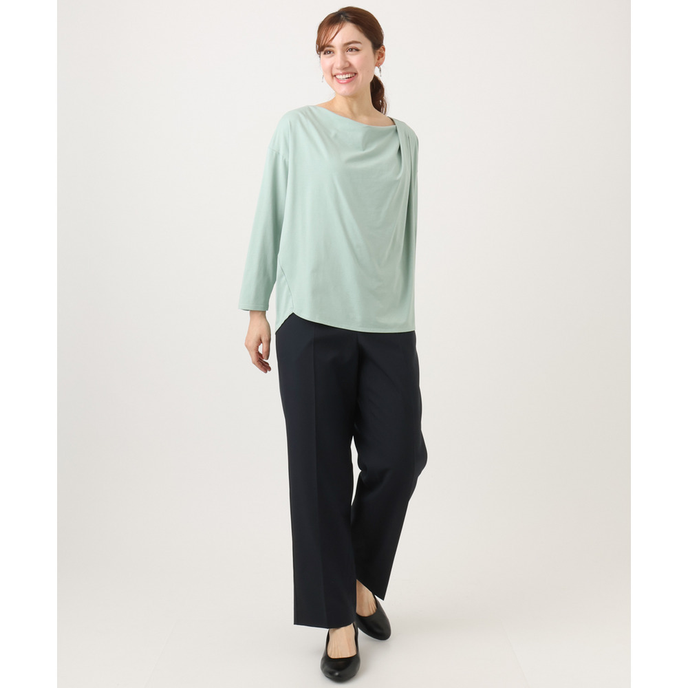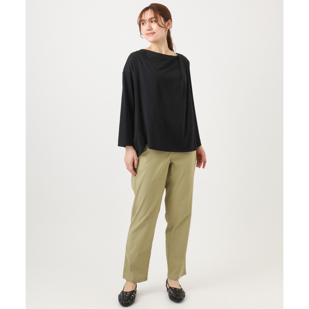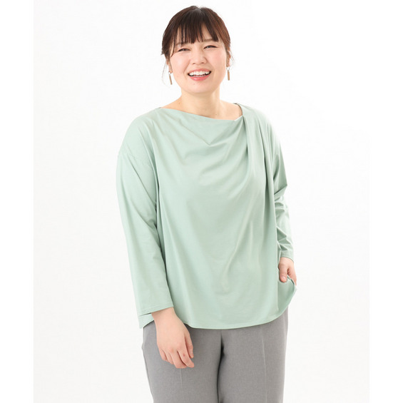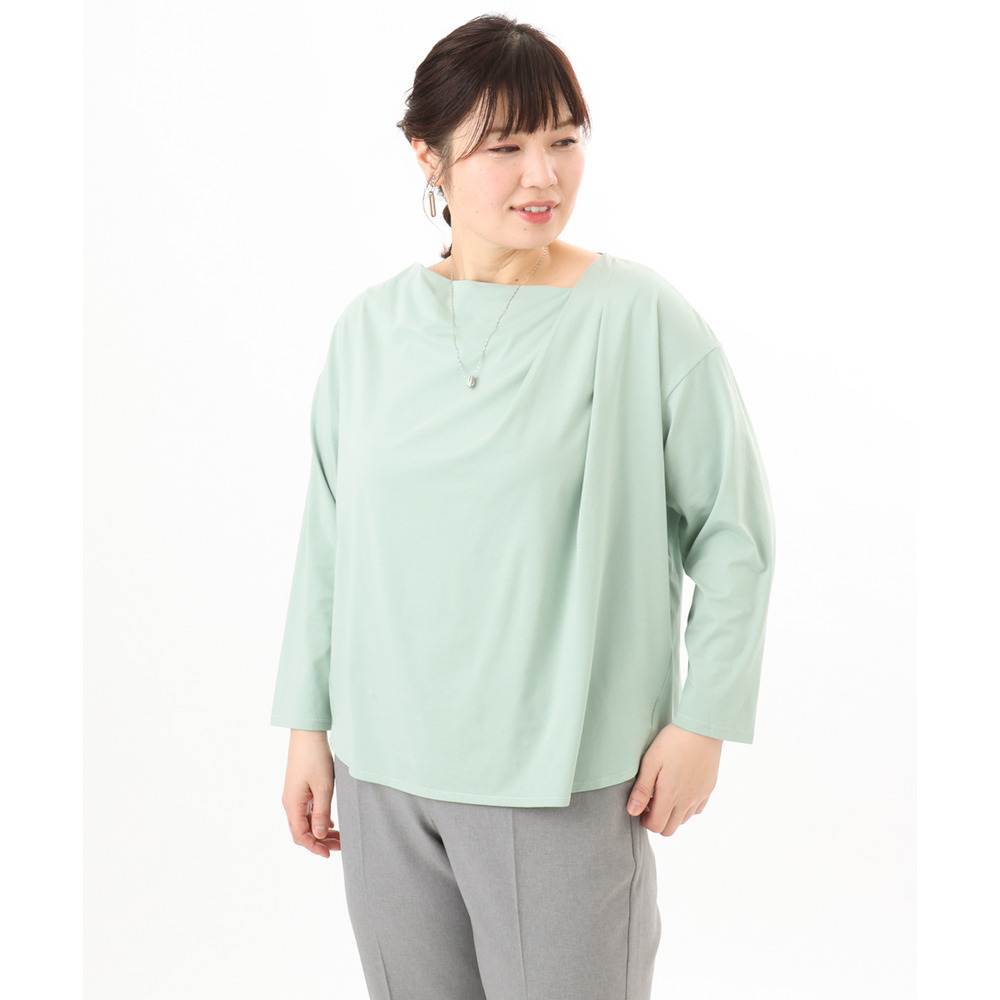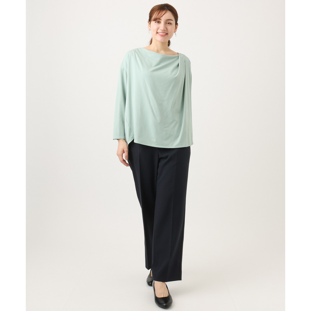 首元に自然な落ち感を生むドレープデザインで、顔周りを華やかに見せつつ上品で女性らしい印象に。