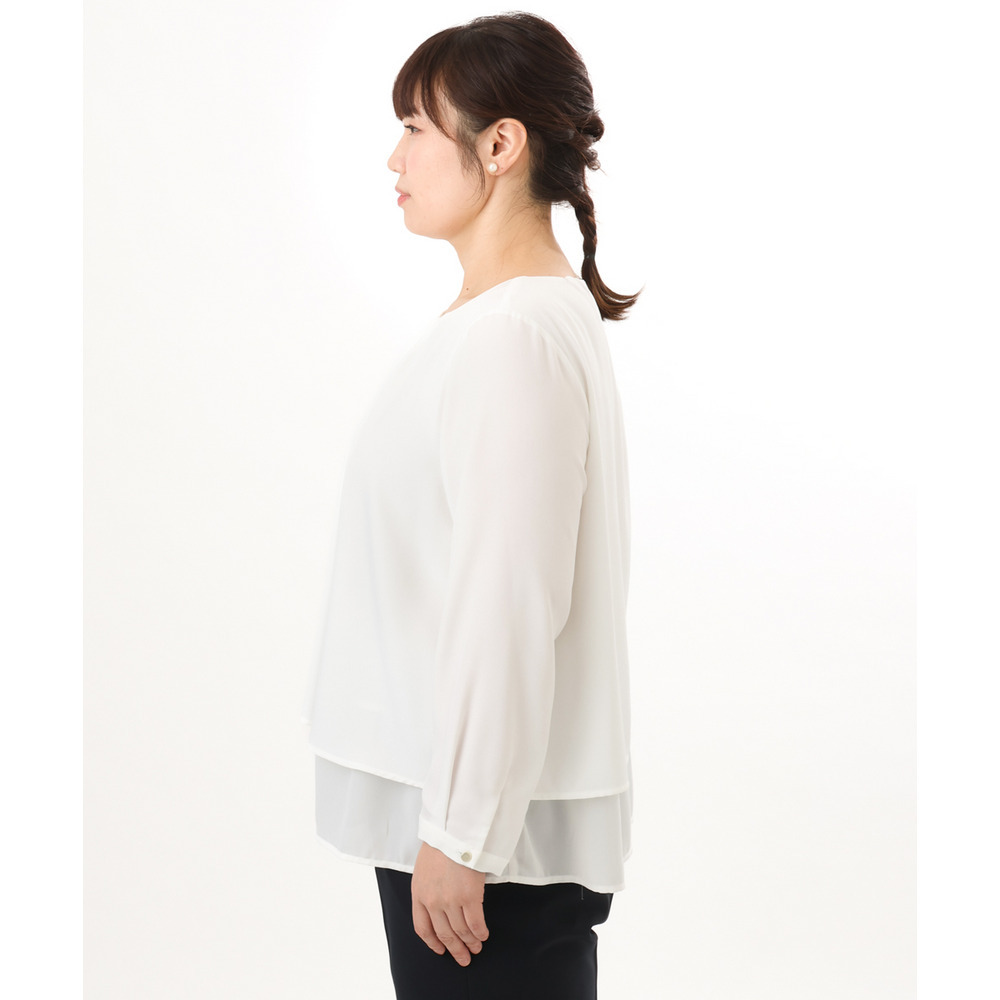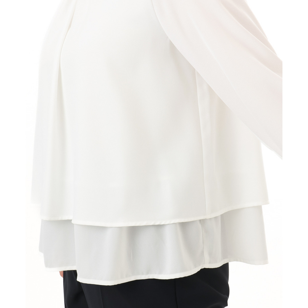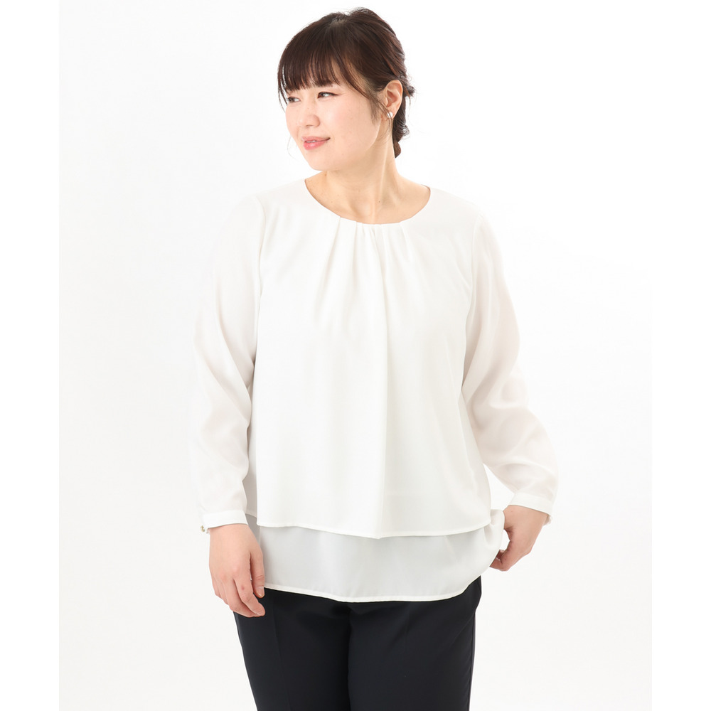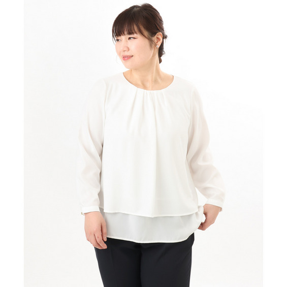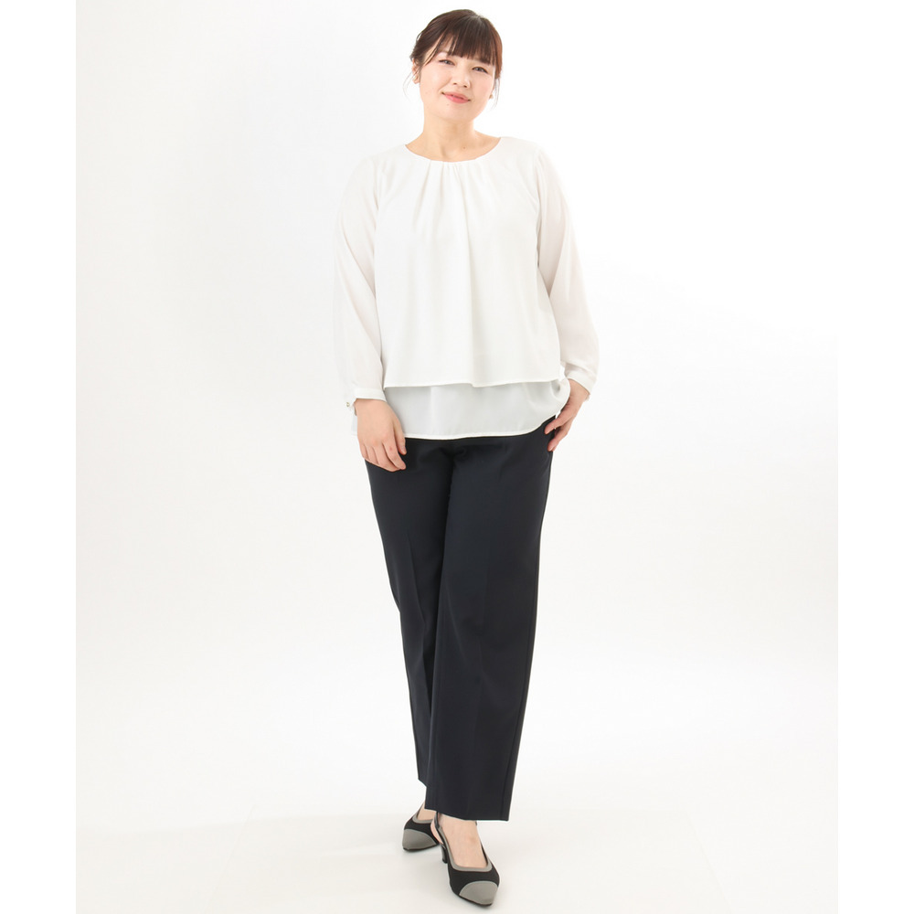 内側の1段をボトムにインしてジャケットを羽織れば、ブラウスの裾がジャケットから見えにくく、すっきりとした着こなしが完成します。