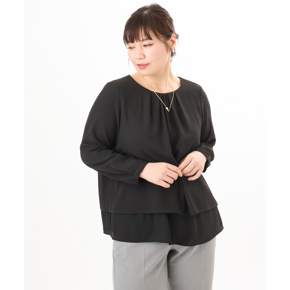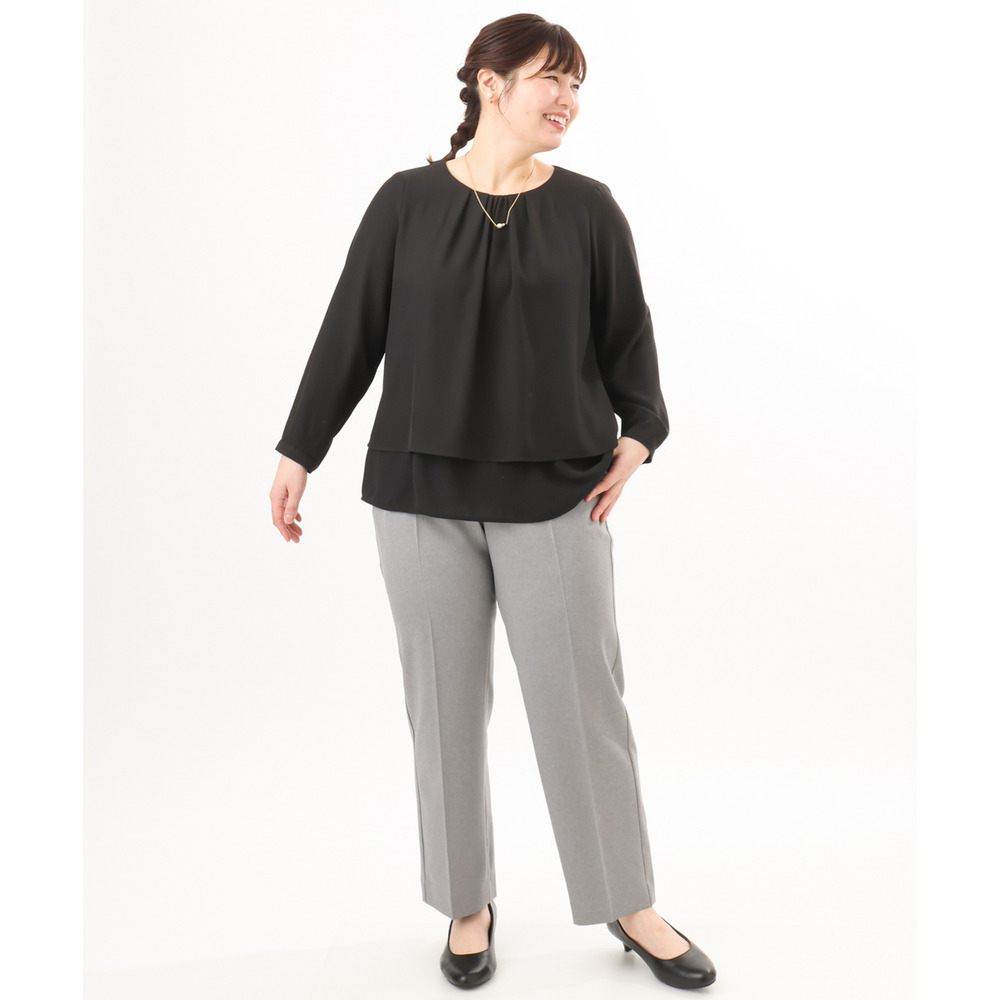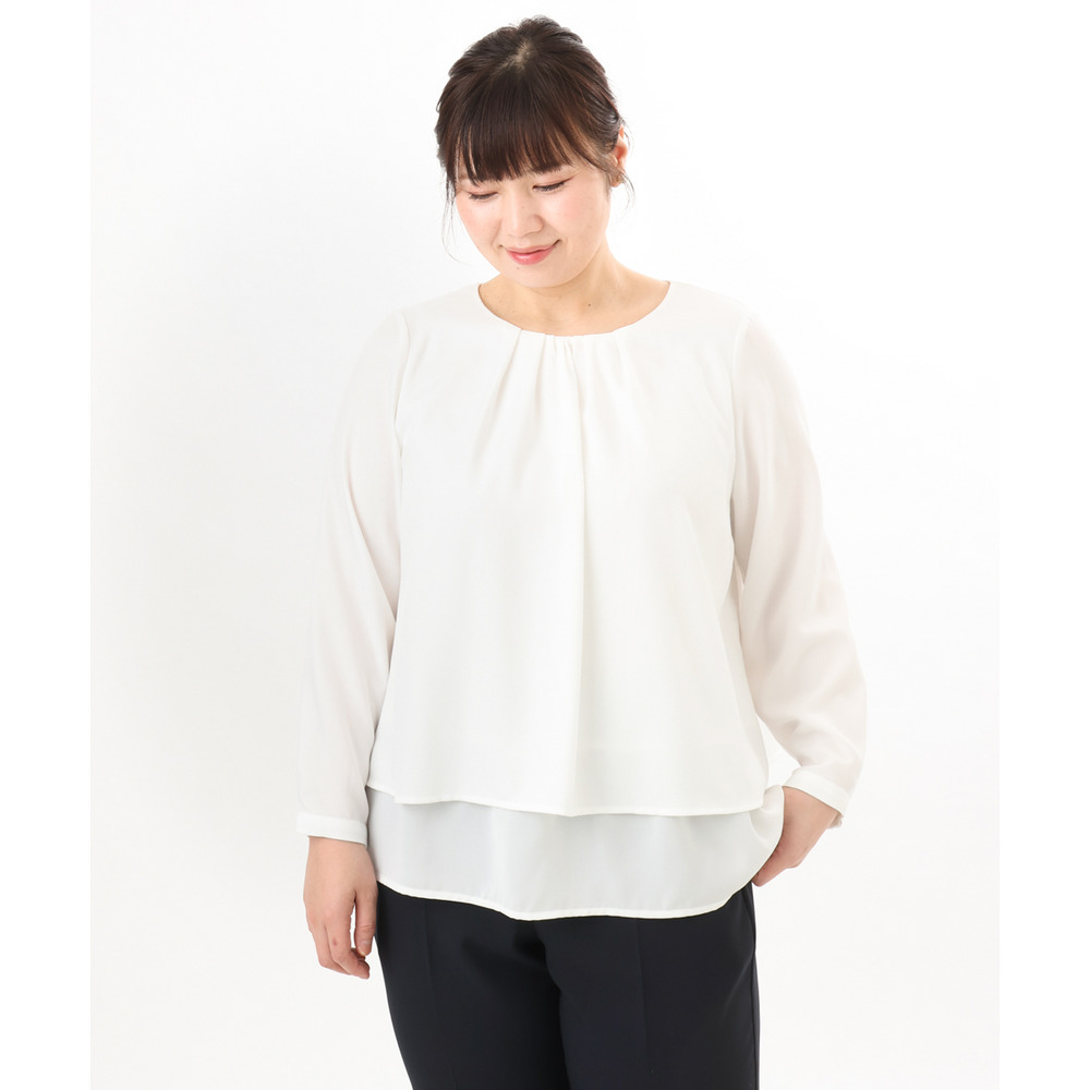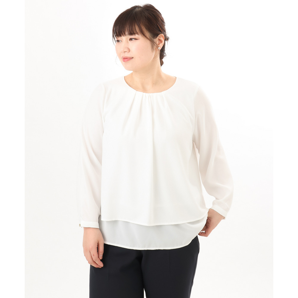 内側の1段をボトムにインしてジャケットを羽織れば、ブラウスの裾がジャケットから見えにくく、すっきりとした着こなしが完成します。