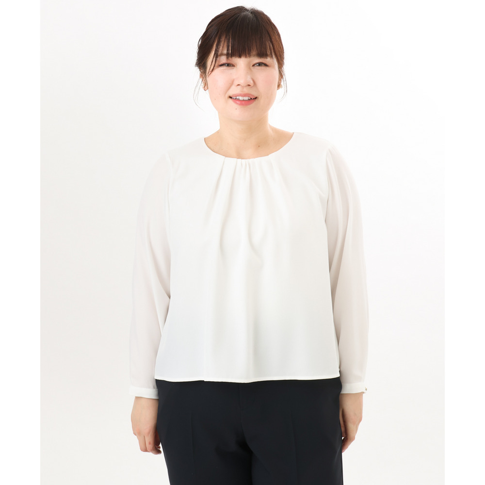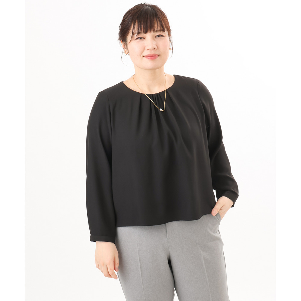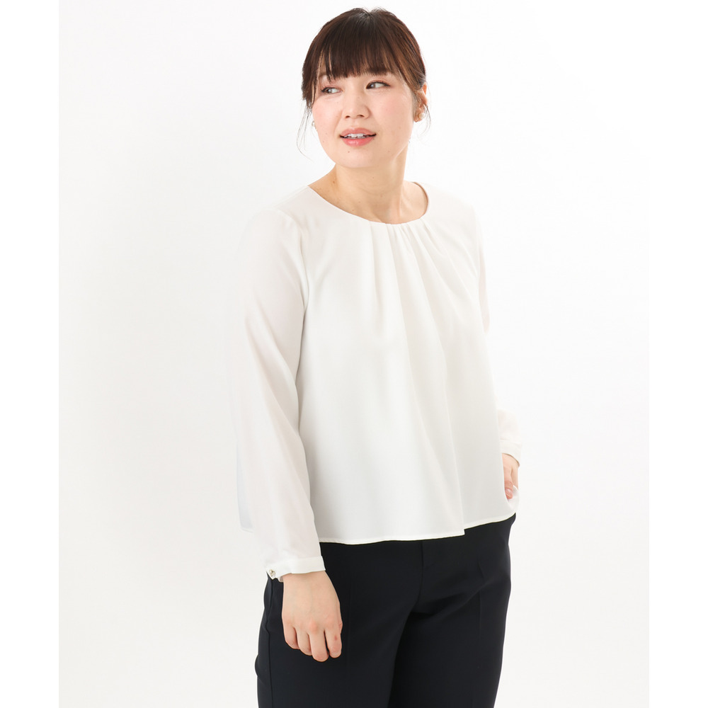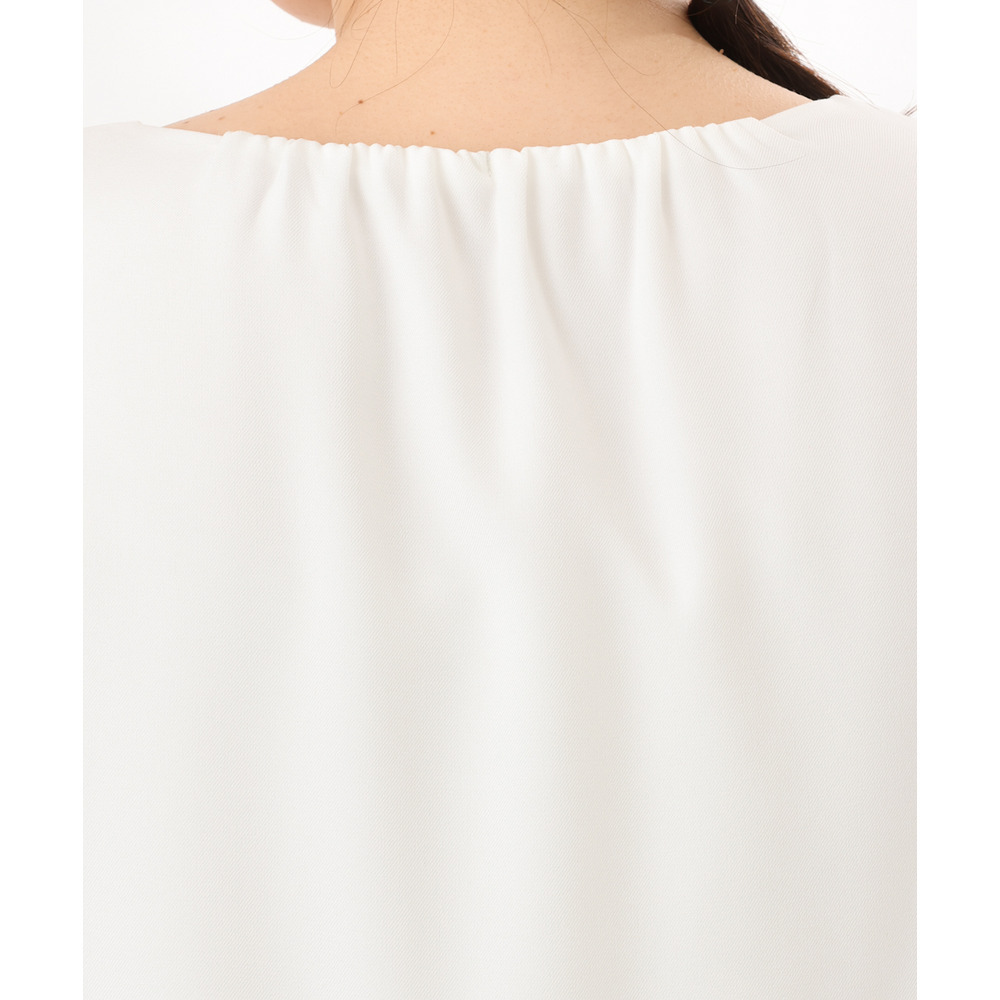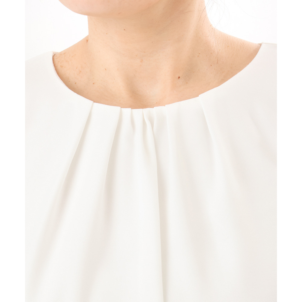 胸元にはさりげなくギャザーを施し、顔まわりをやわらかく上品な印象に。