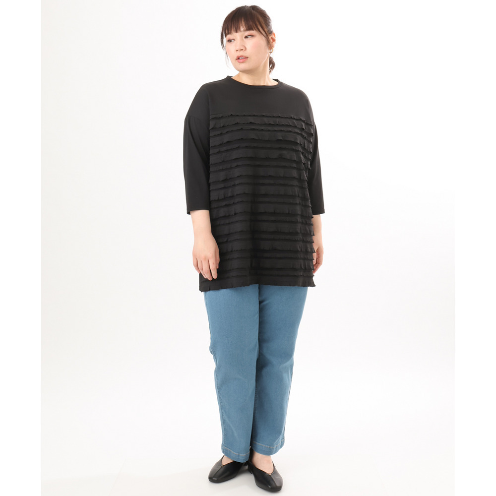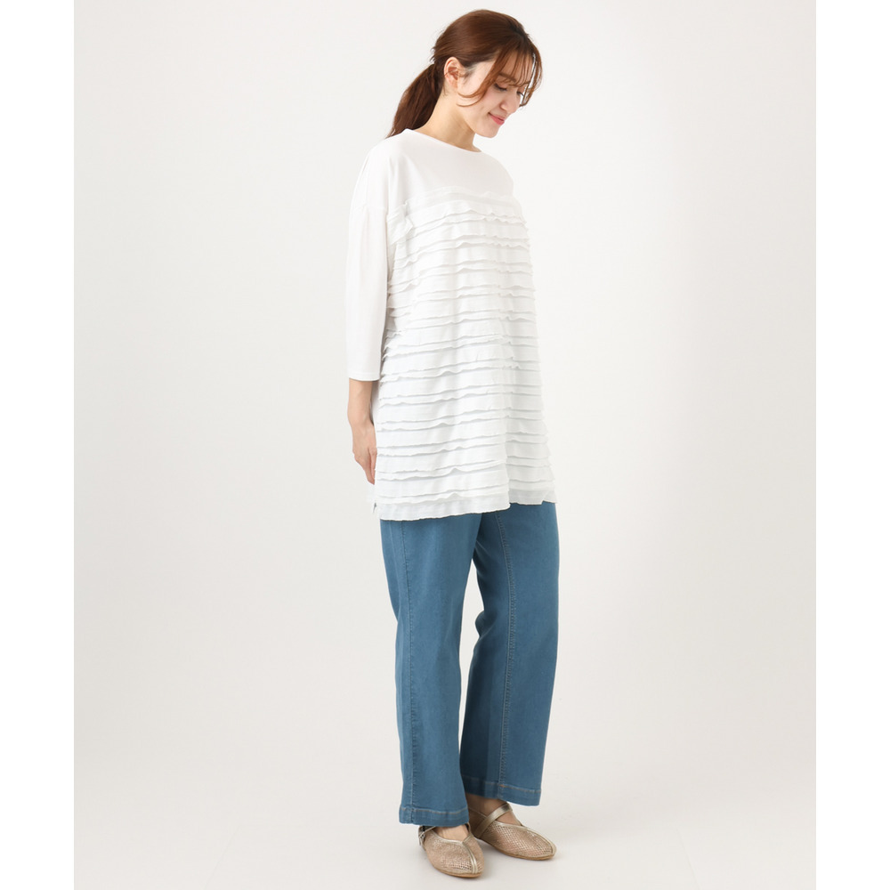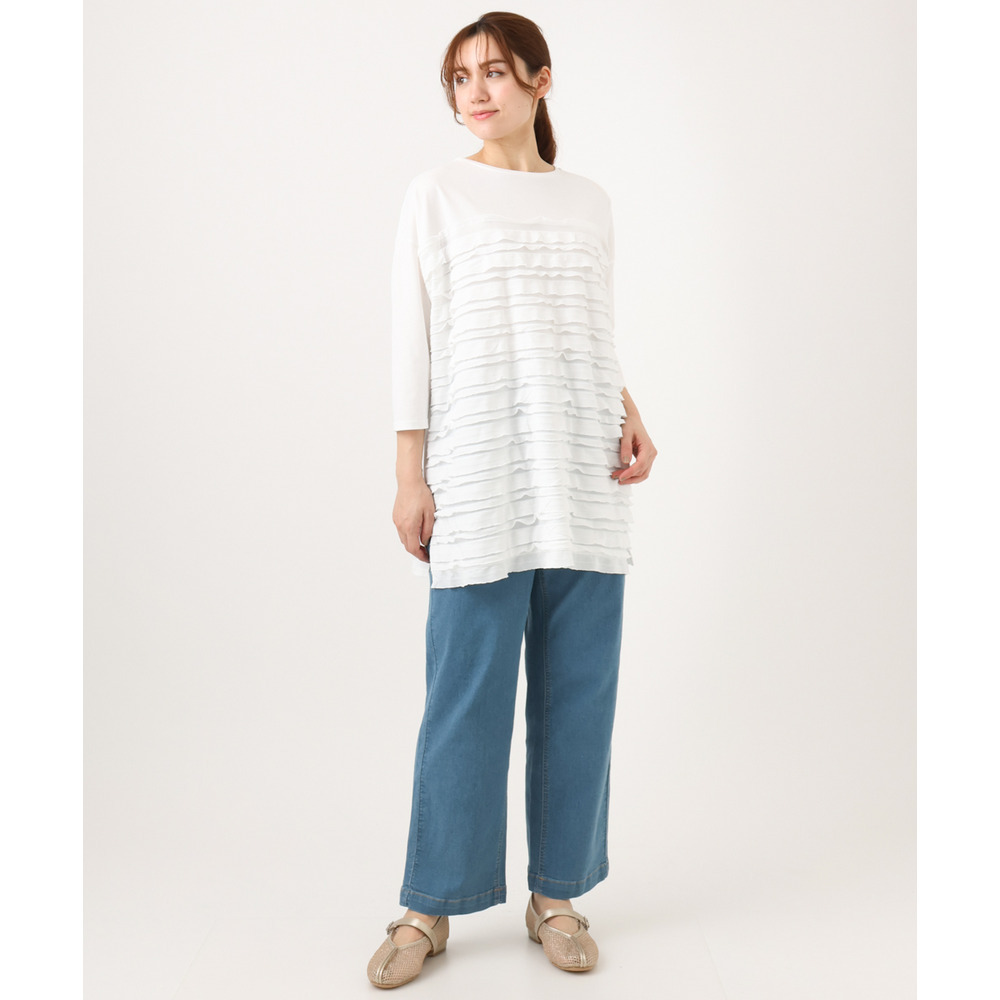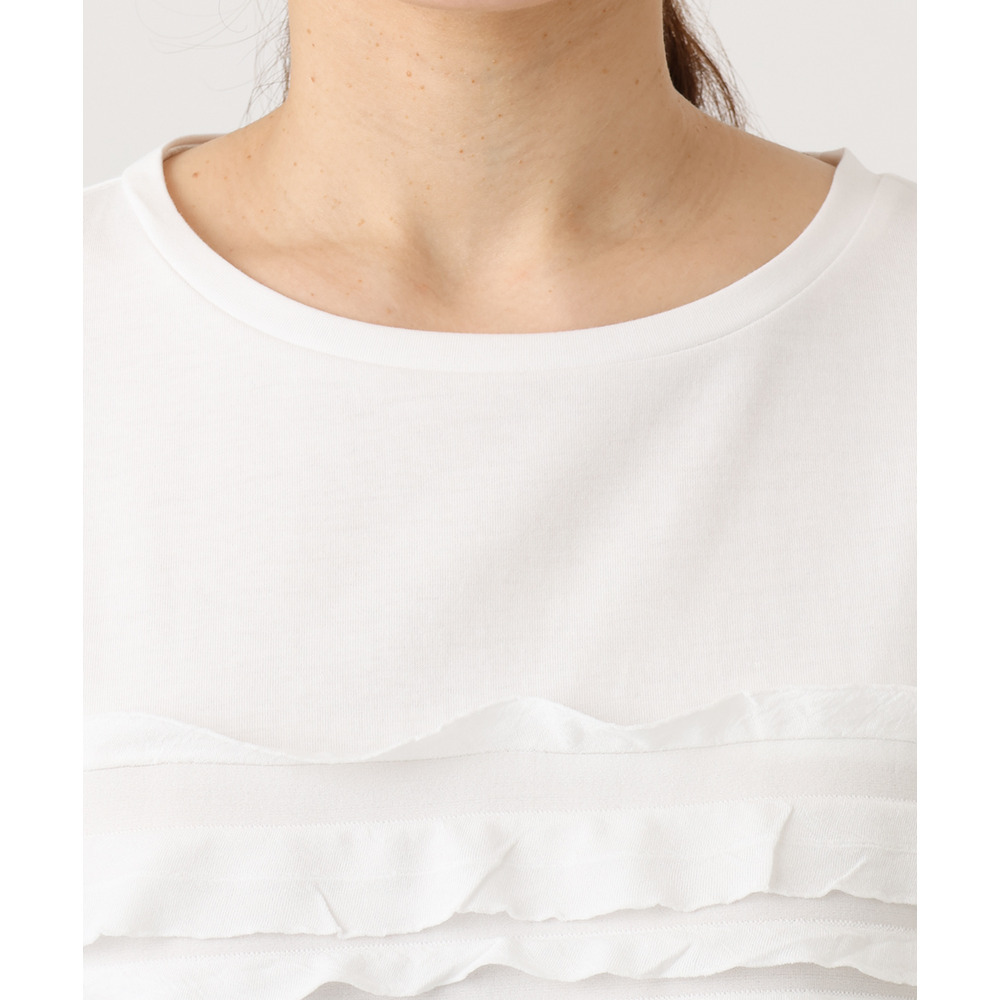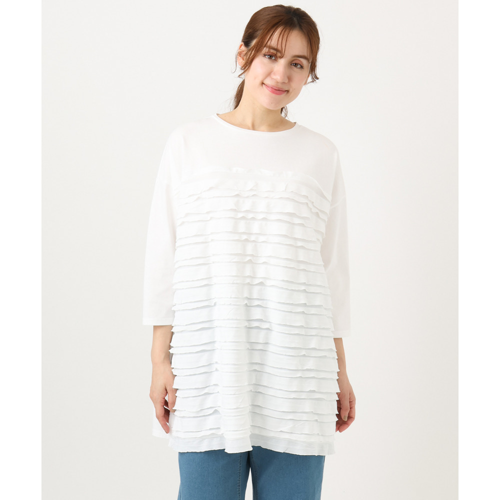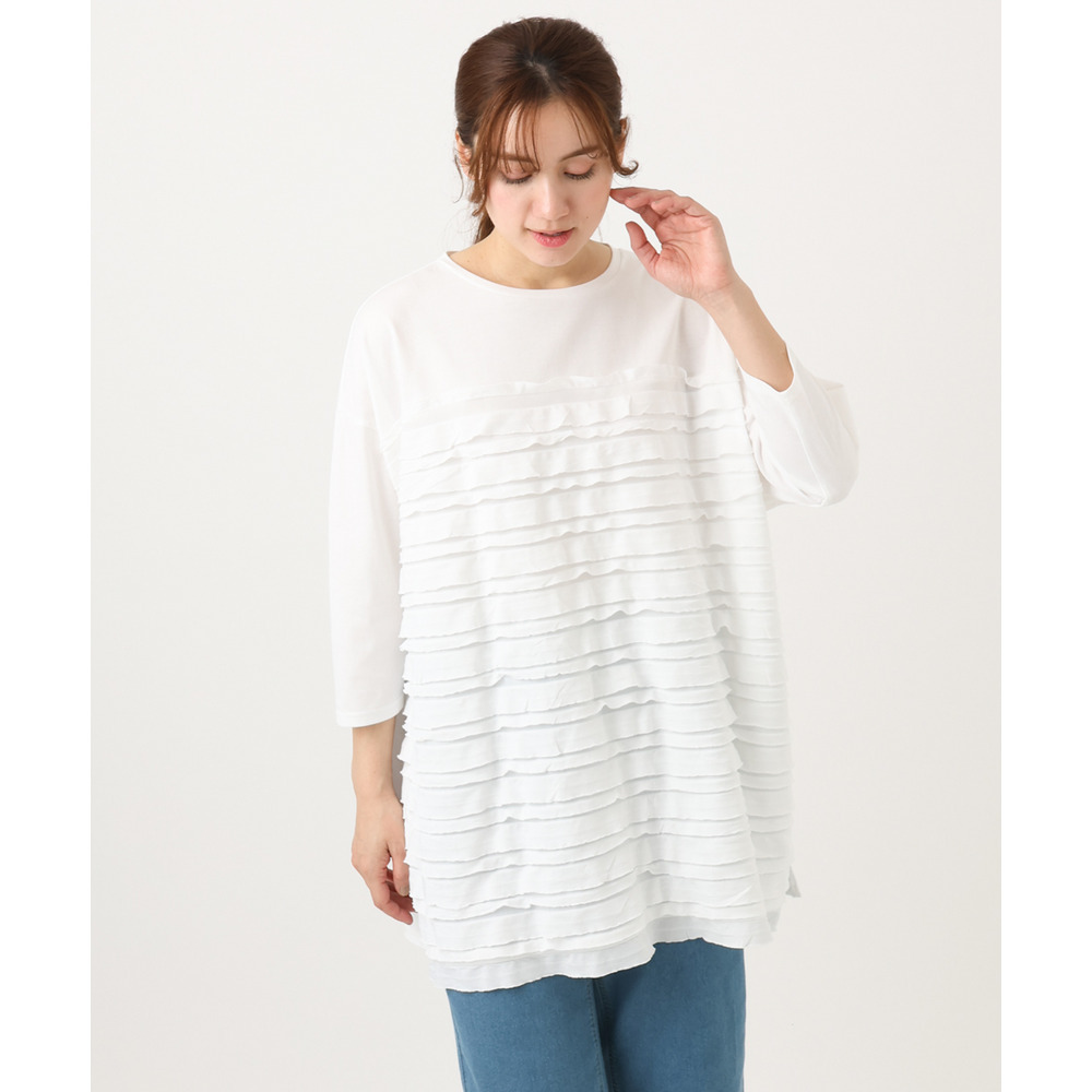 ランダムに重ねたティアードフリルは甘くなりすぎず、大人の女性にも取り入れやすい上品な仕上がり。