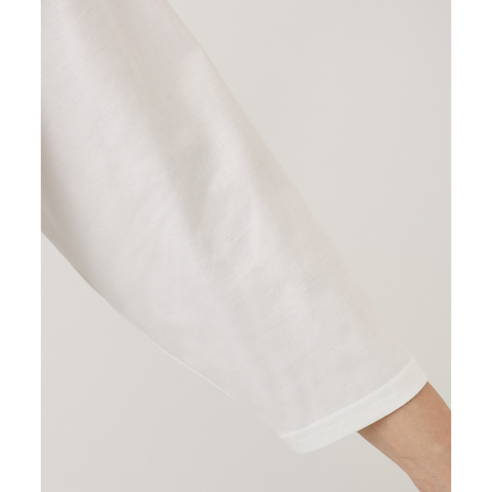 胸元で無地に切り替えたデザインにより、肩回りはボリュームが出すぎず、すっきりとした印象で着用いただけます。