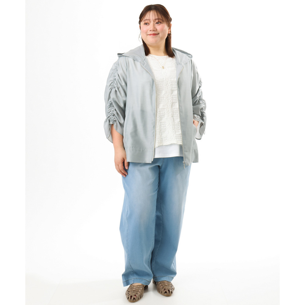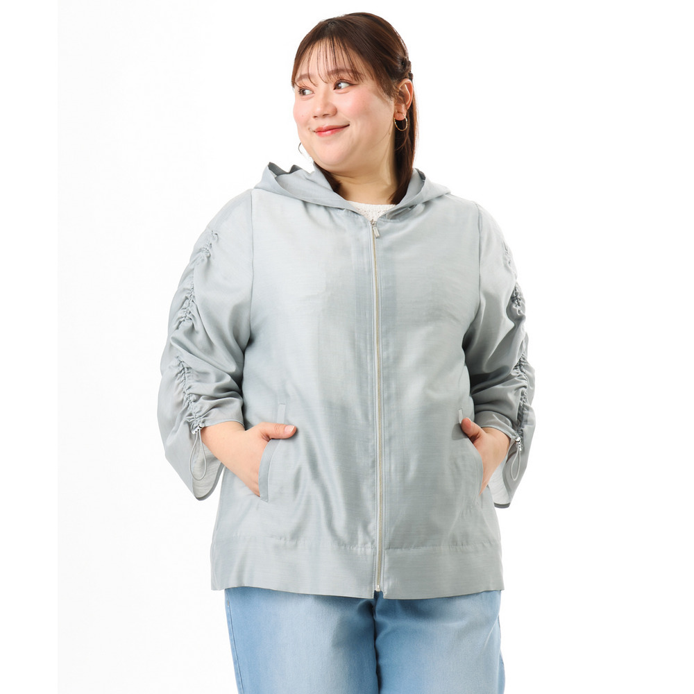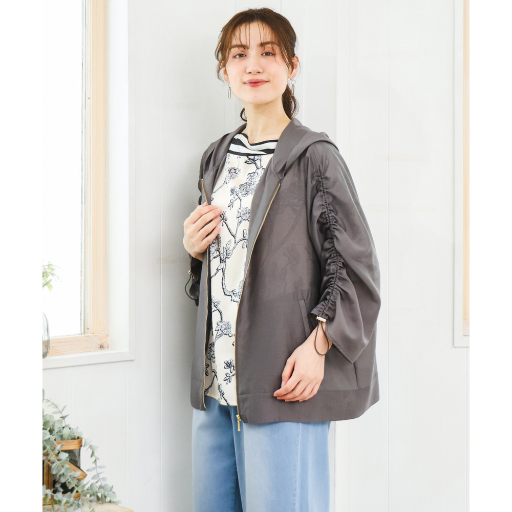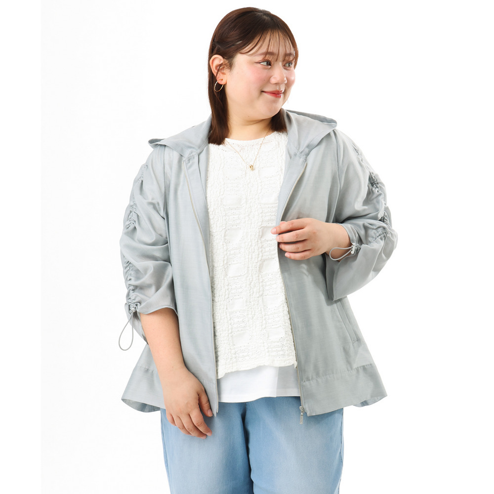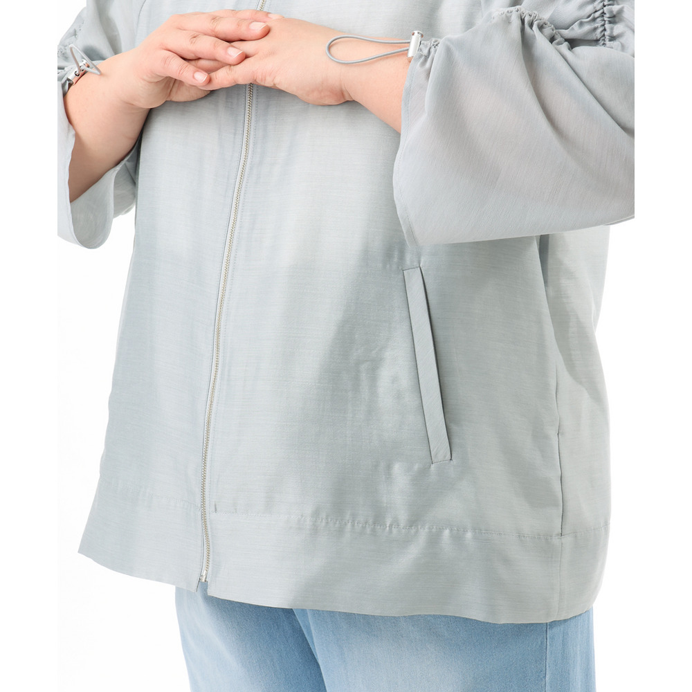 袖はギャザーデザインにストリングを入れており、好みに合わせて丈感を調節可能。