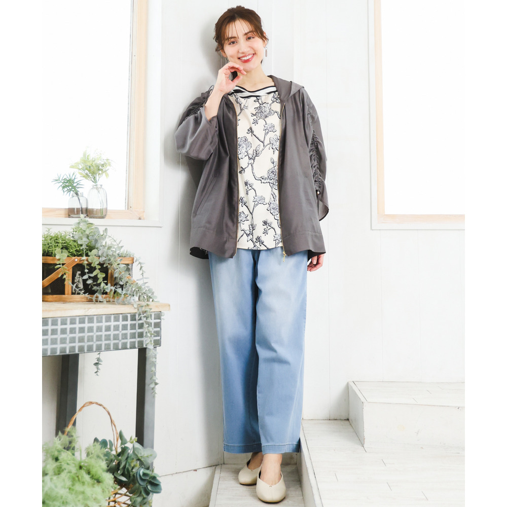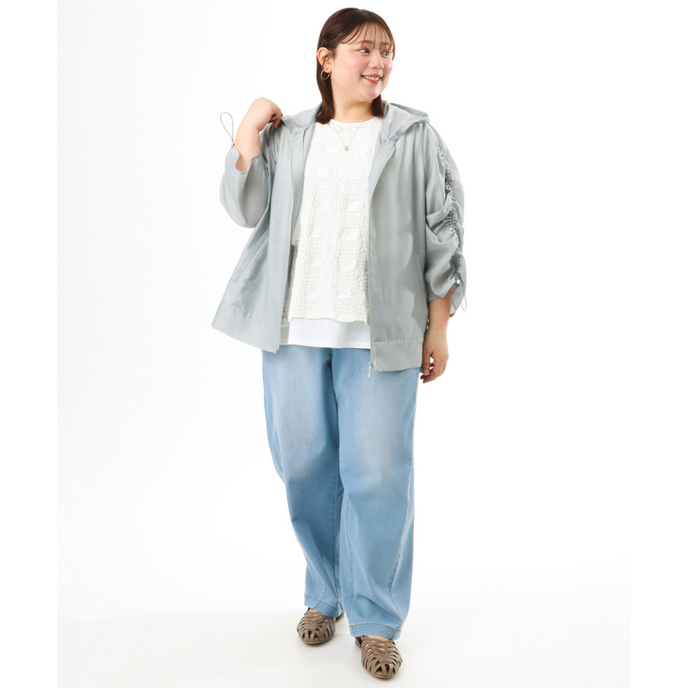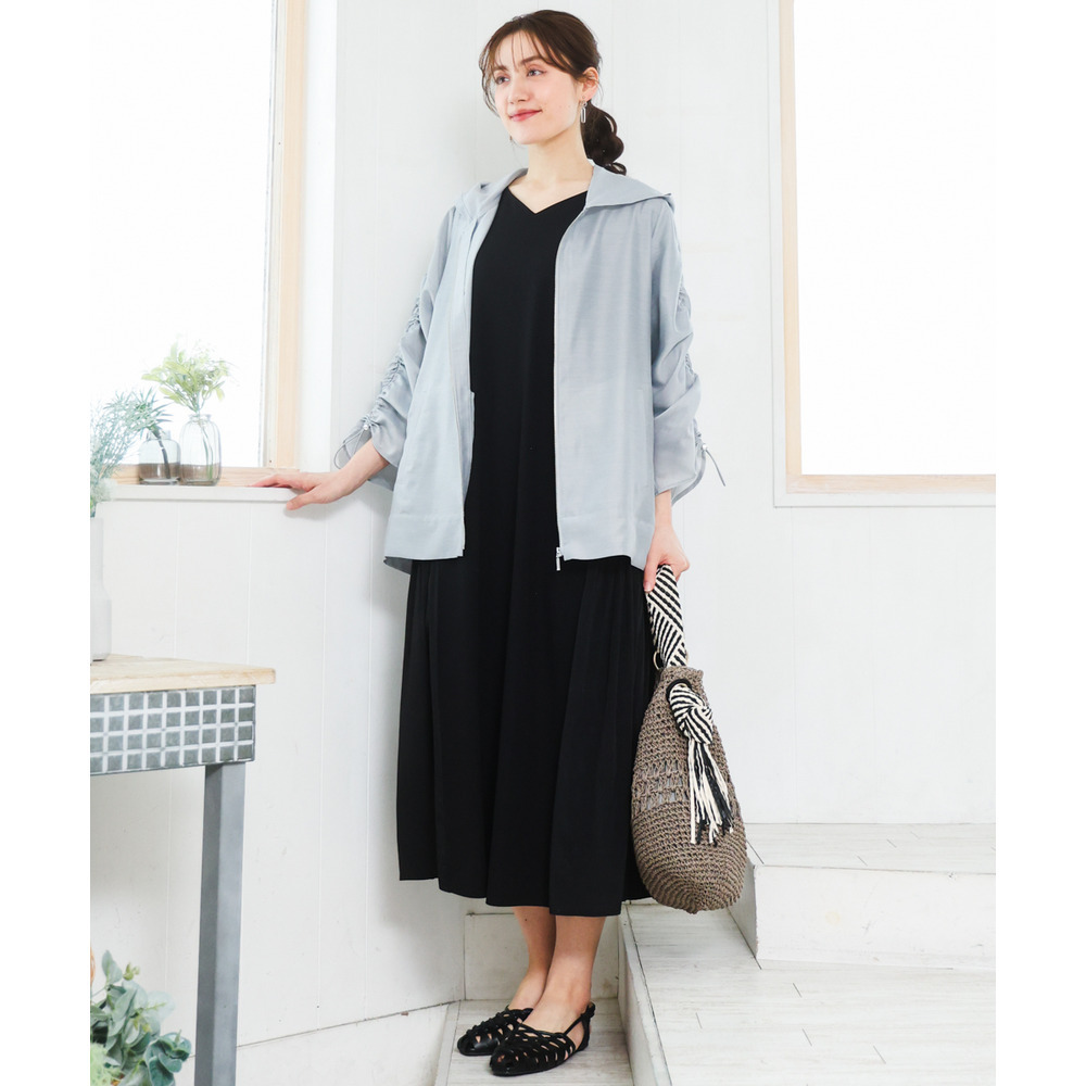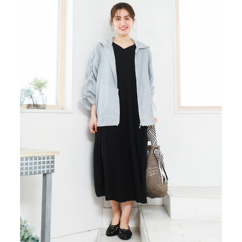 袖はギャザーデザインにストリングを入れており、好みに合わせて丈感を調節可能。