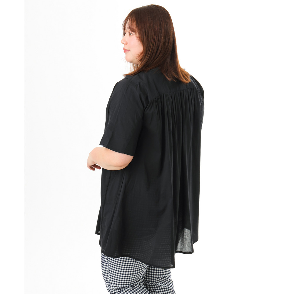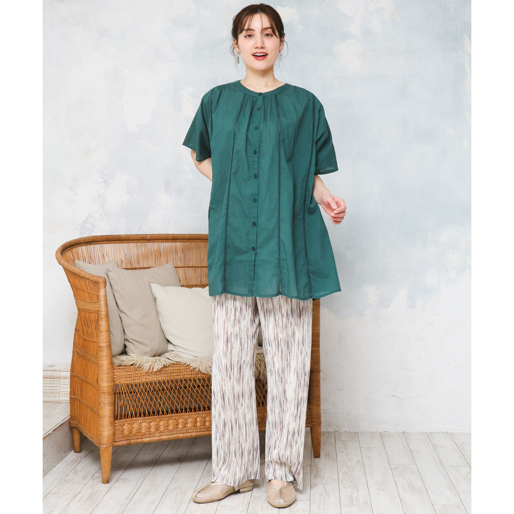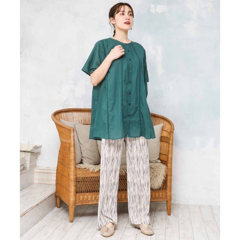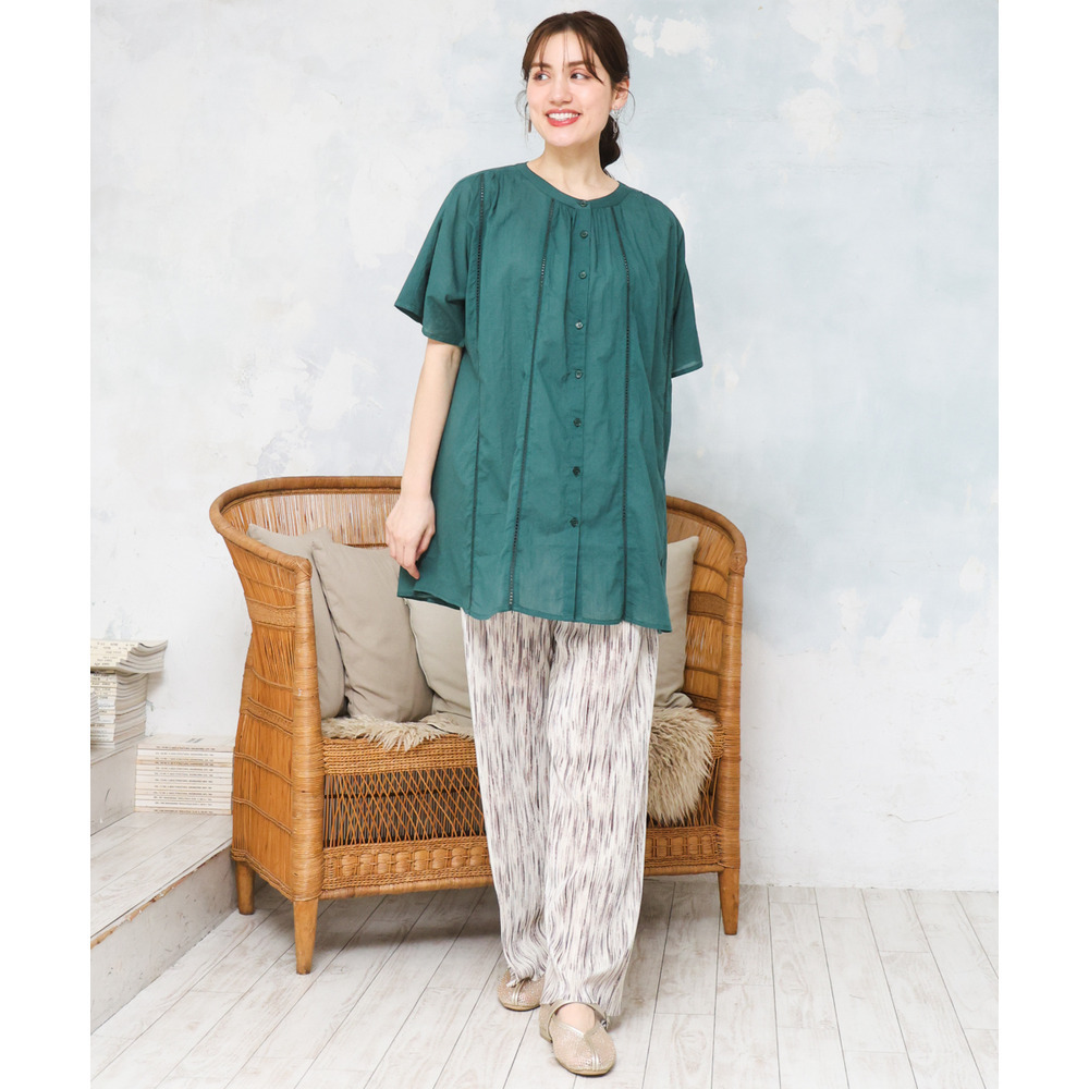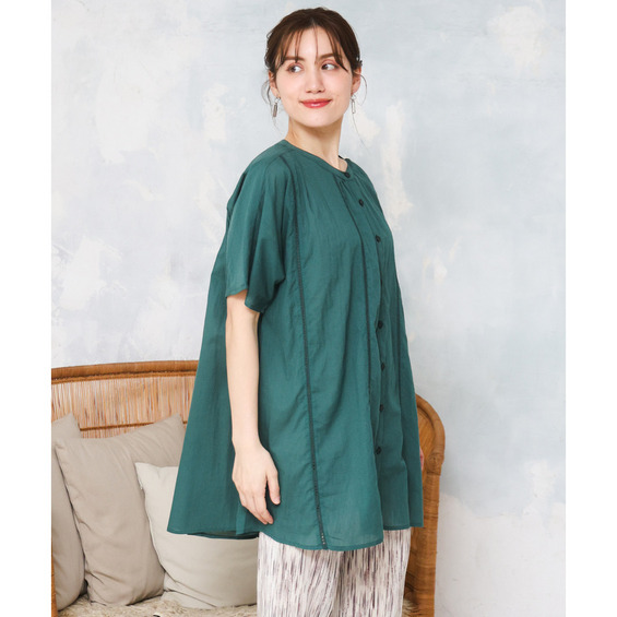 前開き仕様なので、ブラウスとしてはもちろん、軽い羽織りとしても着回し可能でコーディネートの幅が広がります。