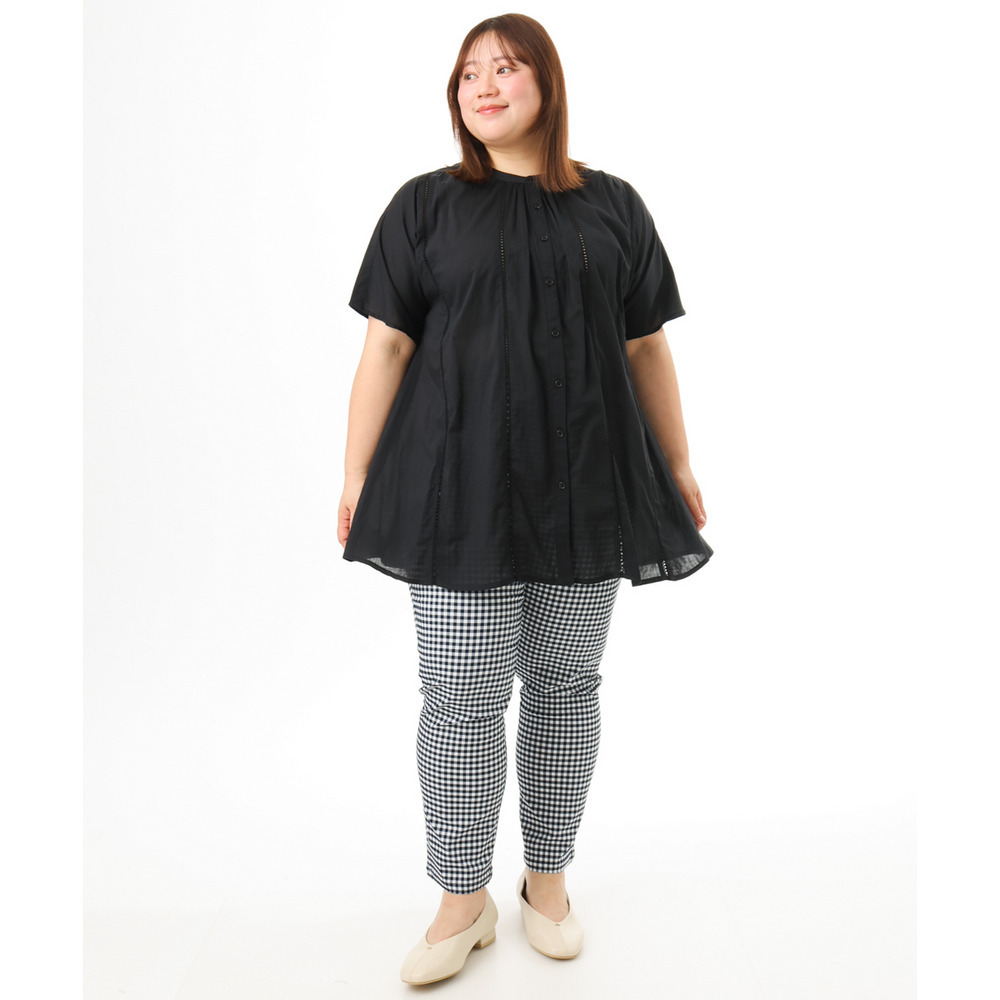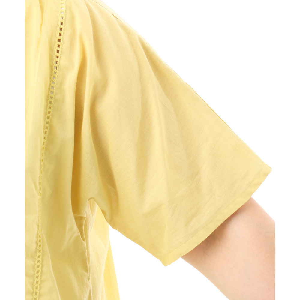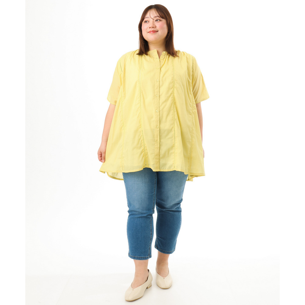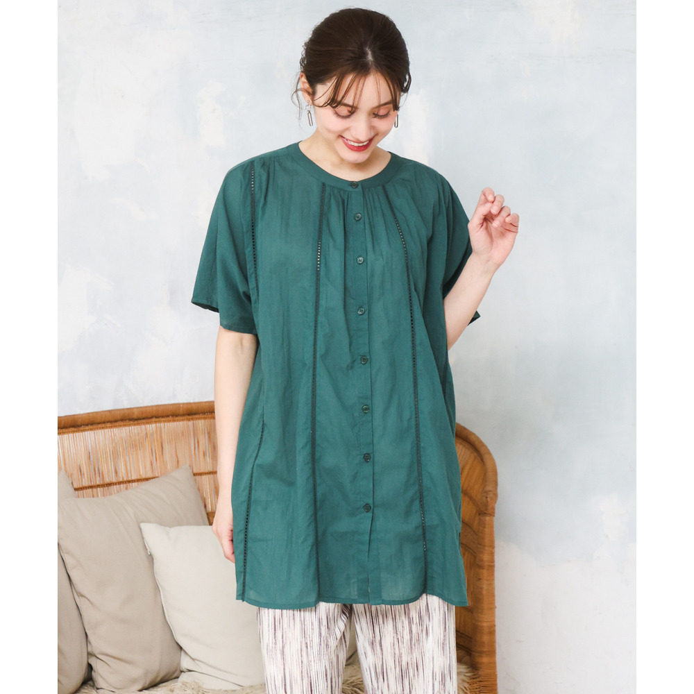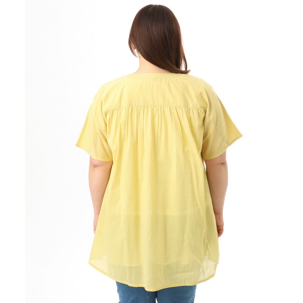 前開き仕様なので、ブラウスとしてはもちろん、軽い羽織りとしても着回し可能でコーディネートの幅が広がります。