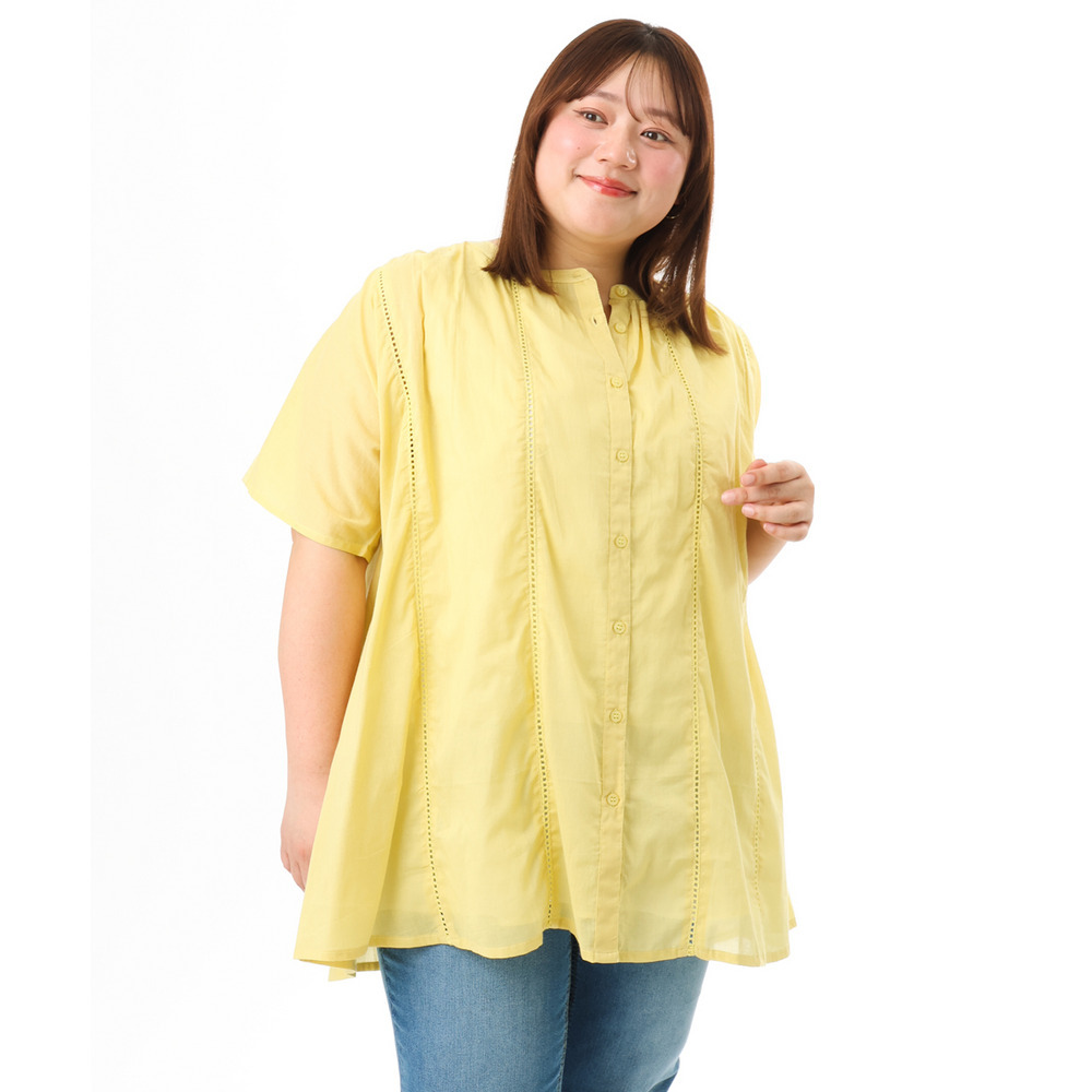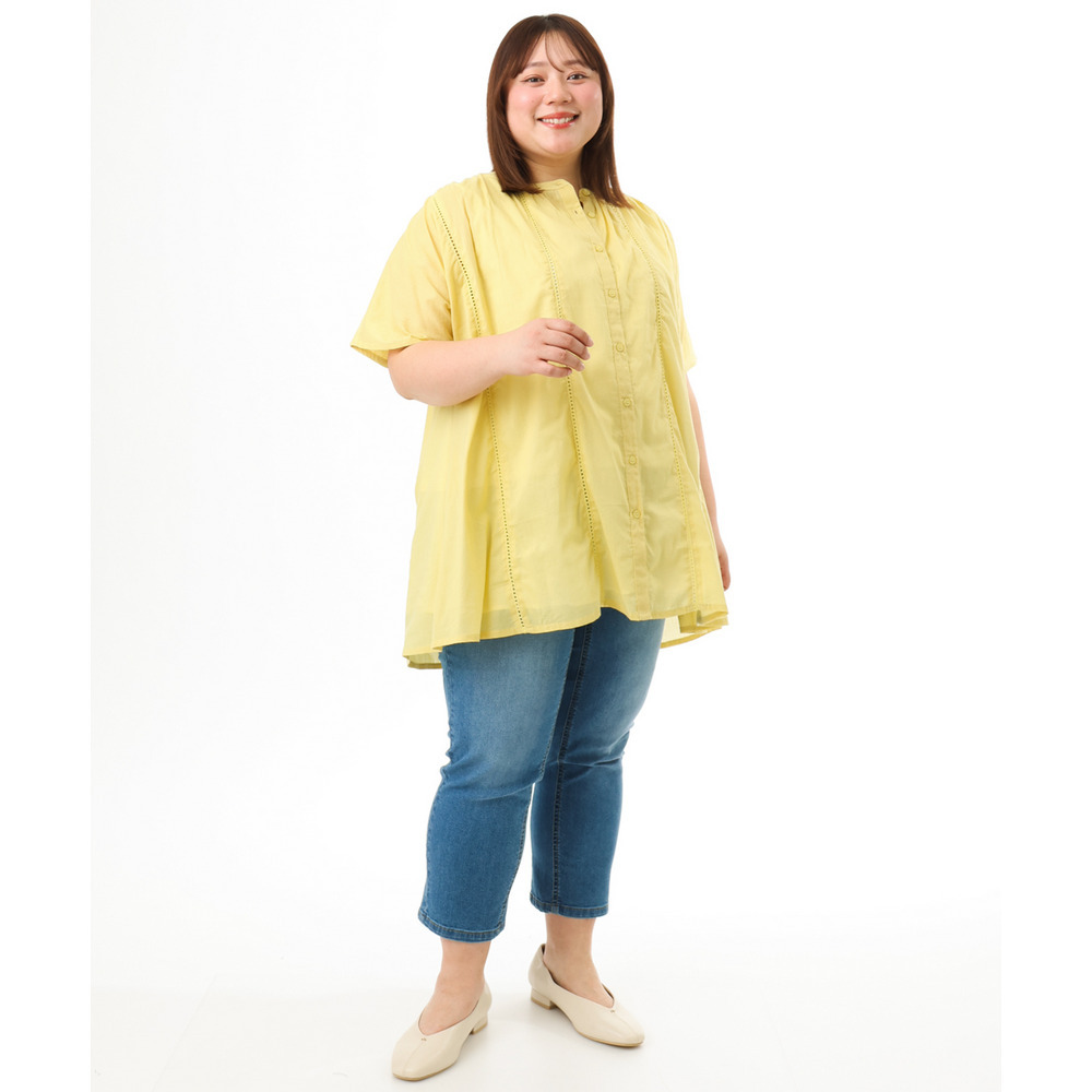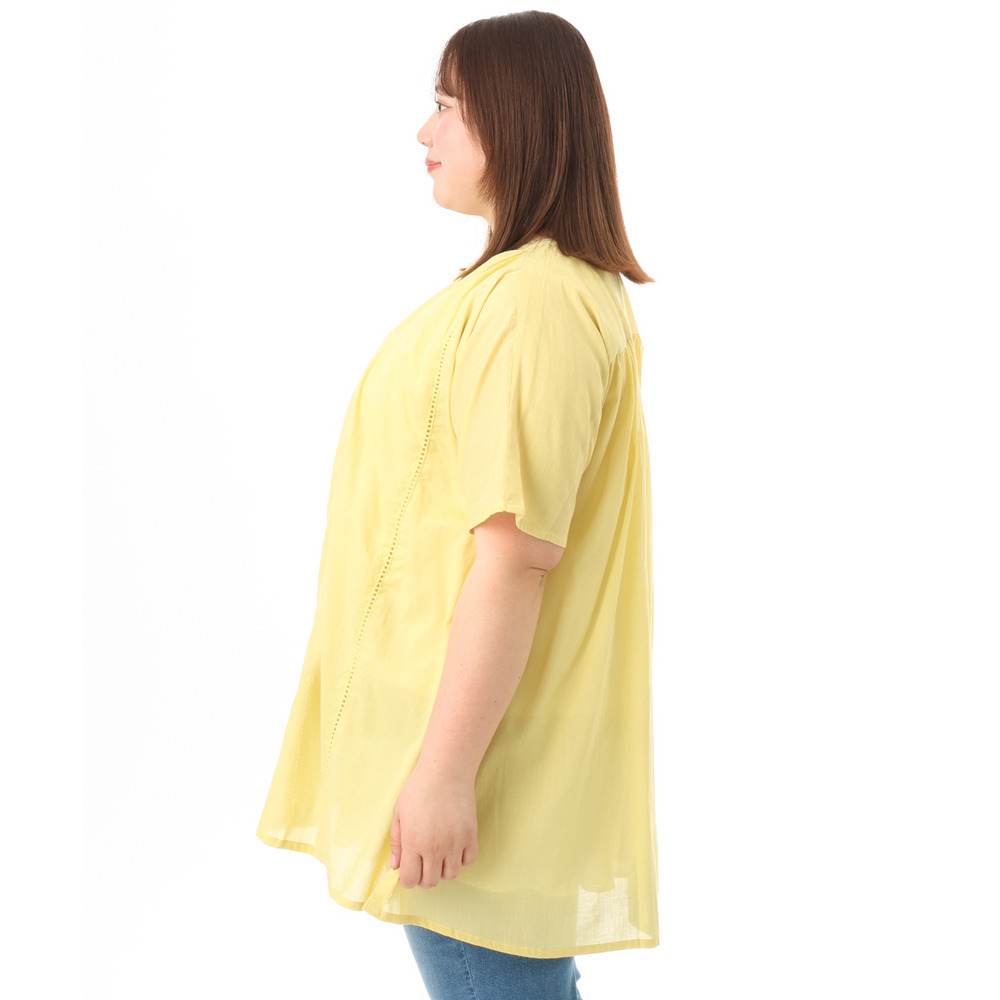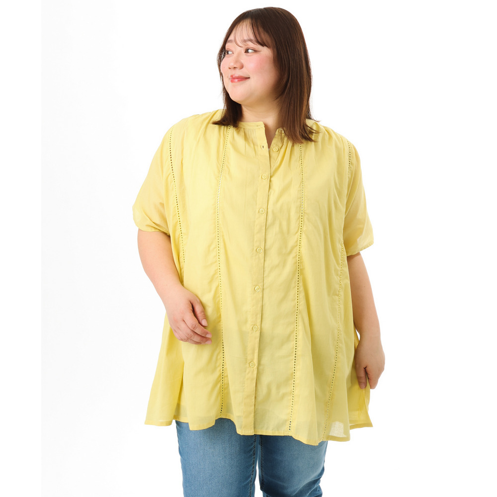 前開き仕様なので、ブラウスとしてはもちろん、軽い羽織りとしても着回し可能でコーディネートの幅が広がります。