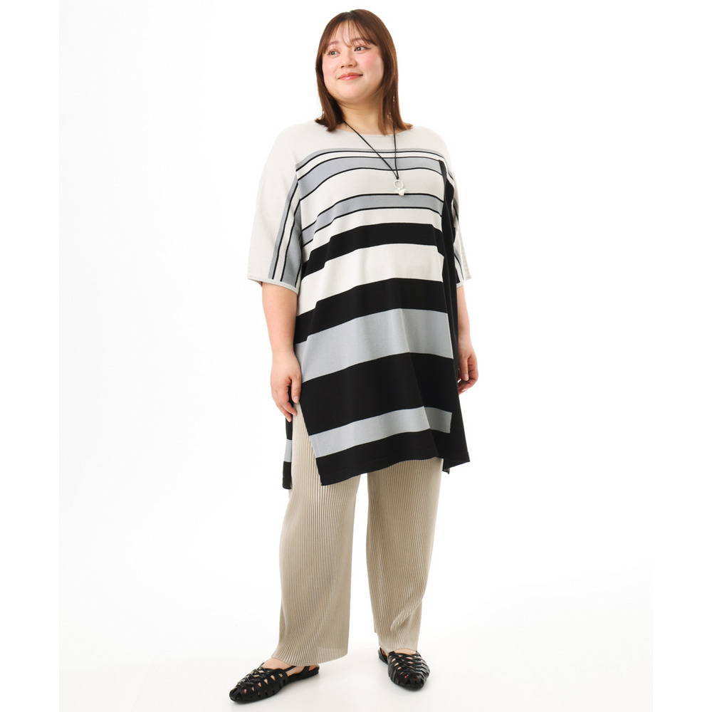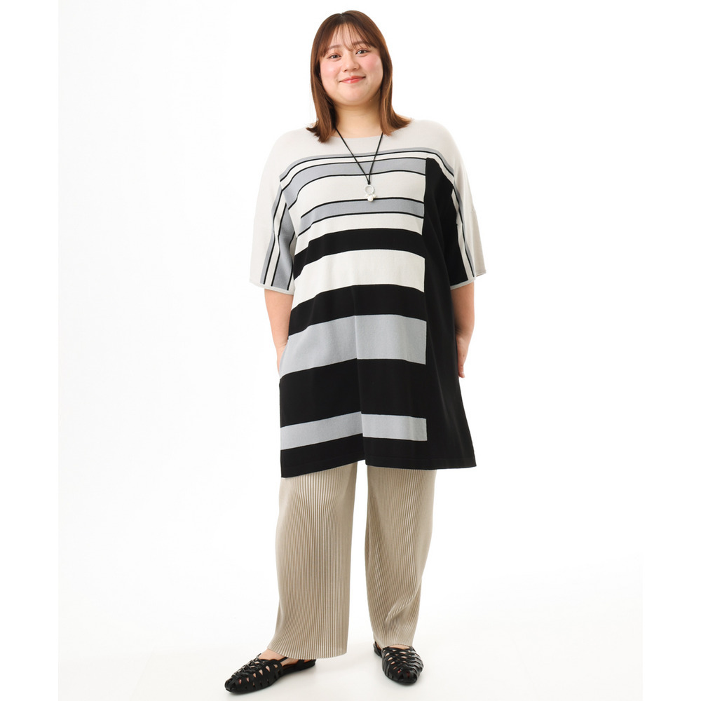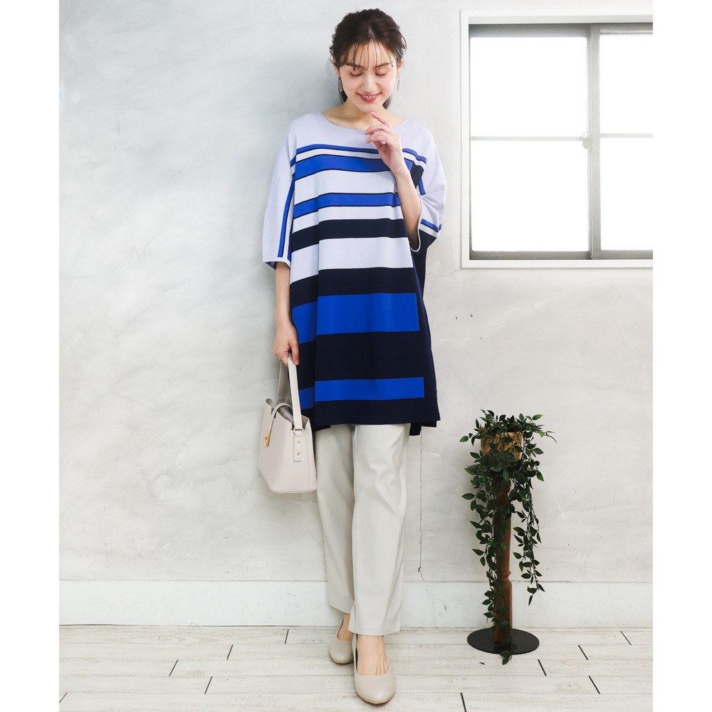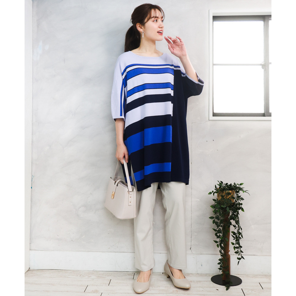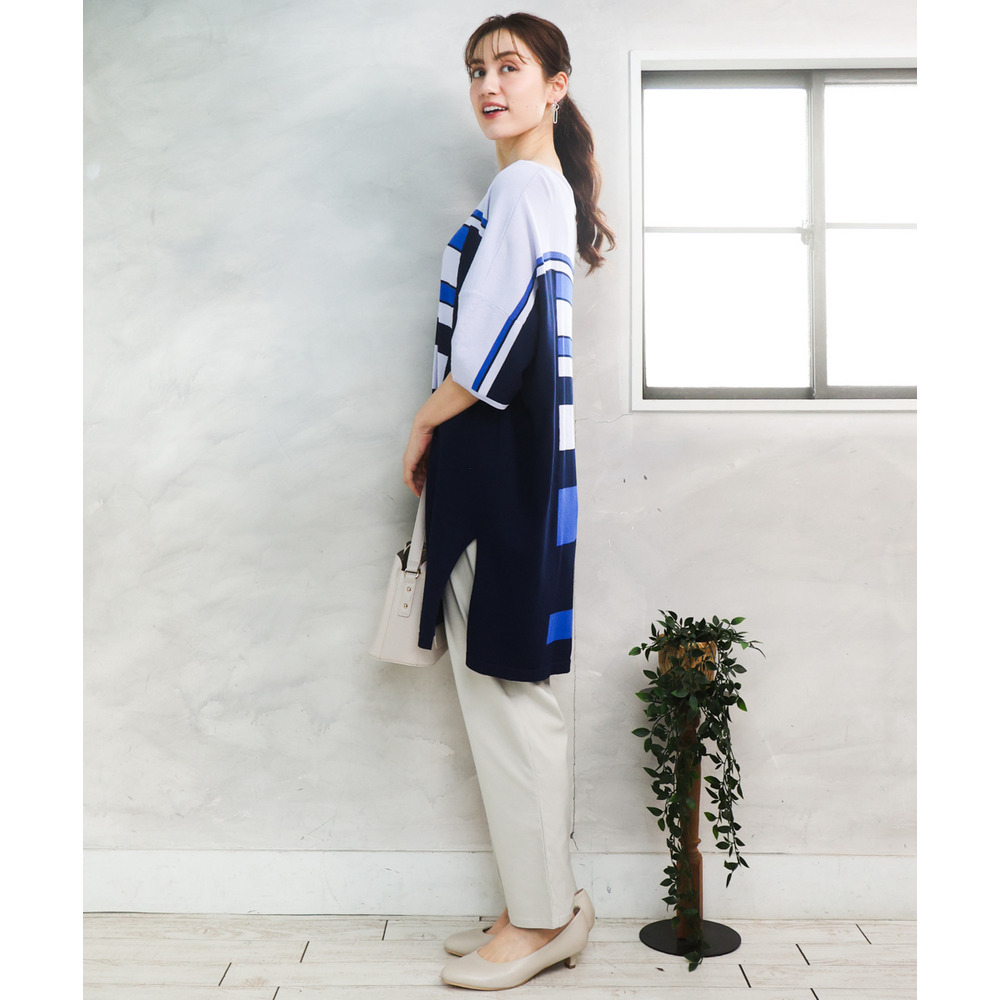 気になる二の腕をカバーしてくれる袖丈と、ヒップ周りをさりげなくカバーするチュニック丈で、リラックス感のある着こなしに。