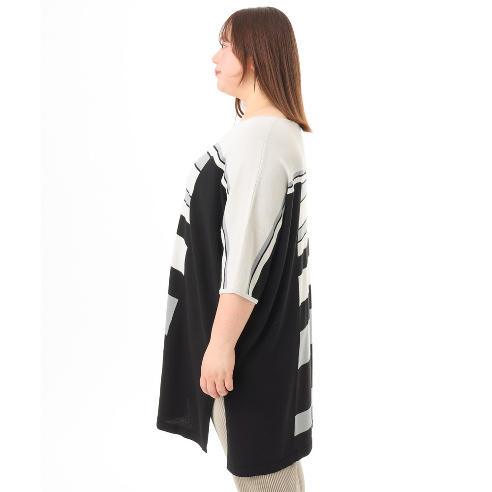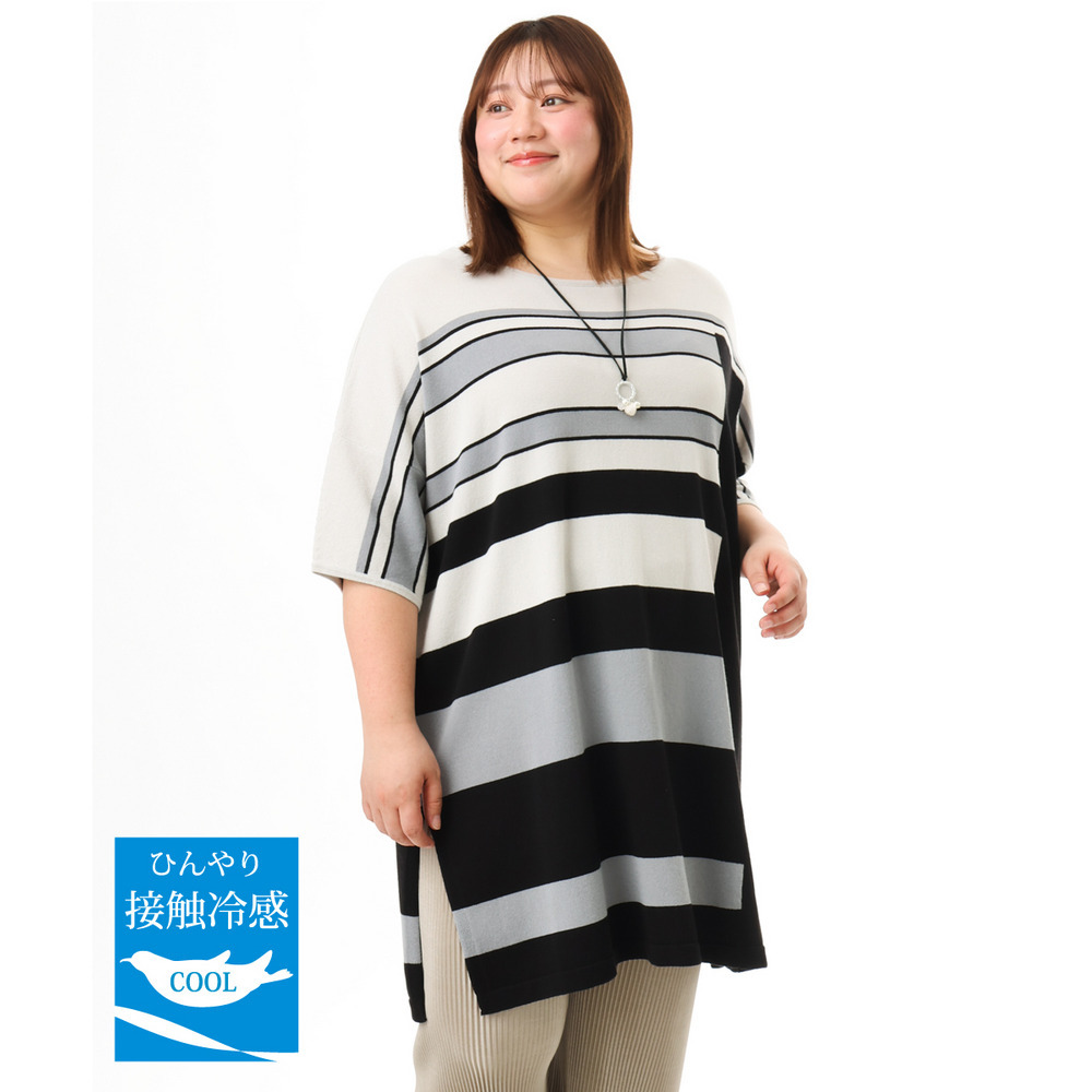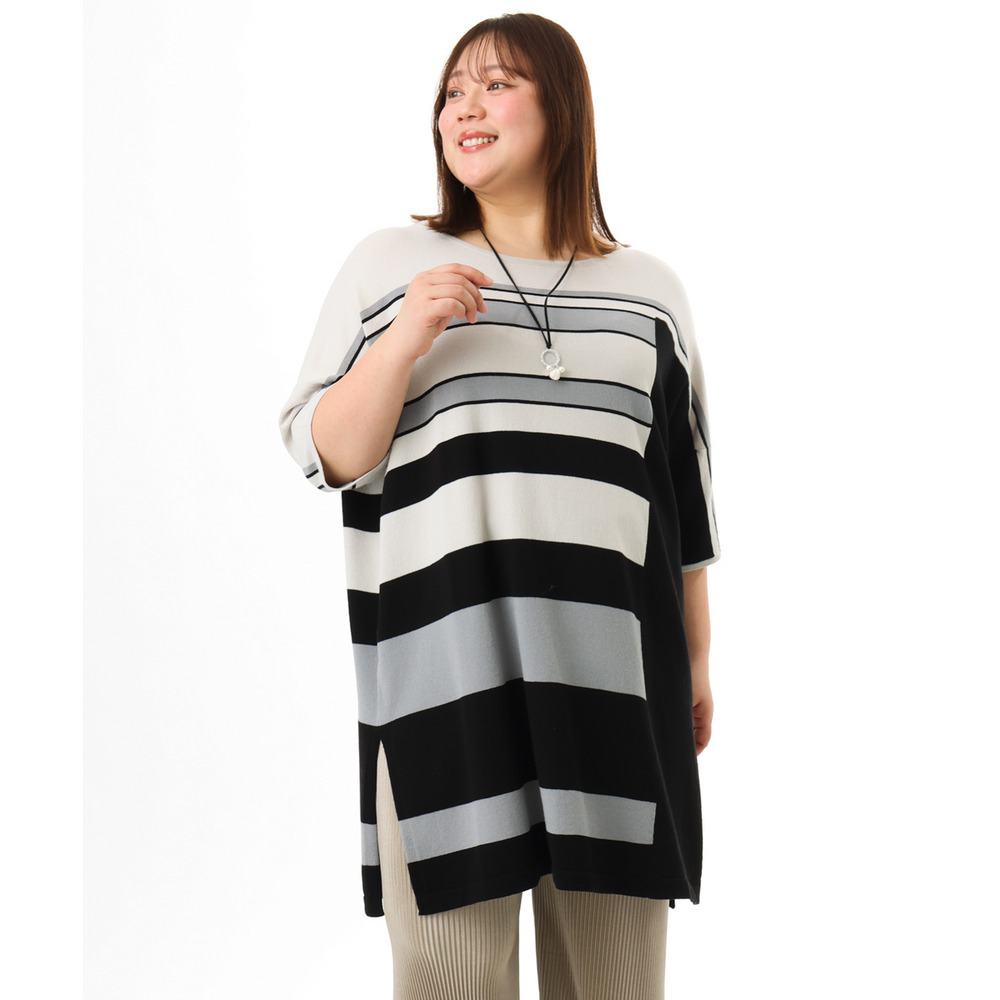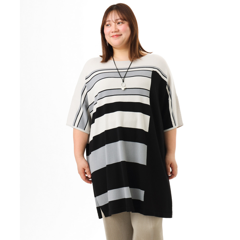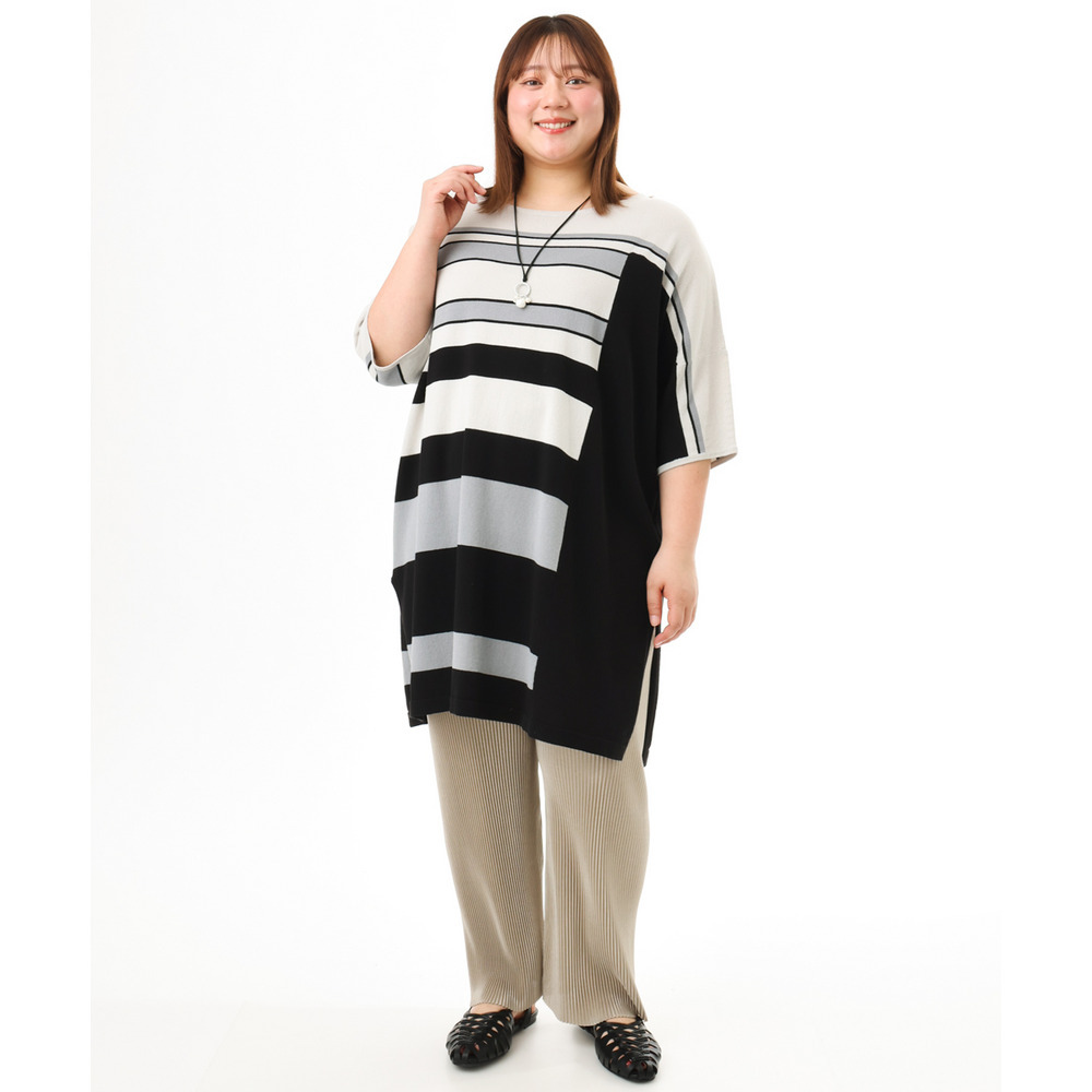 気になる二の腕をカバーしてくれる袖丈と、ヒップ周りをさりげなくカバーするチュニック丈で、リラックス感のある着こなしに。