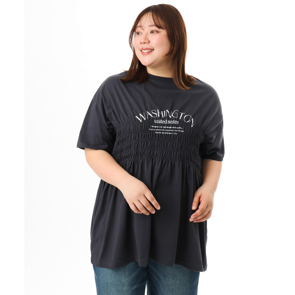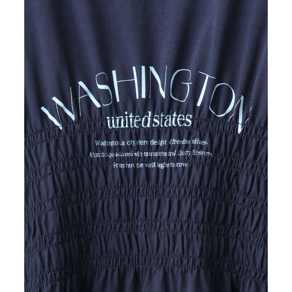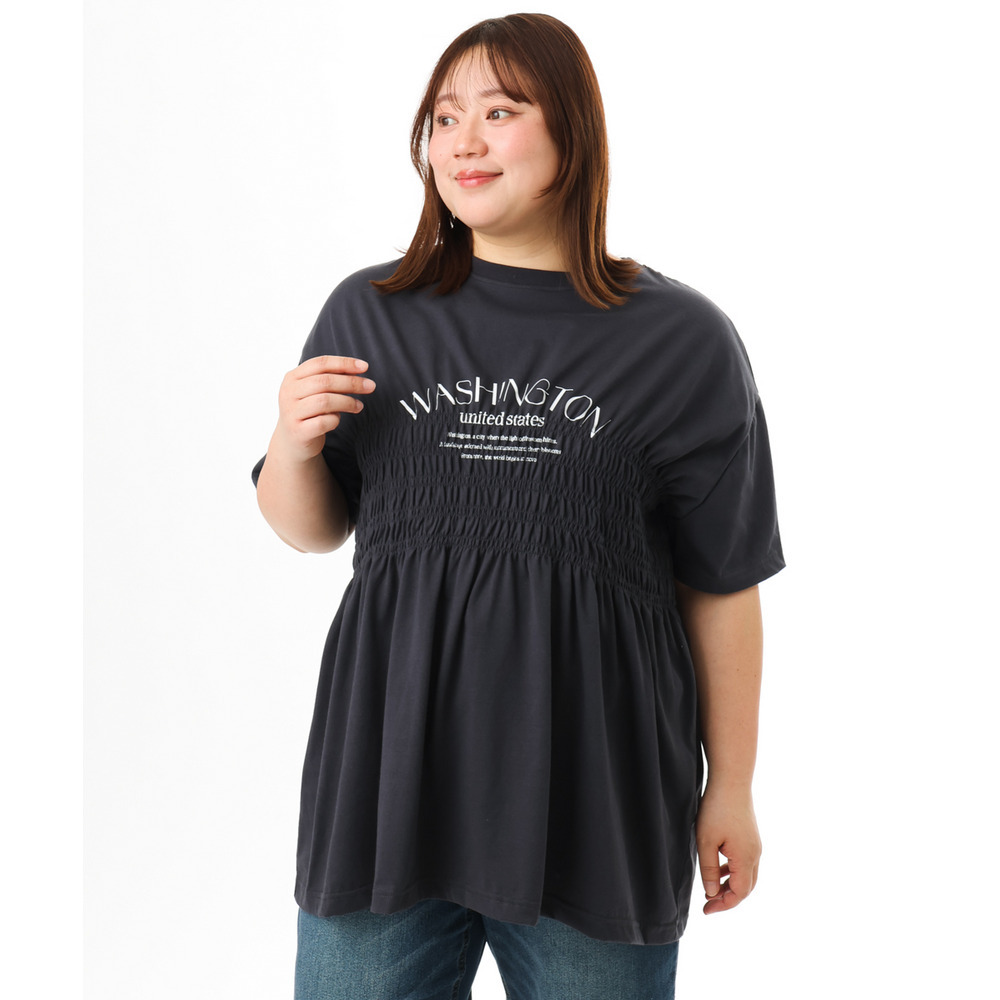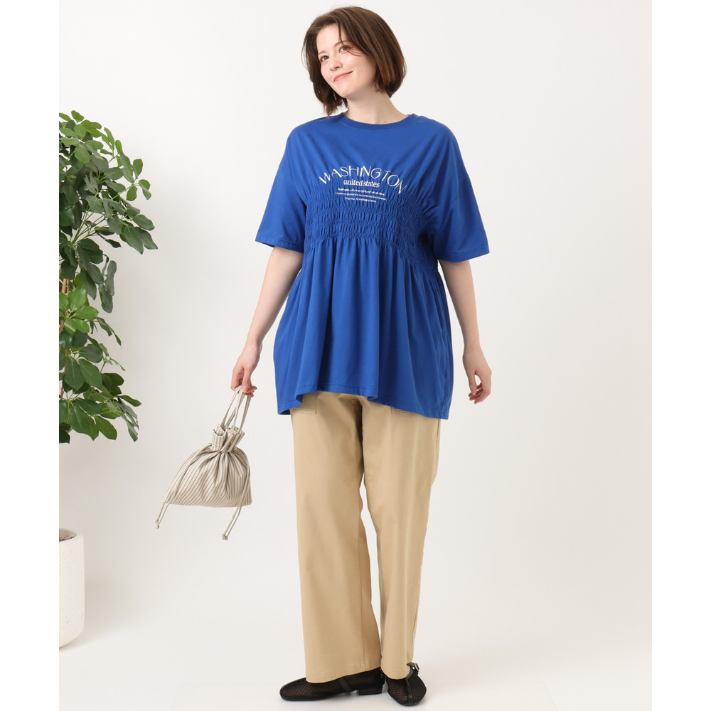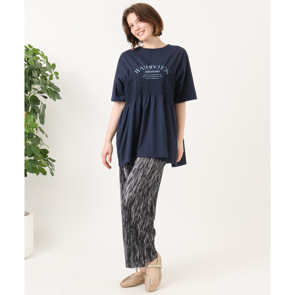 ロゴプリント入りでカジュアルな雰囲気ながら、シャーリングで女性らしいニュアンスをプラス。