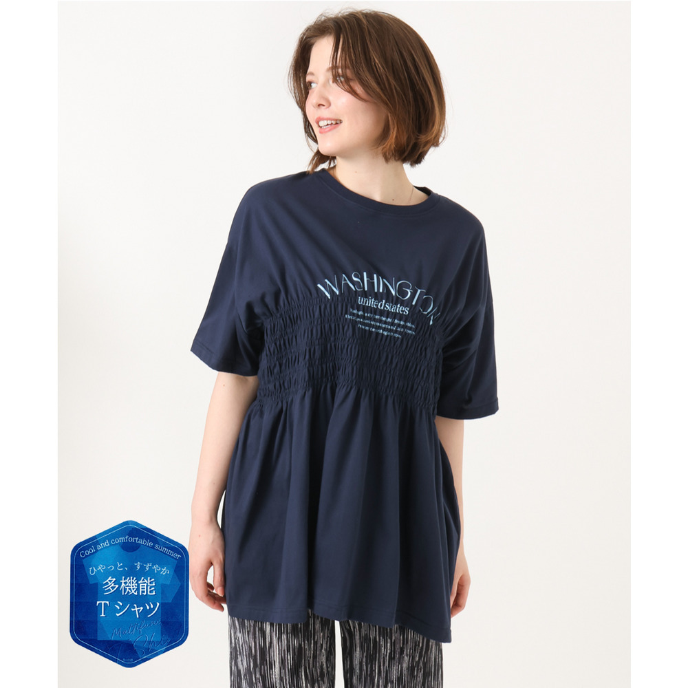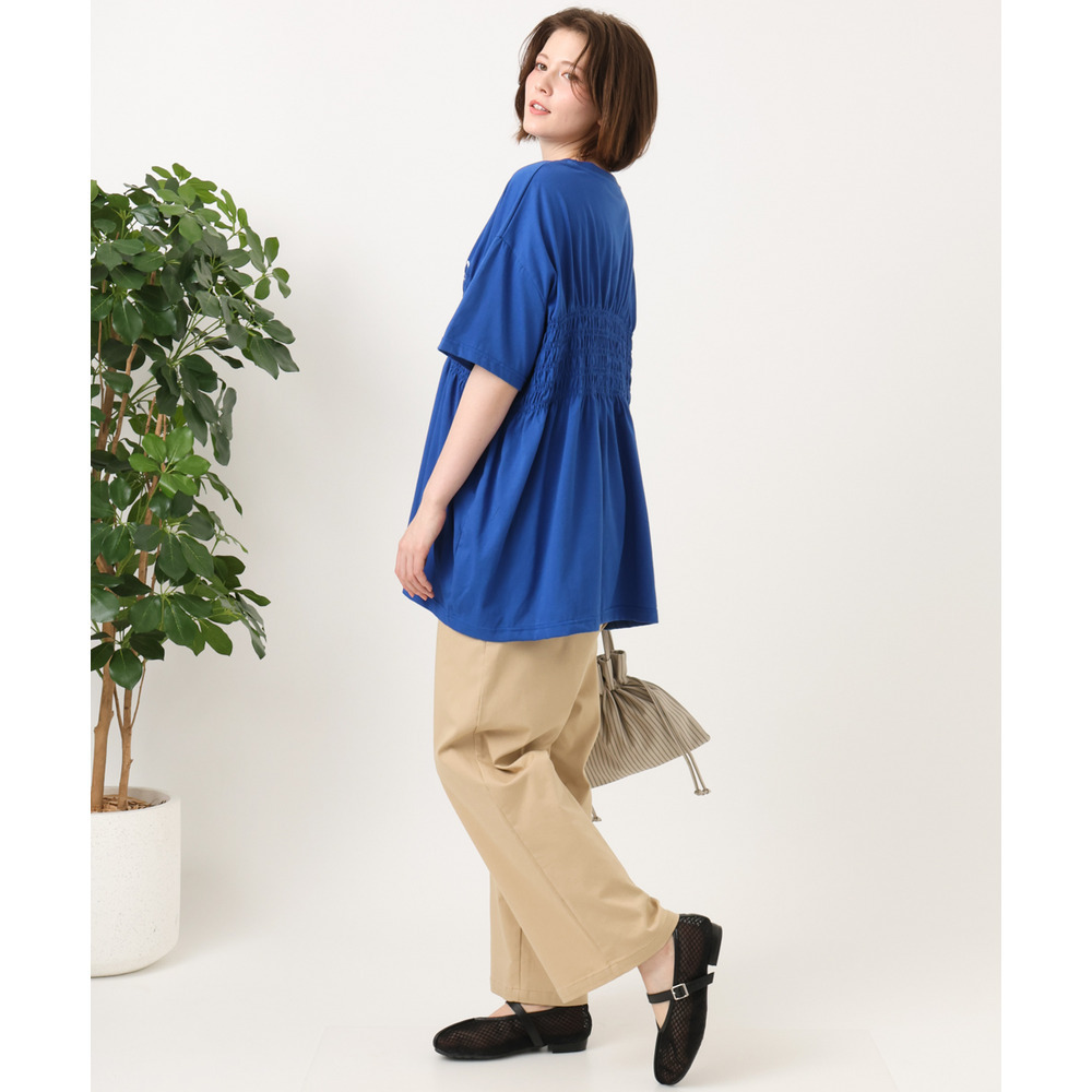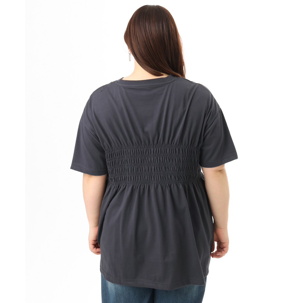 胸元のシャーリングが自然な立体感を生み、スタイルアップ効果も期待できる長め丈のTシャツ。