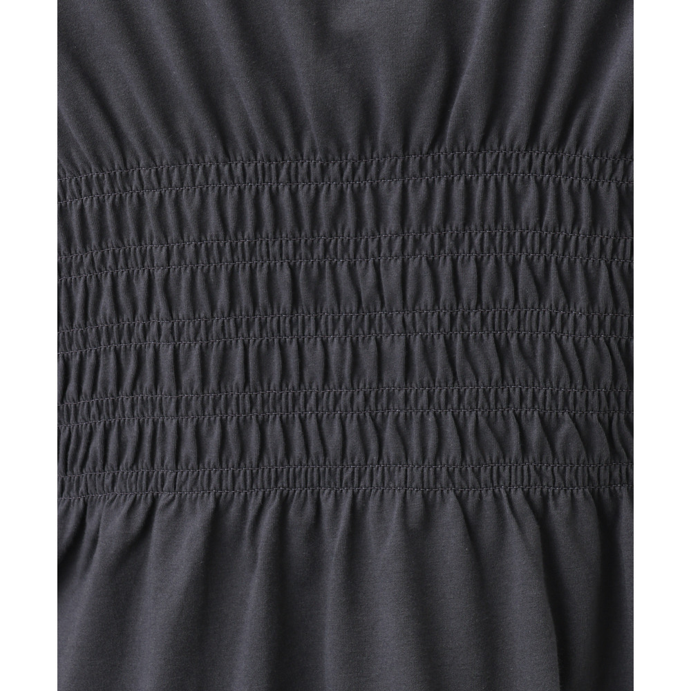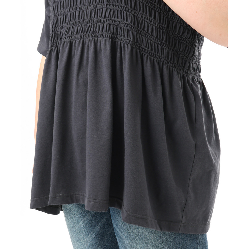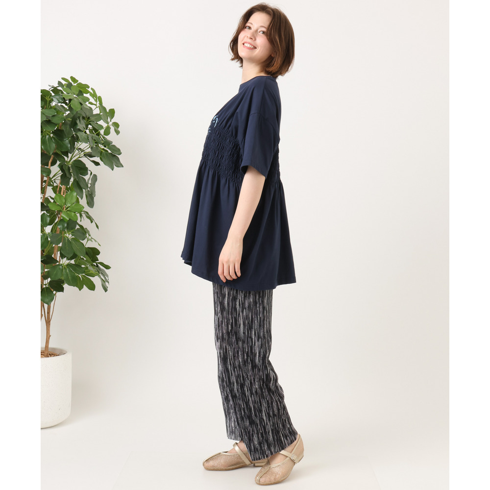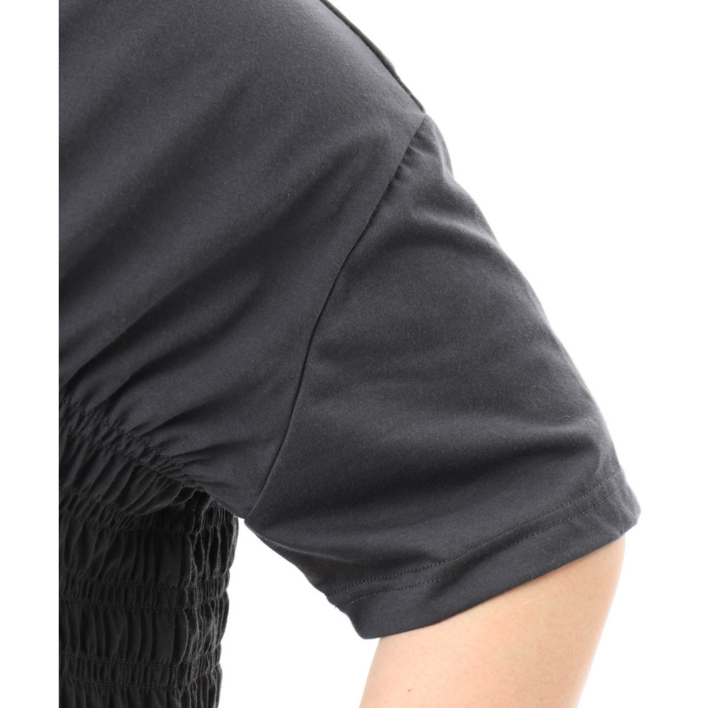 胸元のシャーリングが自然な立体感を生み、スタイルアップ効果も期待できる長め丈のTシャツ。